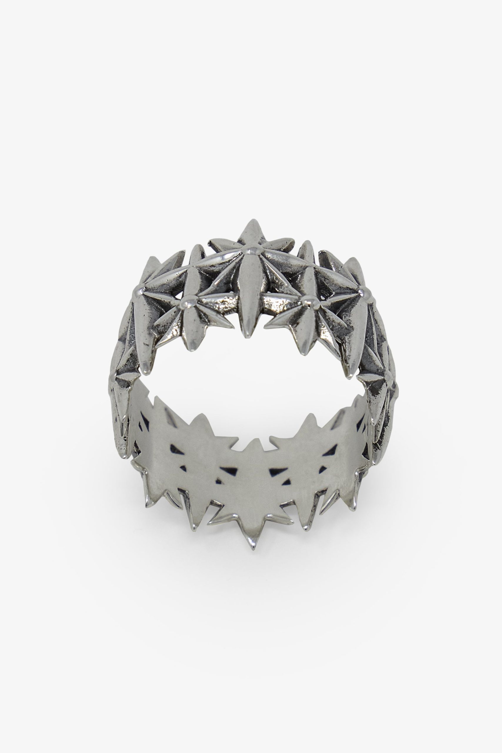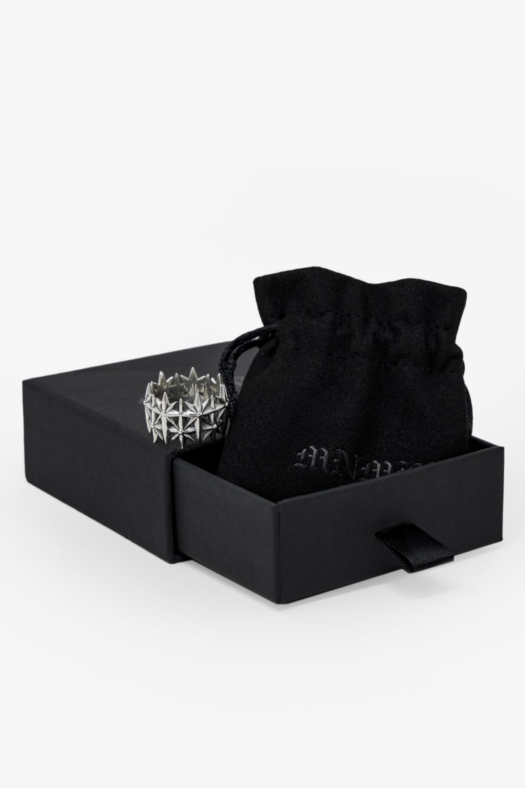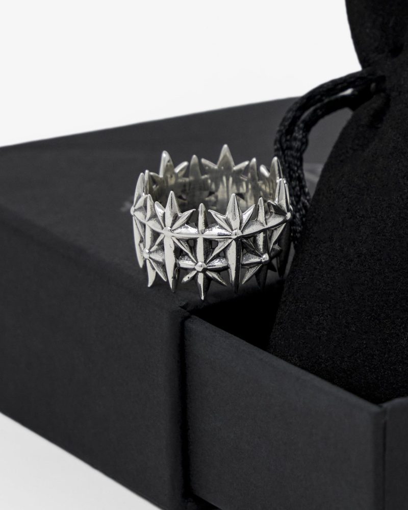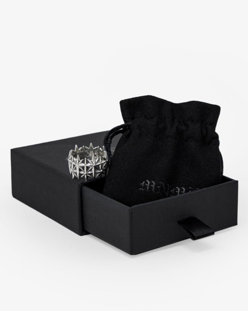 the All Around Star Sterling Silver Ring is a timeless piece crafted from 100% sterling silver. featuring custom molds for a unique design featuring star details on a band shape. The vintage patina adds a touch of classic charm and presented in a custom embossed box and velvet bag.