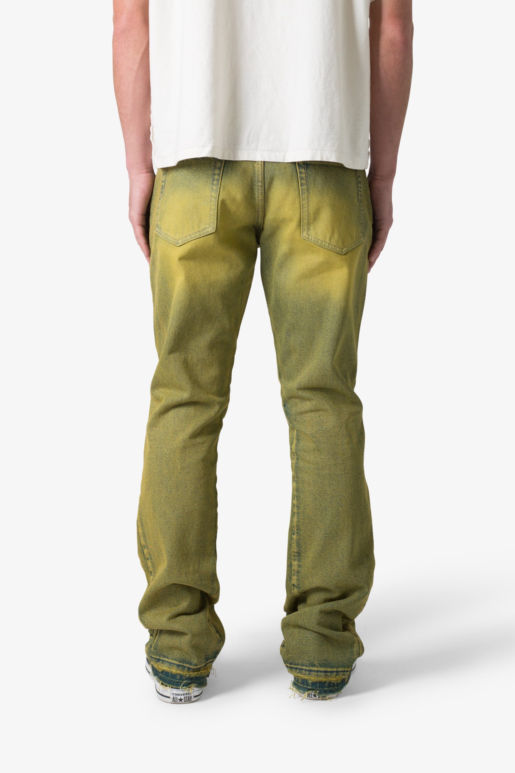 the B540 Flare Denim is designed with our new B fit. which is slim through the thigh with a slight flare at the leg opening and is constructed from gradient bleached denim that is then overdyed in olive. The denim features panelling at the inseam and outseam from self denim for a slight flare and is finished with a deconstructed hem.