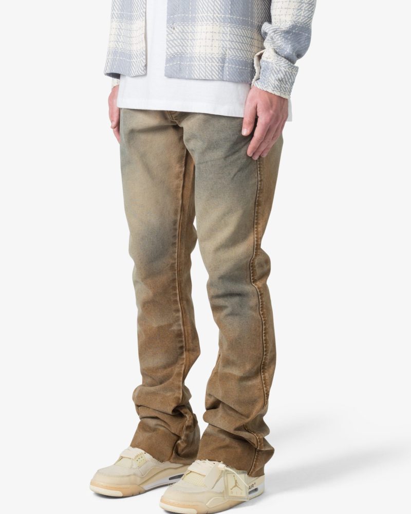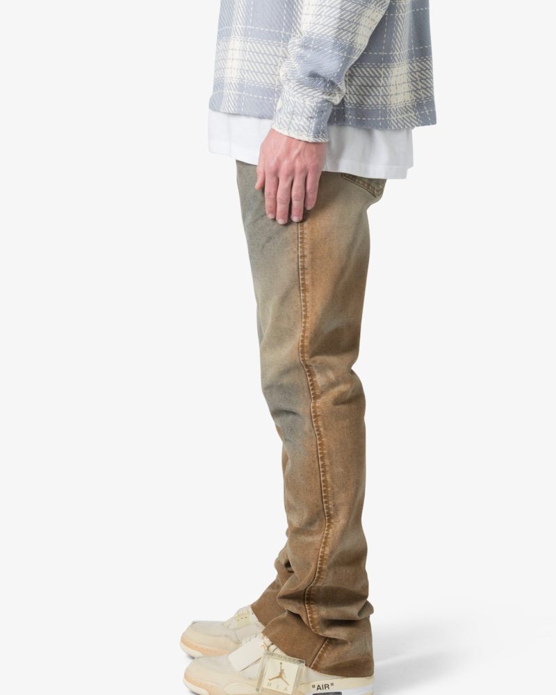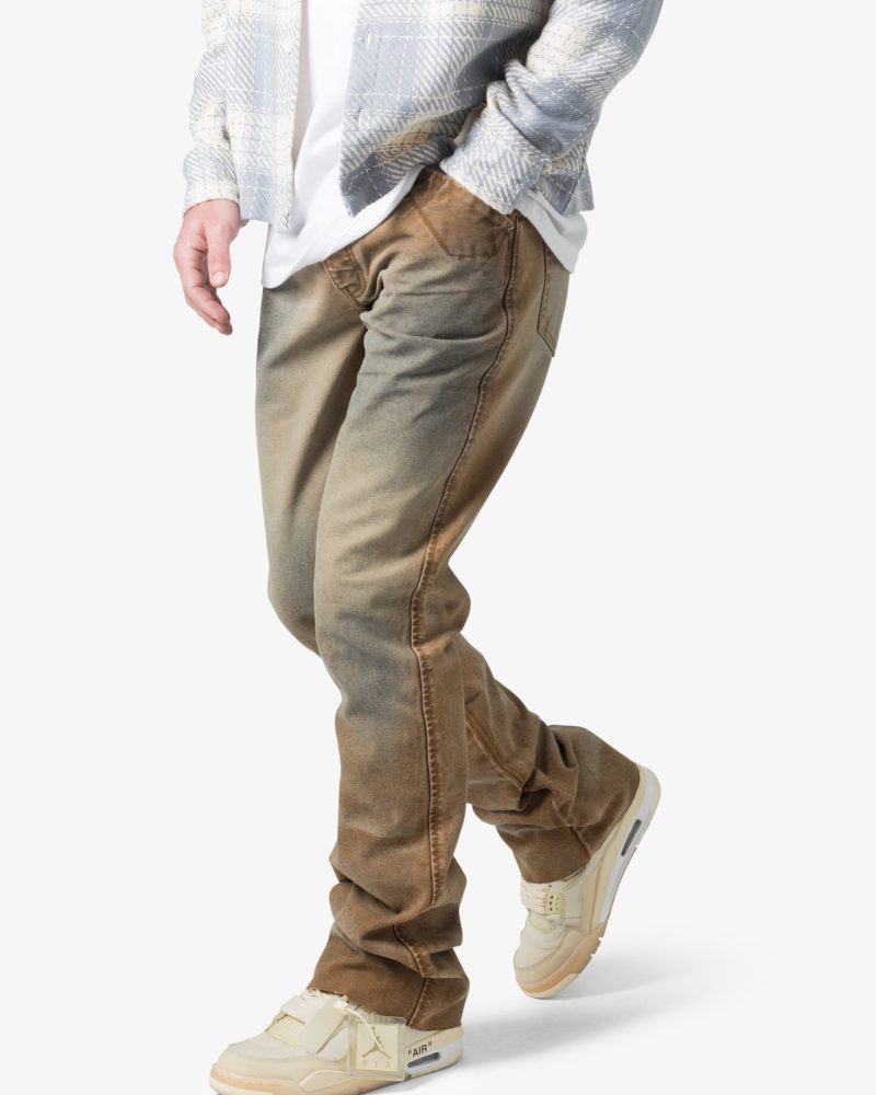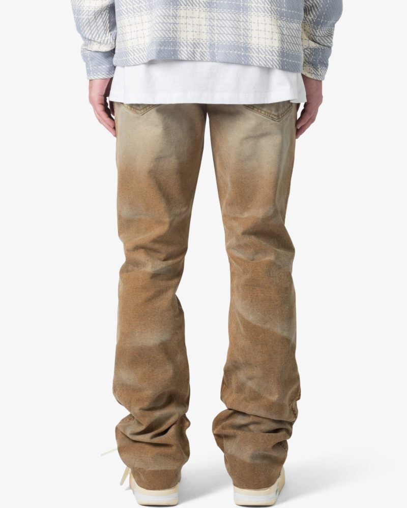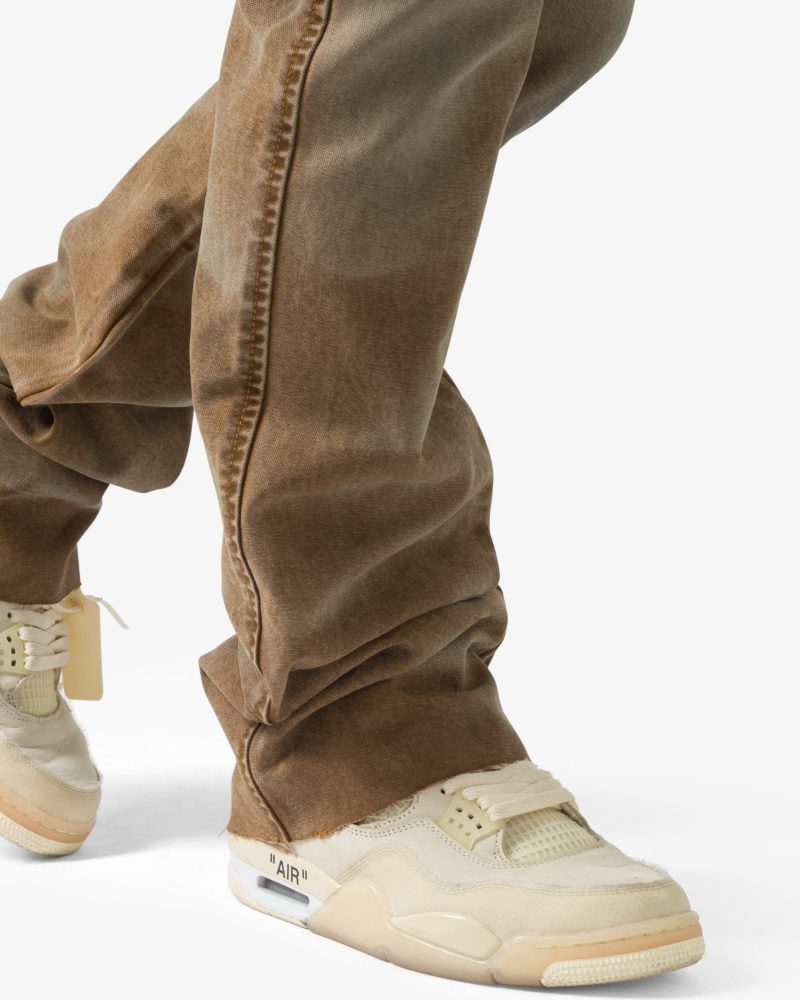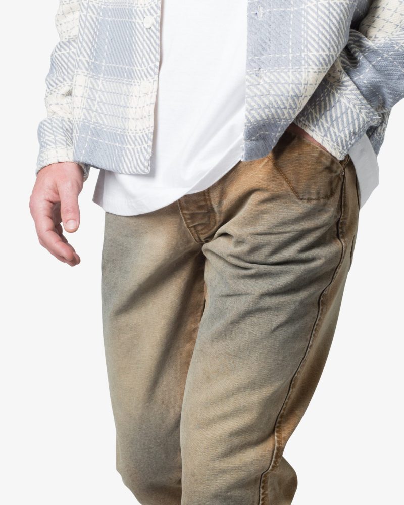 the B643 Flare Burnt Cowboy Denim are designed in our B fit. which is relaxed through the thigh and features a slight flare at the leg opening and is constructed from washed tan work twill. heavy sanding details throughout for a more vintage feel and look. and finished with a traditional hem.