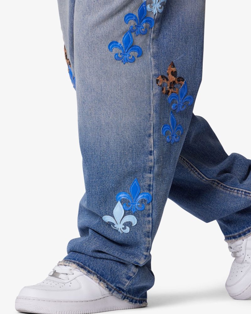 Constructed from 100% cotton denim in a medium blue wash. the Baggy Fleur Denim features a relaxed fit with sanding and light whiskering for a worn-in effect. Distressed leg openings add additional vintage character. while multicolor faux leather fleur de lis appliqués are placed throughout the garment. Finished with a button fly. metal hardware. and classic five-pocket construction.