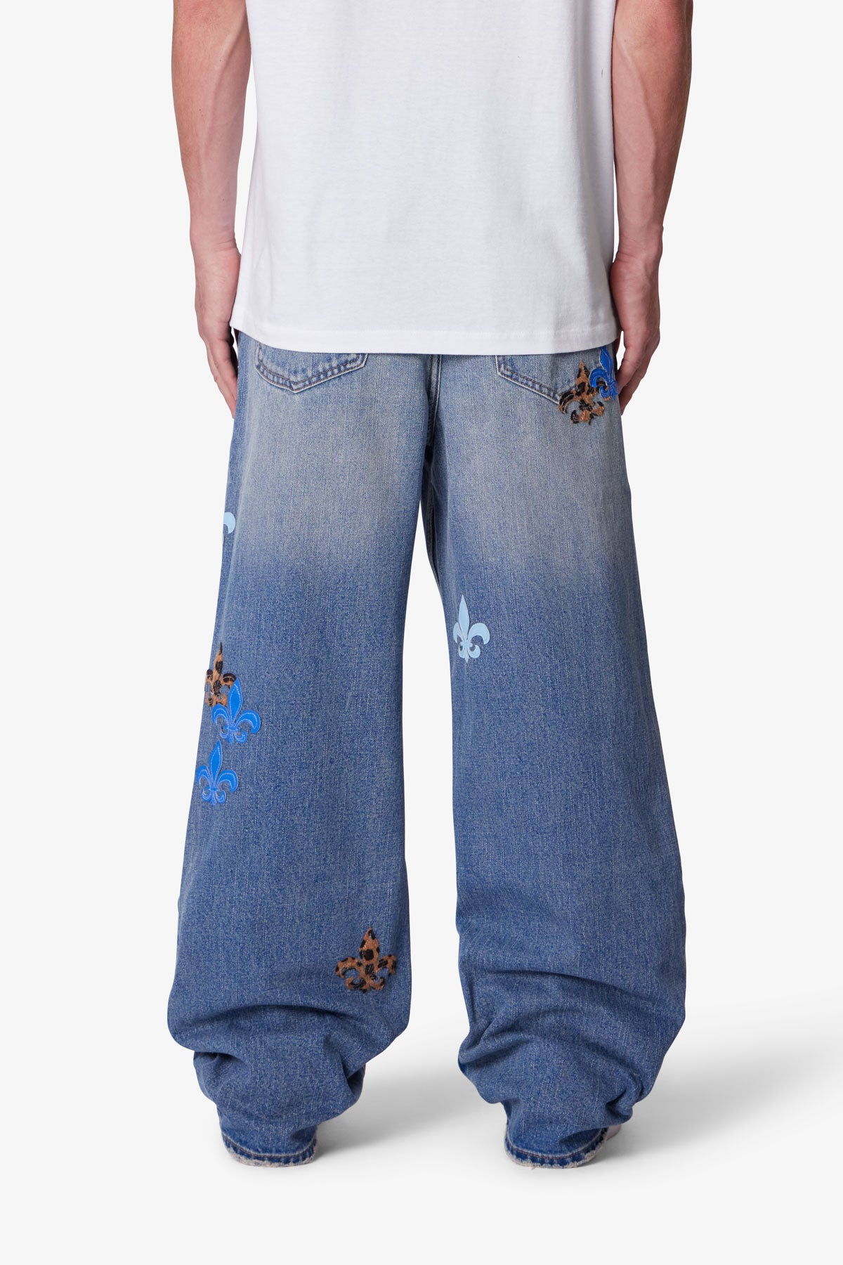 Constructed from 100% cotton denim in a medium blue wash. the Baggy Fleur Denim features a relaxed fit with sanding and light whiskering for a worn-in effect. Distressed leg openings add additional vintage character. while multicolor faux leather fleur de lis appliqués are placed throughout the garment. Finished with a button fly. metal hardware. and classic five-pocket construction.