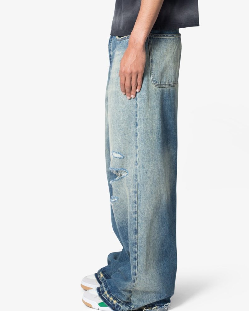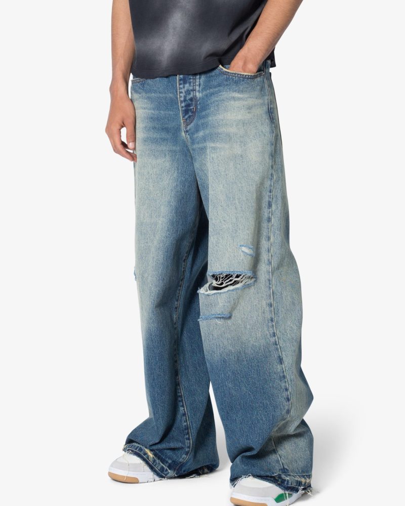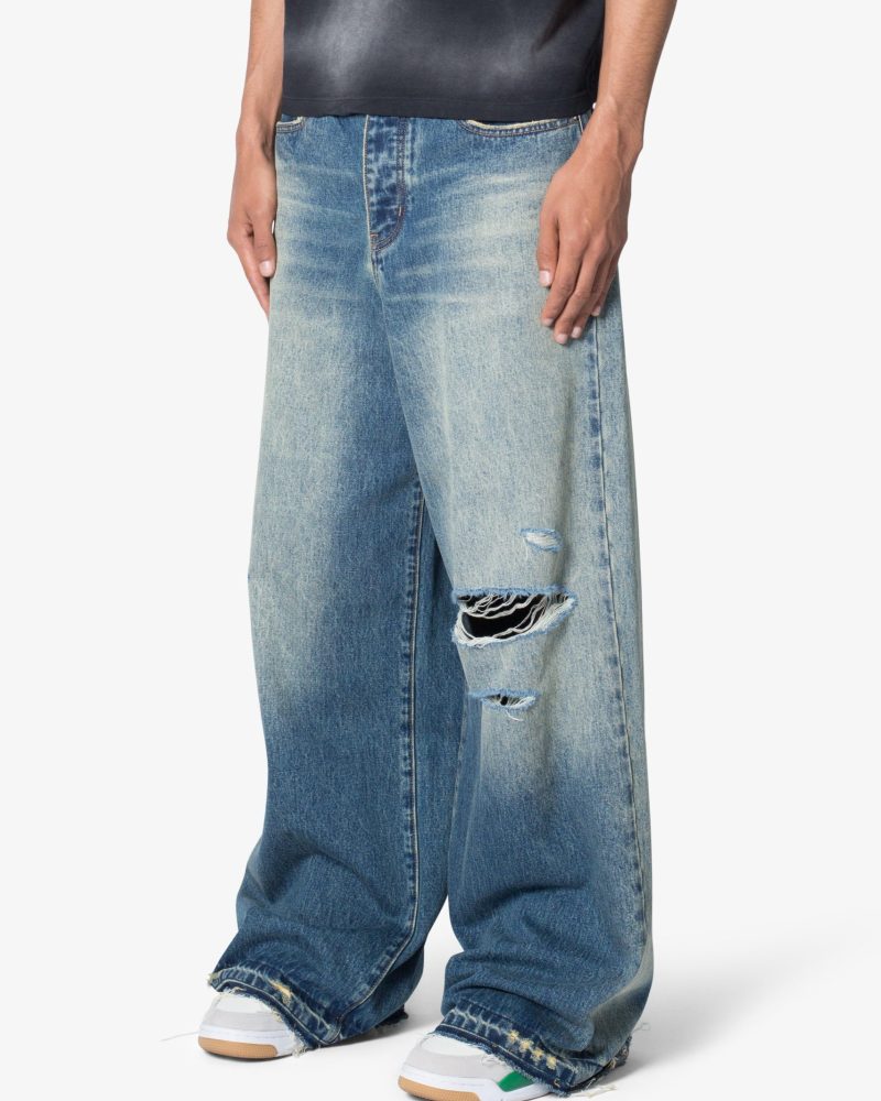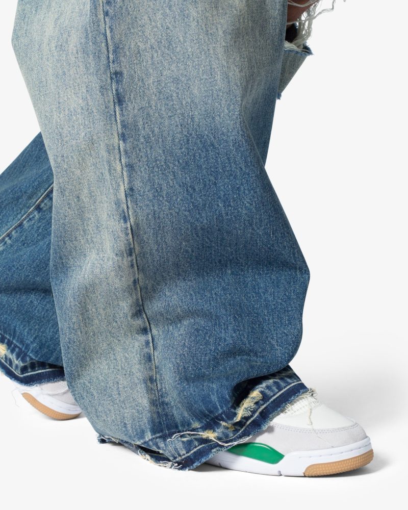 the Baggy Rave Denim are designed with a new oversized rave fit. constructed from a washed denim. distressing throughout. and finished with a deconstructed hem.
