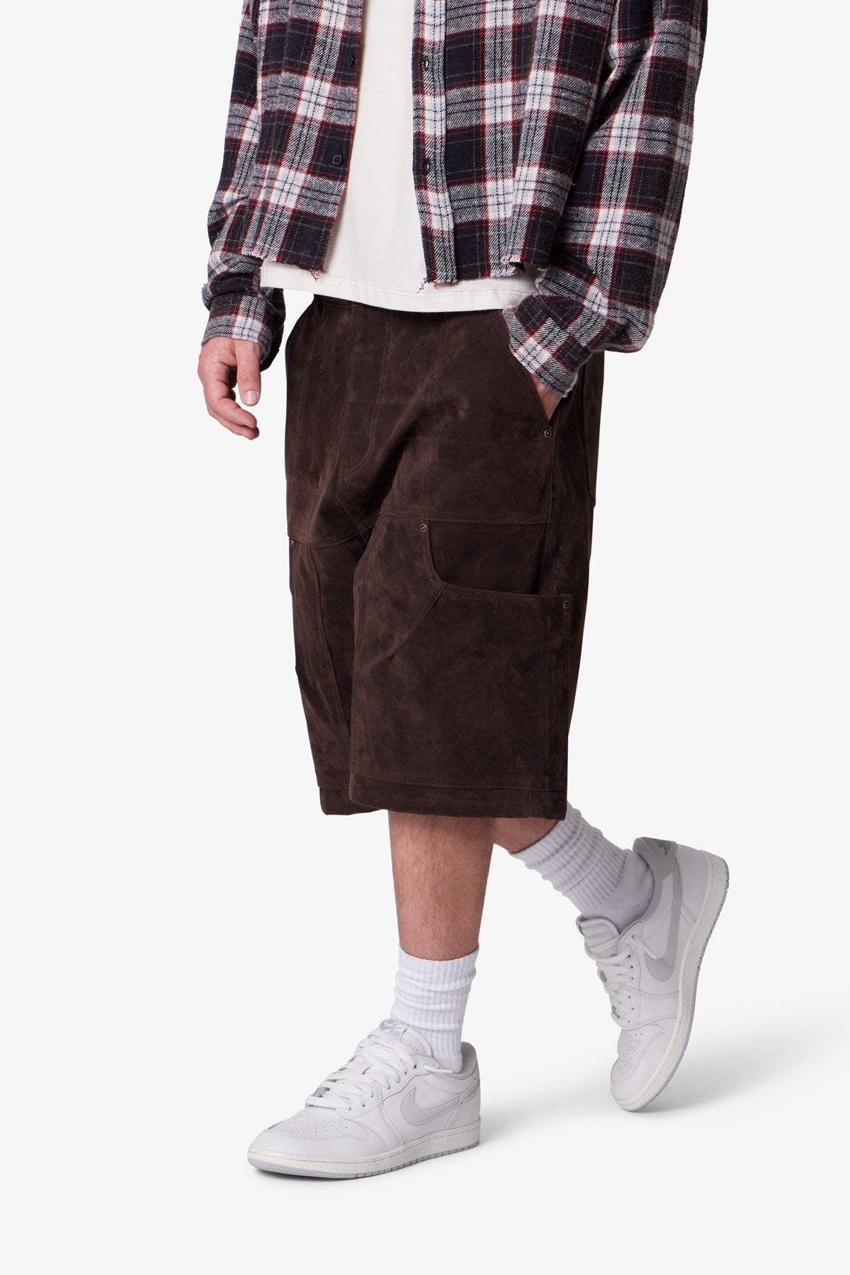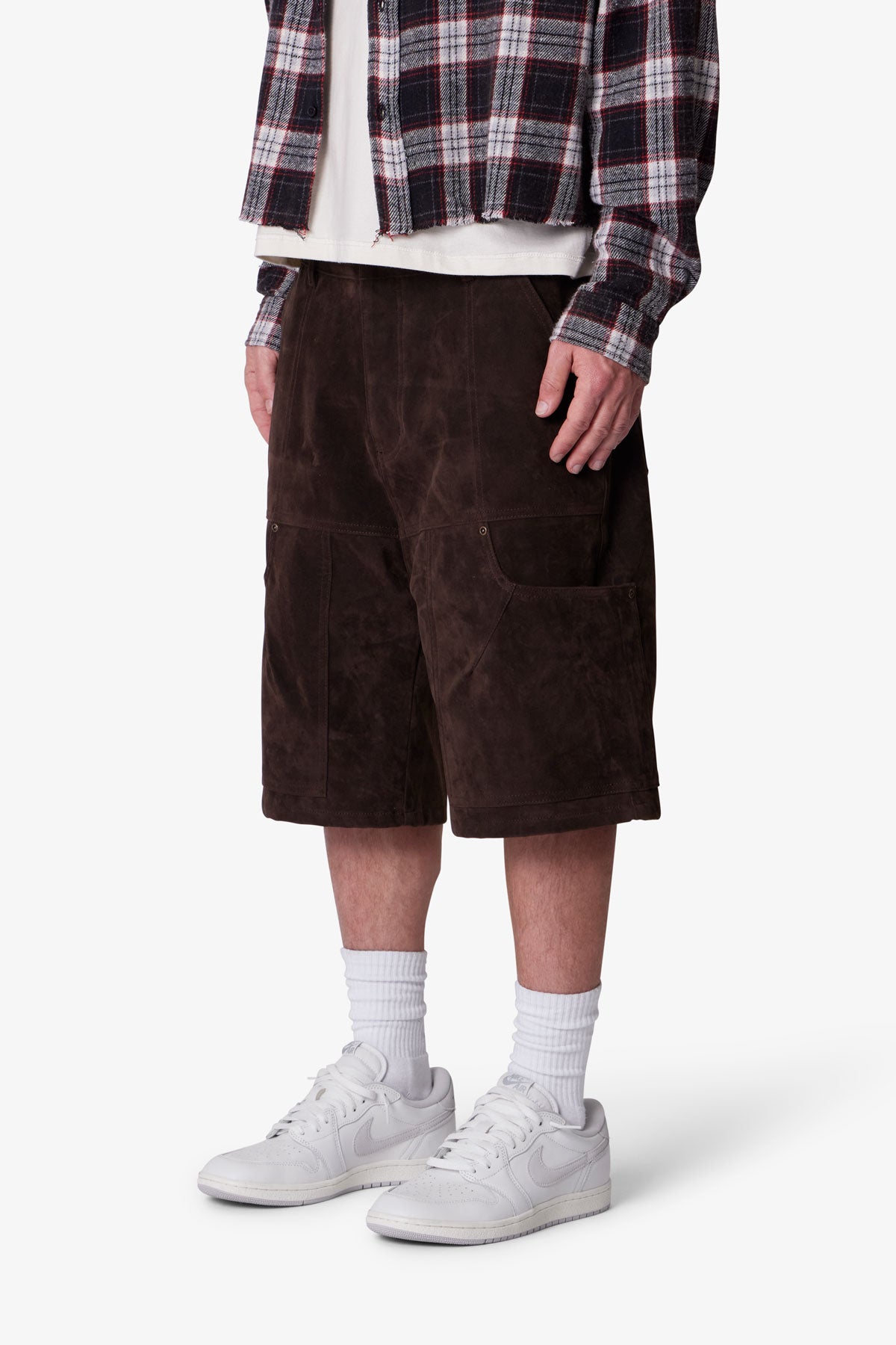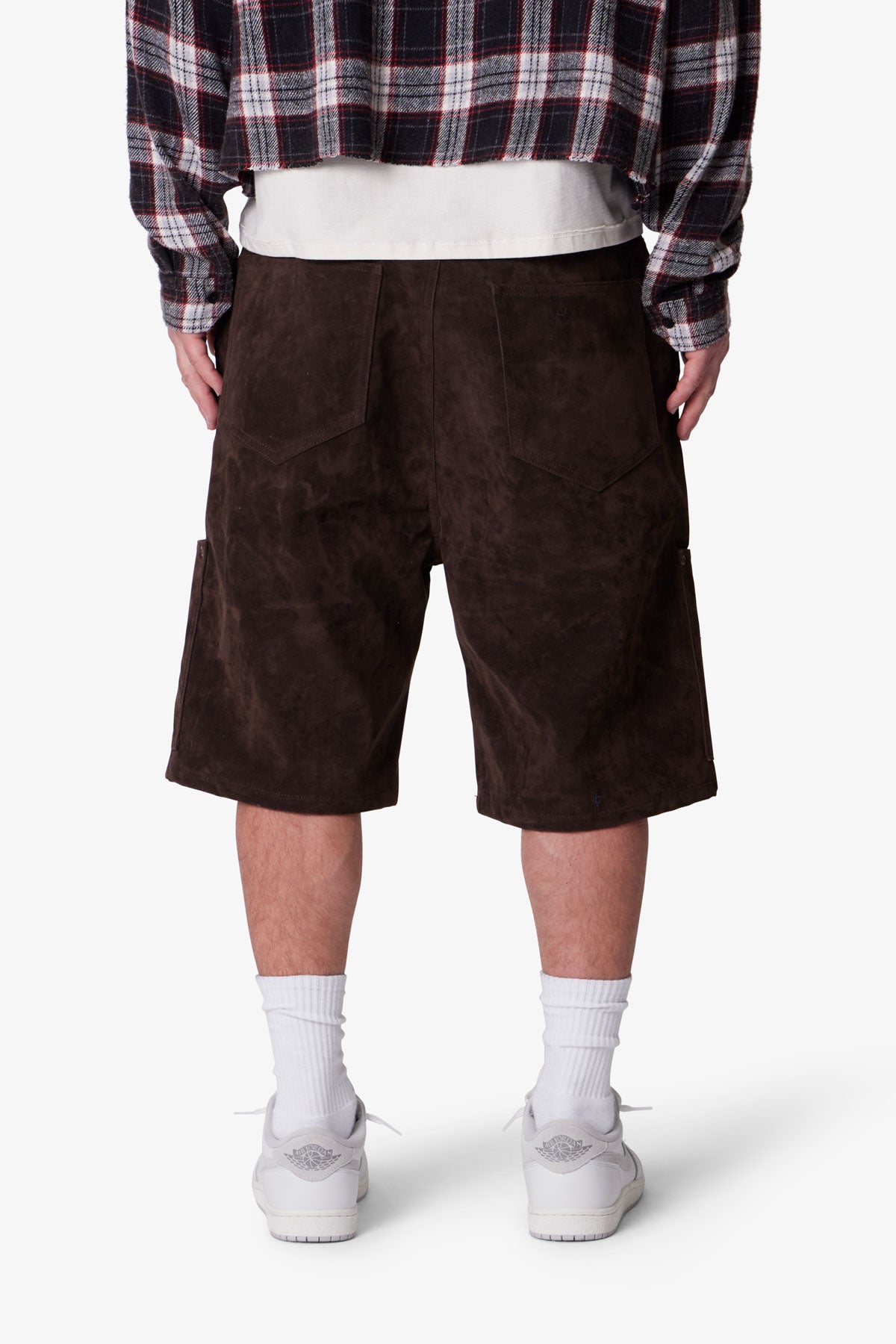 Constructed from 100% polyester faux suede. the Baggy Suede Work Shorts feature a baggy silhouette with utility-inspired design. Built with a multi-panel patchwork construction. the shorts are detailed with topstitching and rivets throughout.