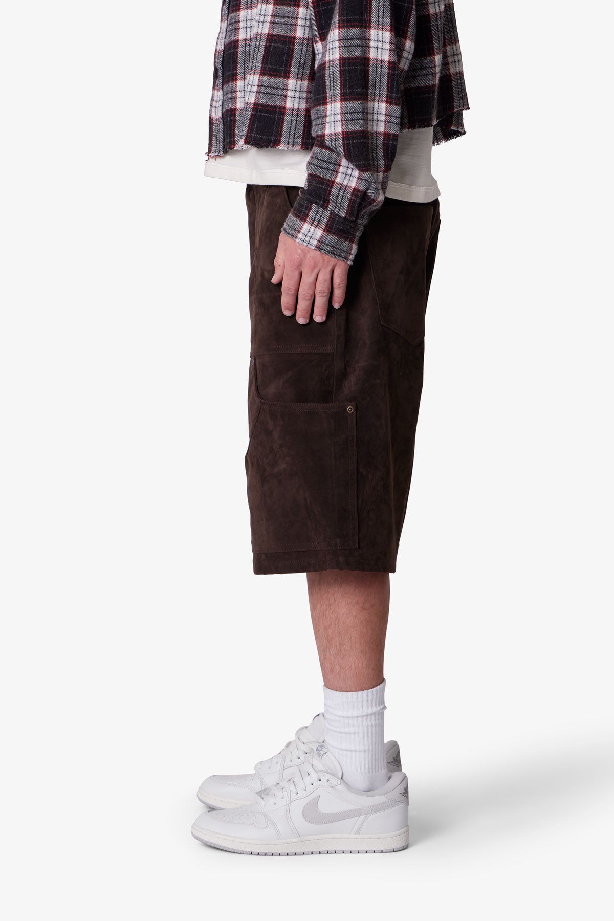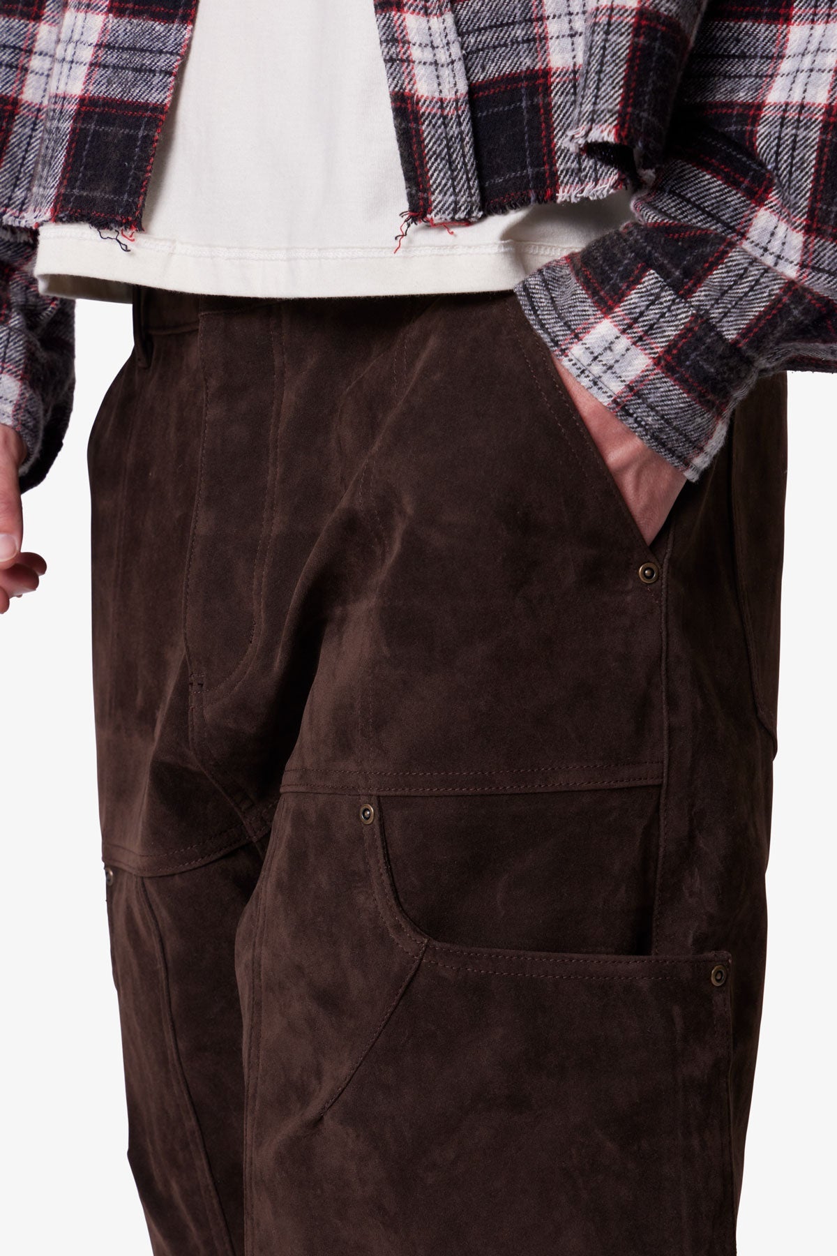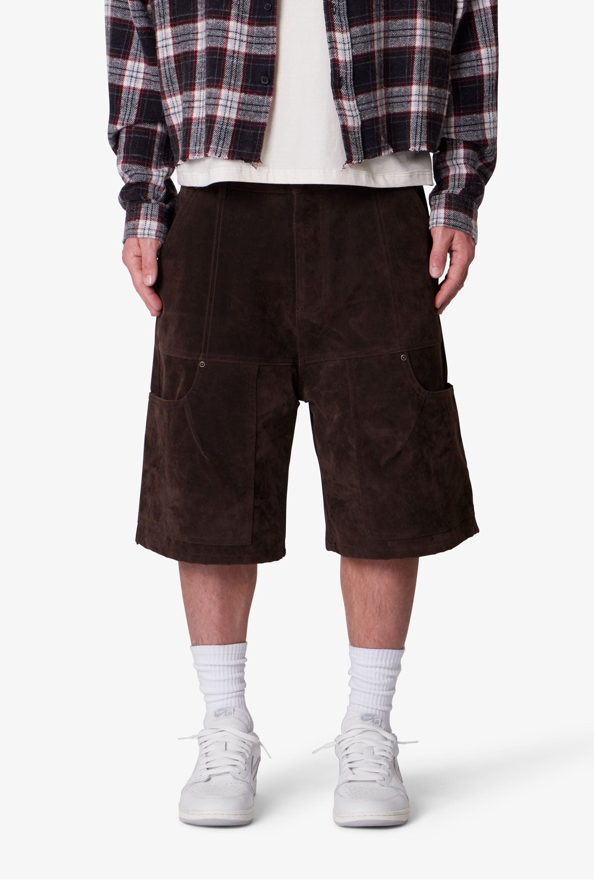 Constructed from 100% polyester faux suede. the Baggy Suede Work Shorts feature a baggy silhouette with utility-inspired design. Built with a multi-panel patchwork construction. the shorts are detailed with topstitching and rivets throughout.