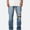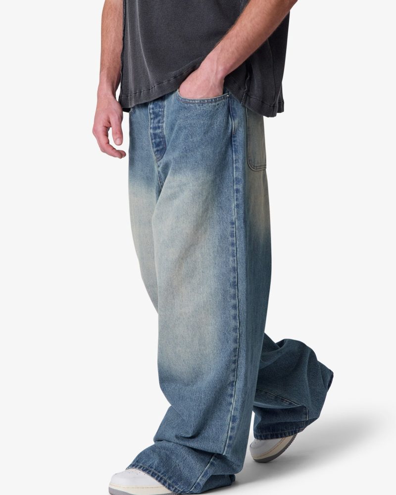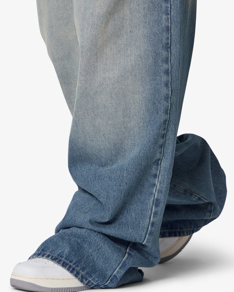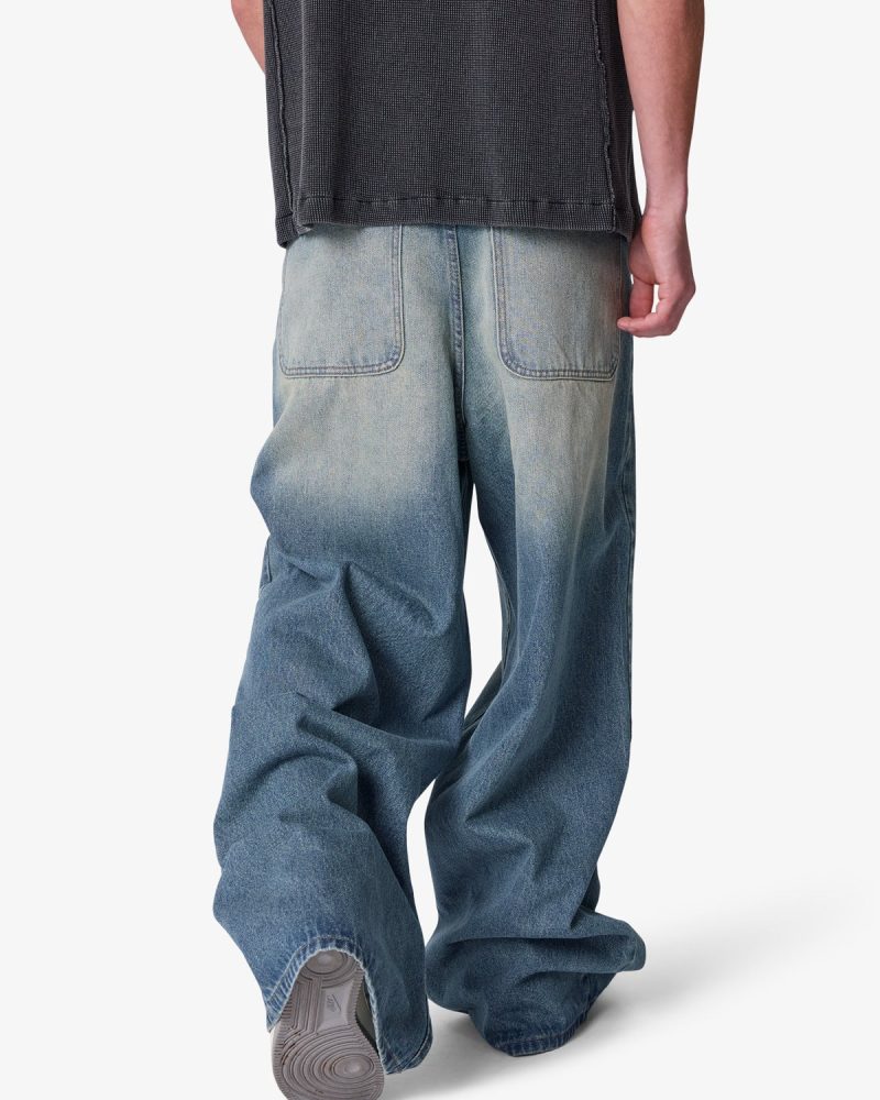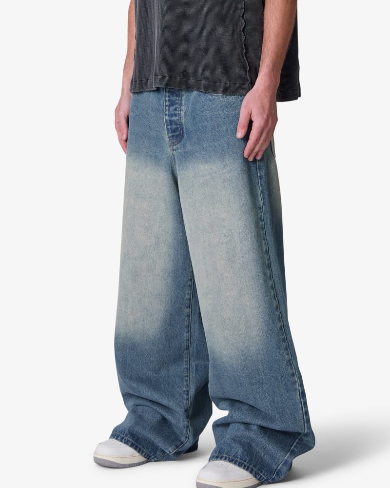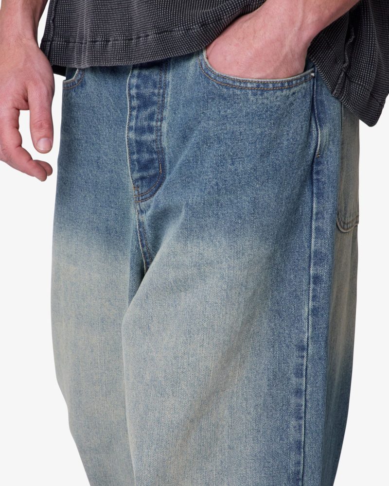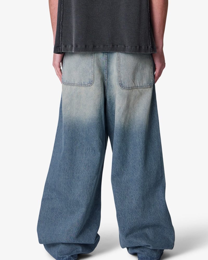the Baggy Washed Rave Denim are designed with a new oversized rave fit. constructed from a vintage washed indigo denim. traditional 5 pocket denim details. and finished with a deconstructed hem.