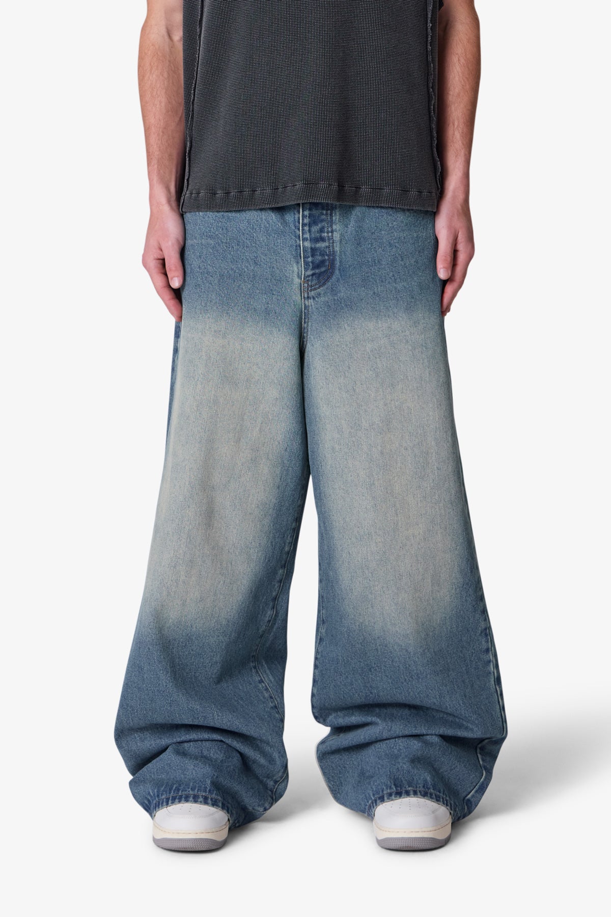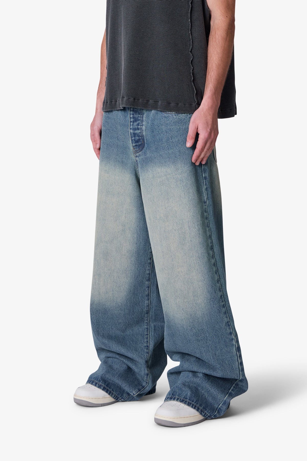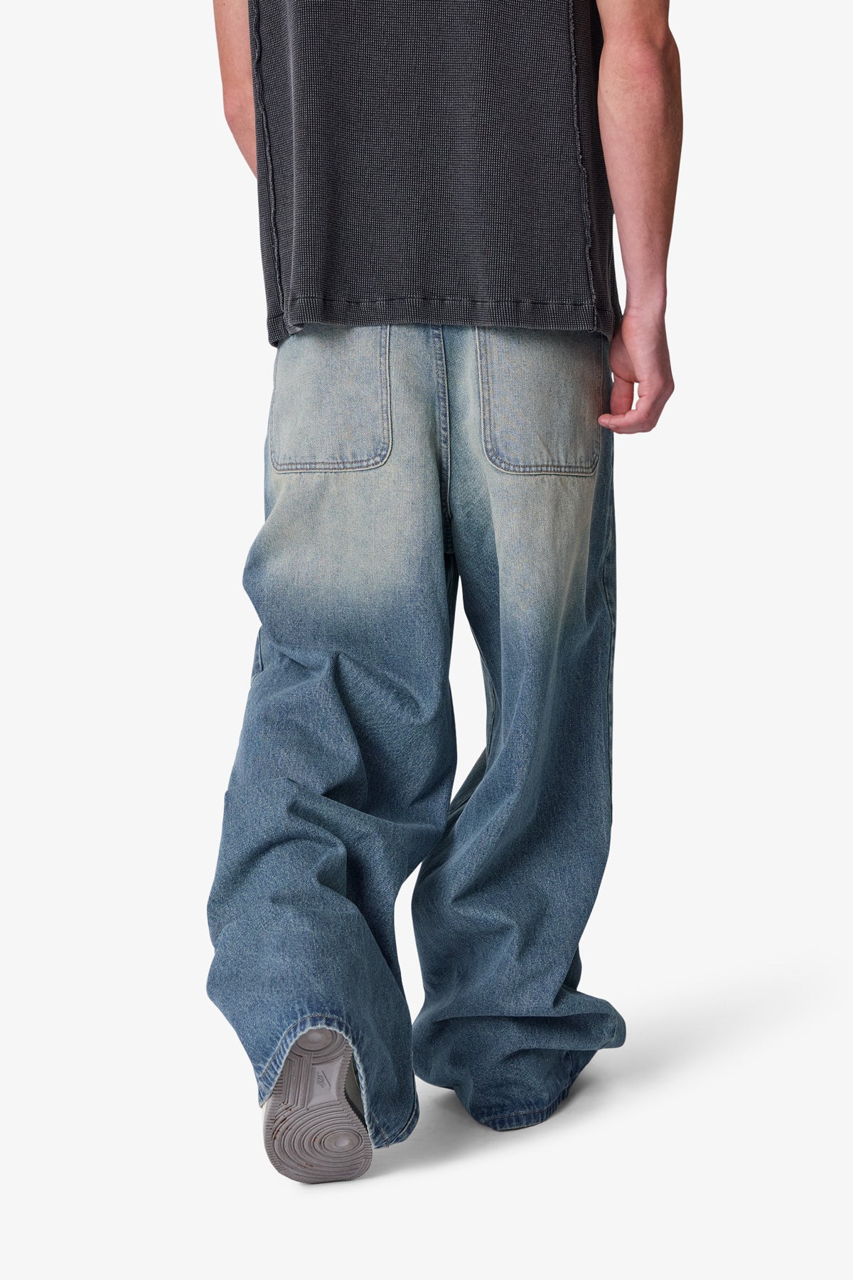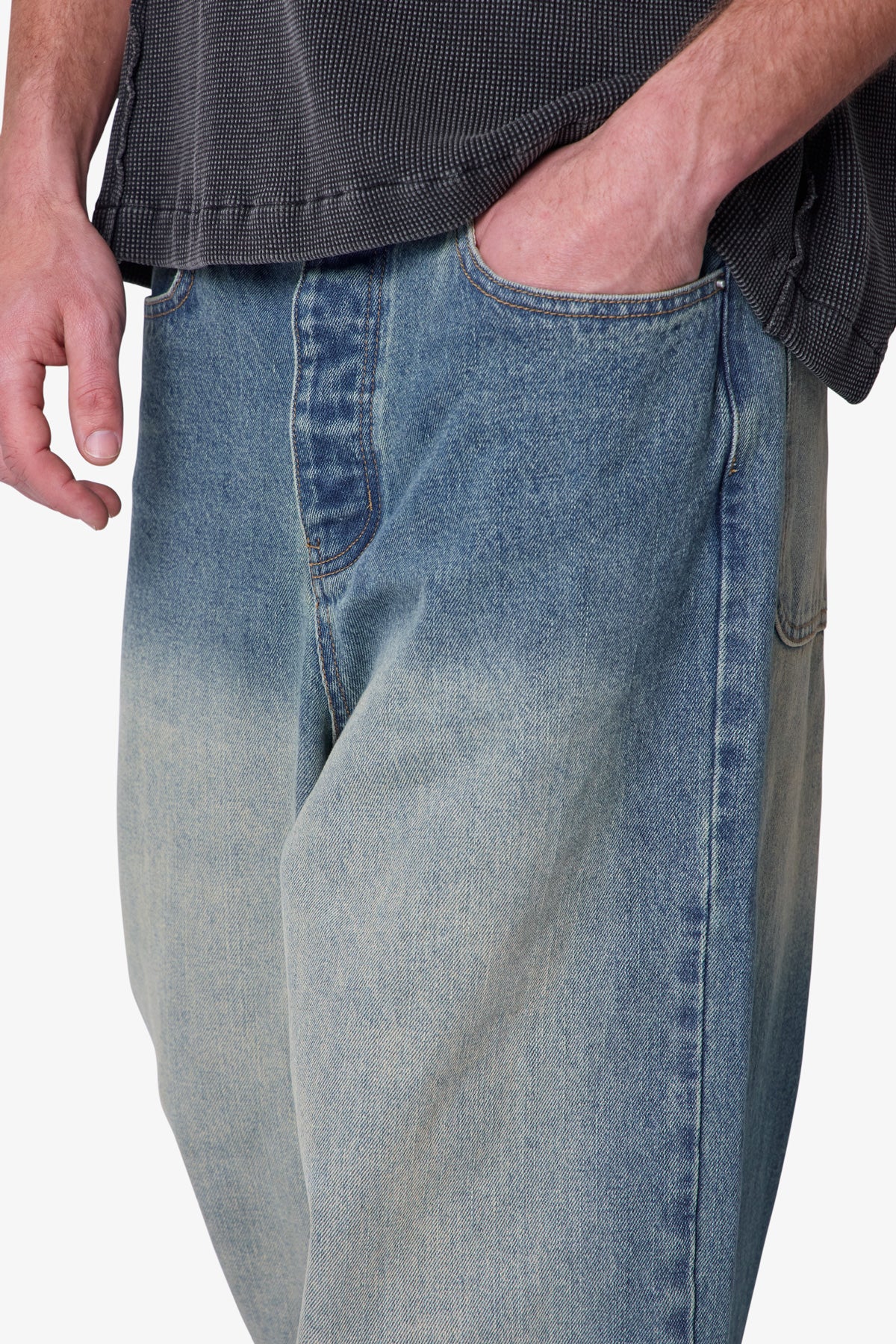 the Baggy Washed Rave Denim are designed with a new oversized rave fit. constructed from a vintage washed indigo denim. traditional 5 pocket denim details. and finished with a deconstructed hem.
