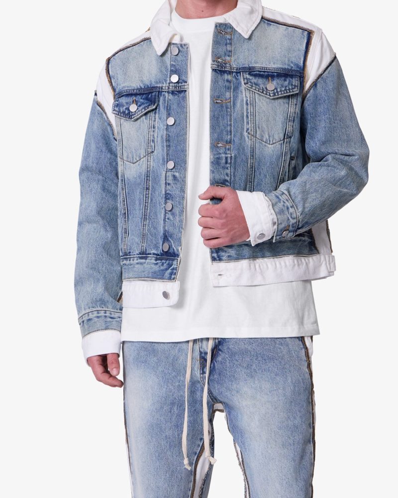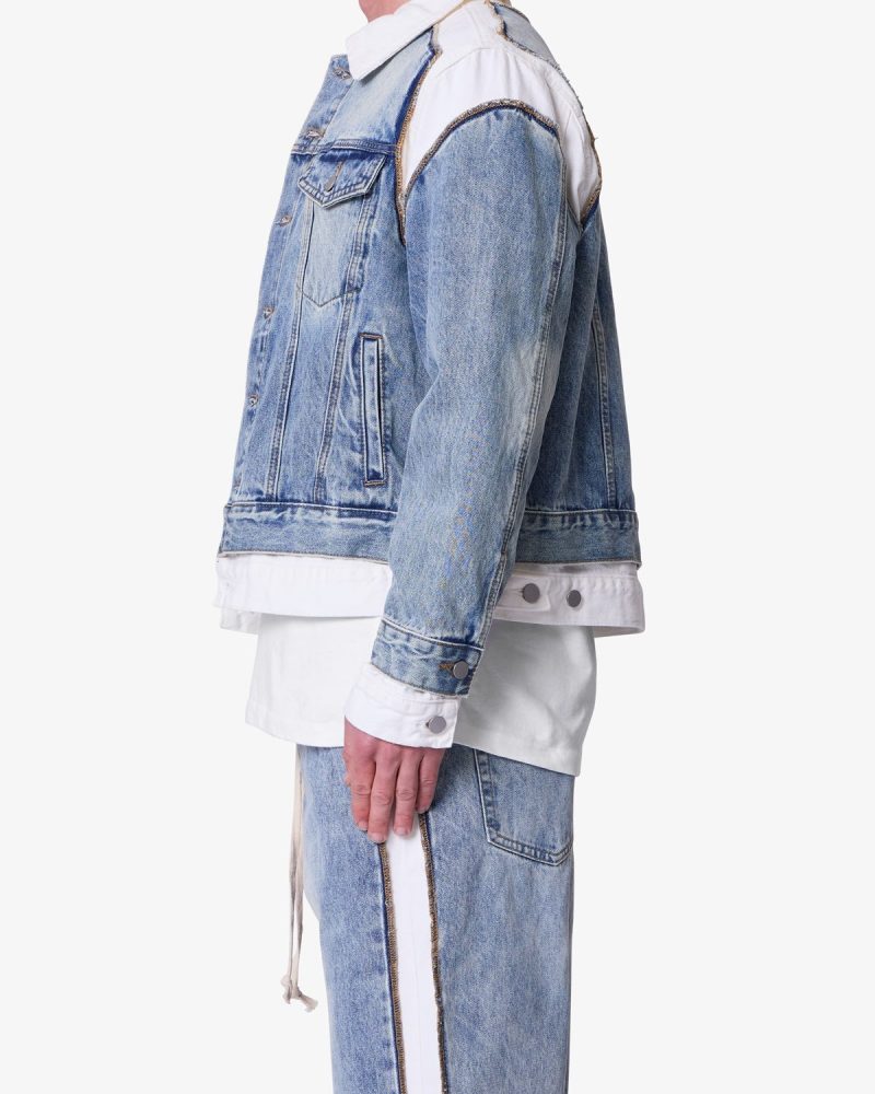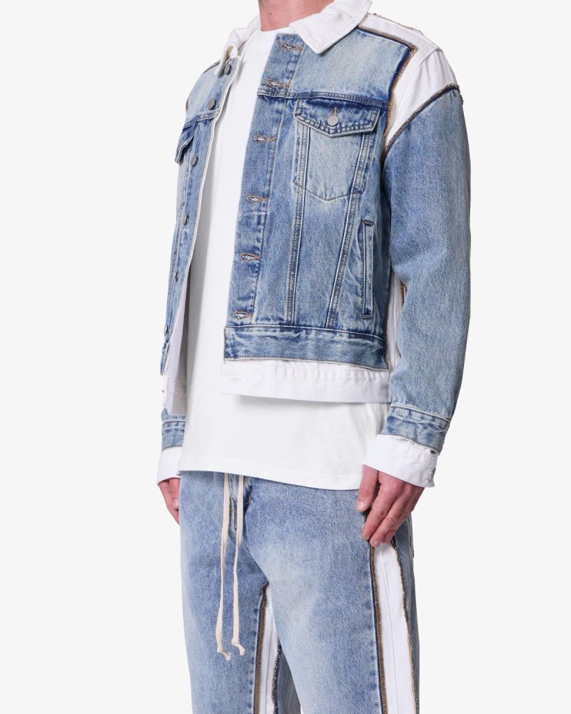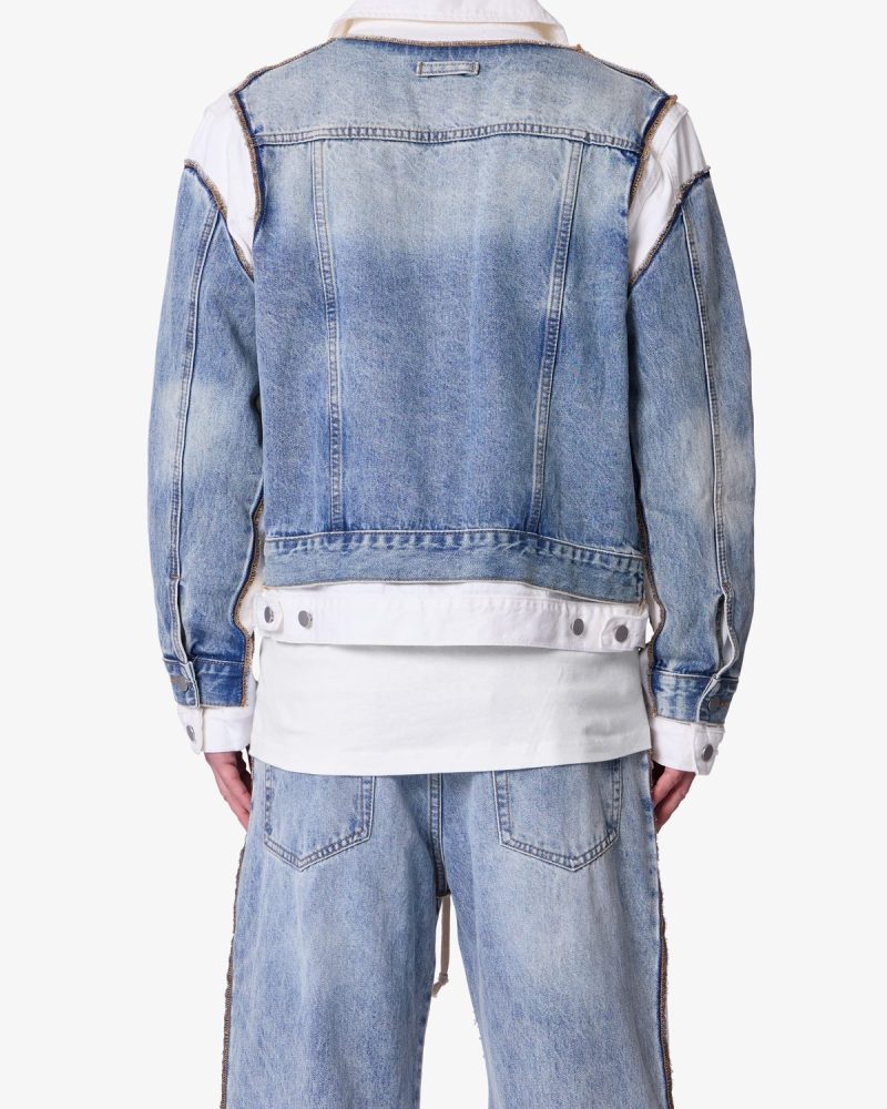The Border GN8 Jacket is a reconstructed denim jacket made from 100% cotton in a light blue wash. Designed with a relaxed fit. it features a contrast collar. contrast shoulder paneling. a double layer hem. and exposed seam detailing. The Border GN8 Jacket maintains the structure of a standard denim jacket with updated construction elements.