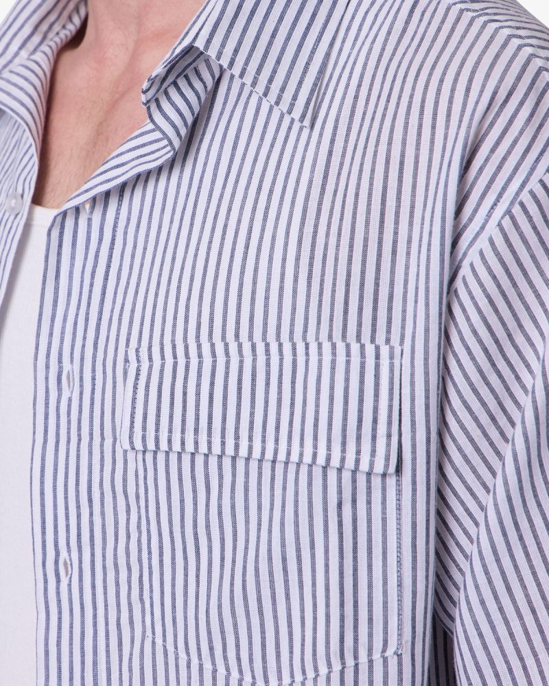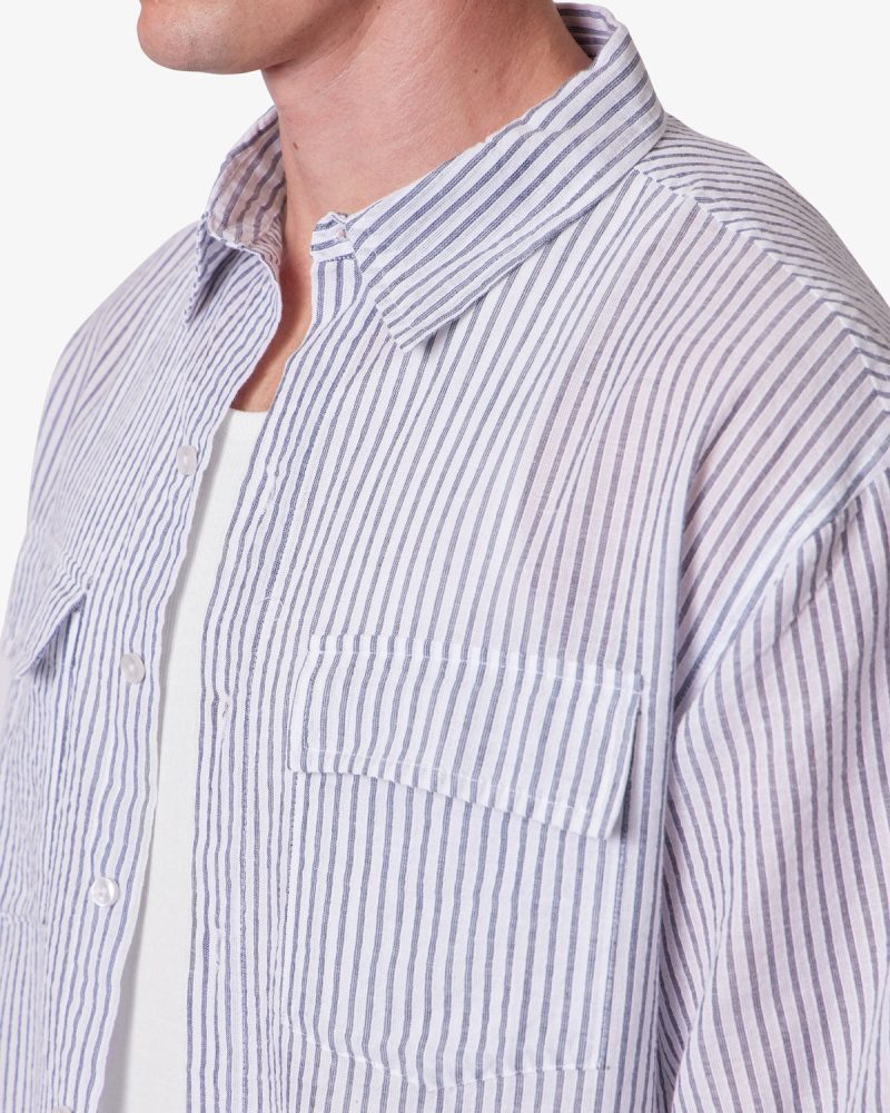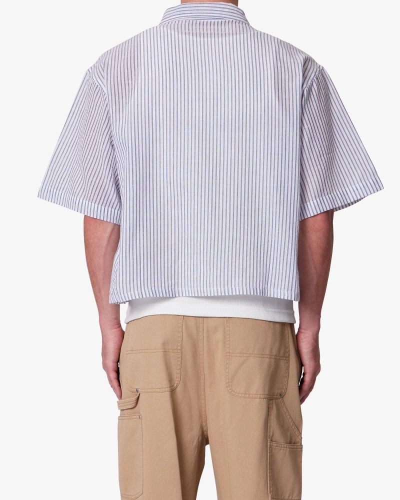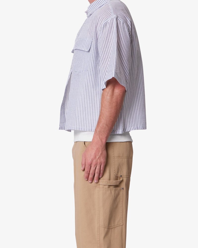 Constructed from 100% cotton. this short sleeve shirt features a cropped length and a boxy silhouette. Designed with dropped shoulders and wide sleeve openings. it includes a classic spread collar and dual chest patch pockets with flap closures. The tonal vertical stripe pattern is achieved through alternating ribbed textures on a lightly brushed woven fabric. Finished with a front button closure.