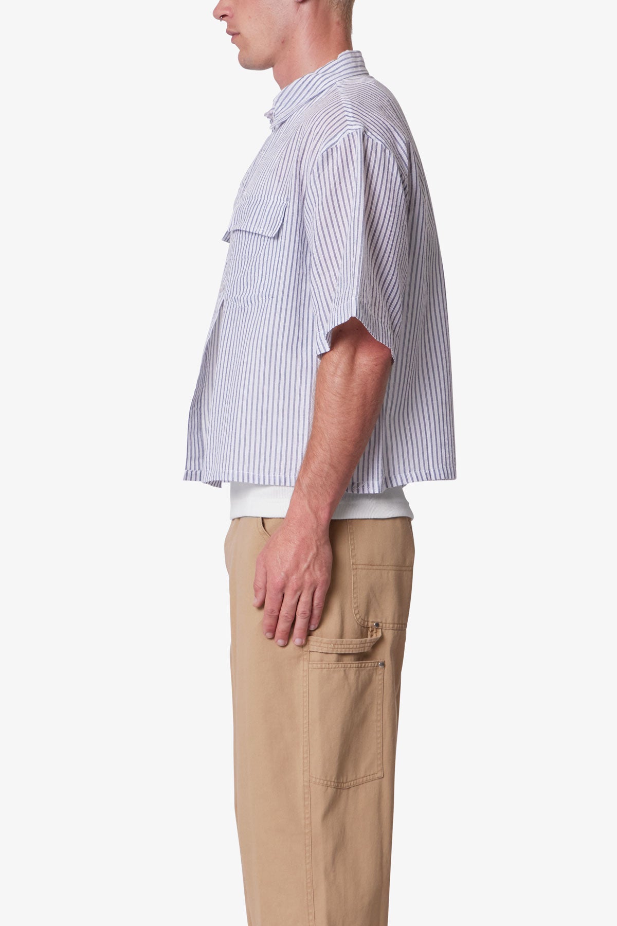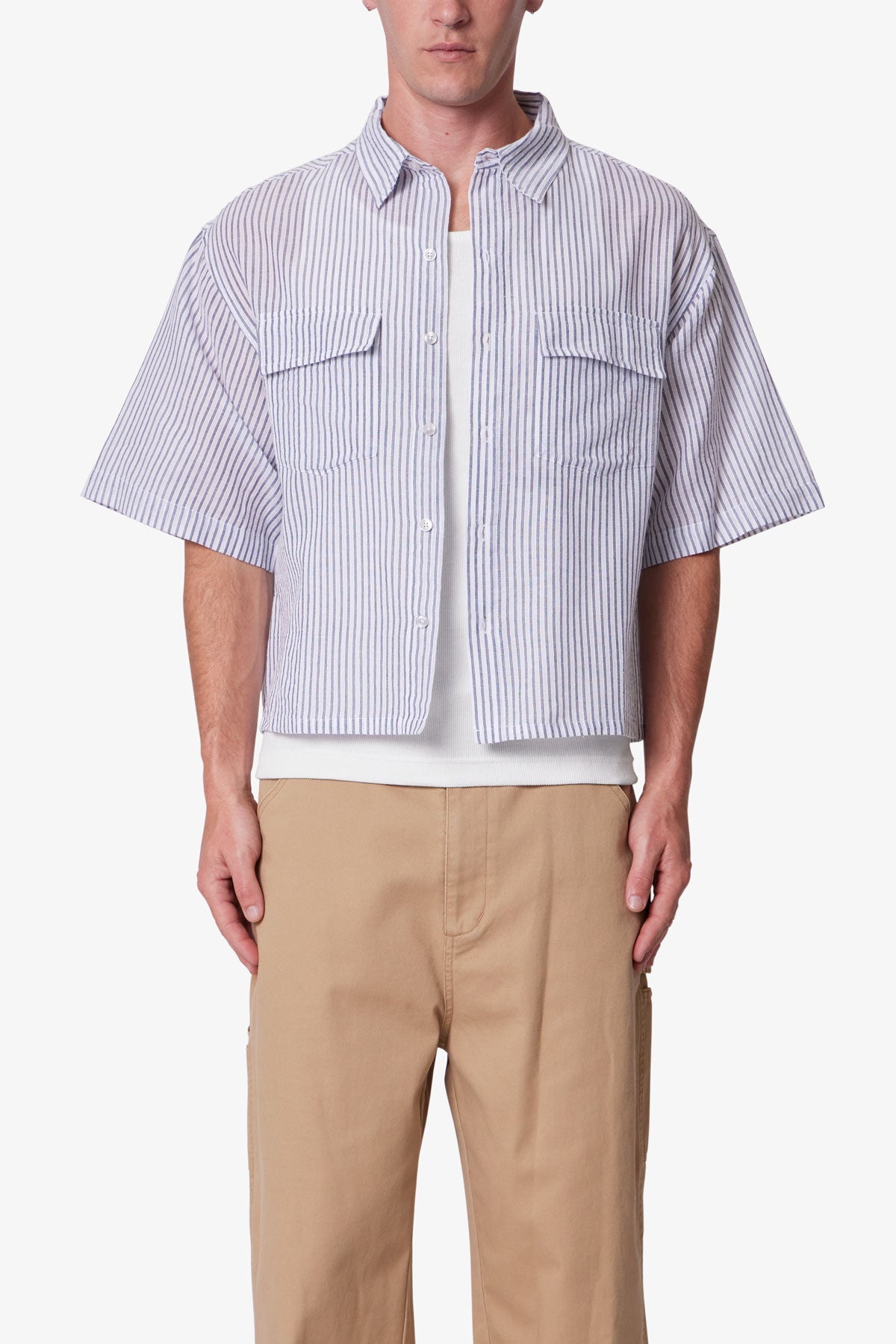 Constructed from 100% cotton. this short sleeve shirt features a cropped length and a boxy silhouette. Designed with dropped shoulders and wide sleeve openings. it includes a classic spread collar and dual chest patch pockets with flap closures. The tonal vertical stripe pattern is achieved through alternating ribbed textures on a lightly brushed woven fabric. Finished with a front button closure.