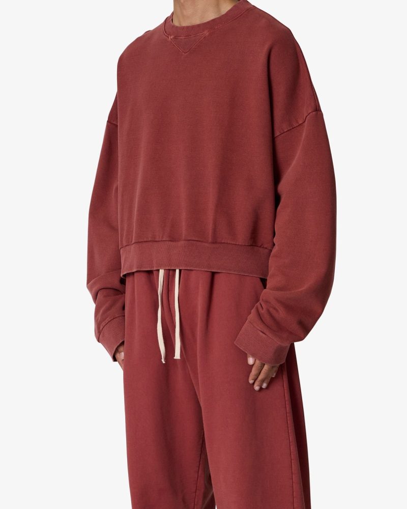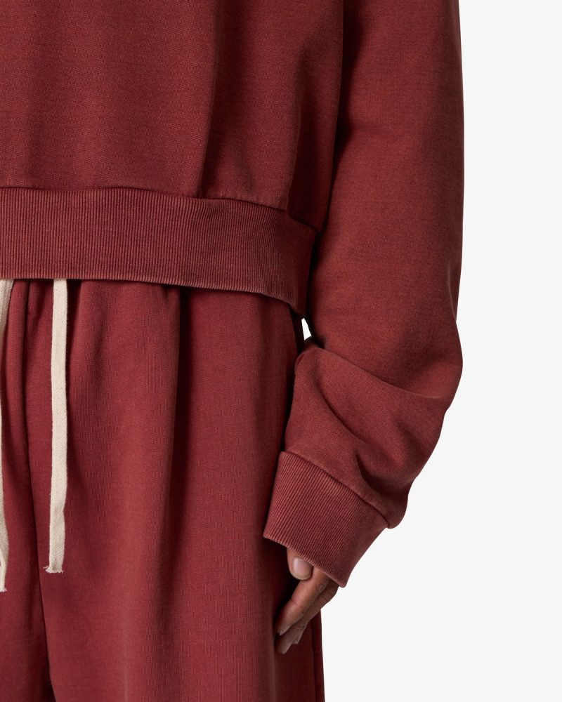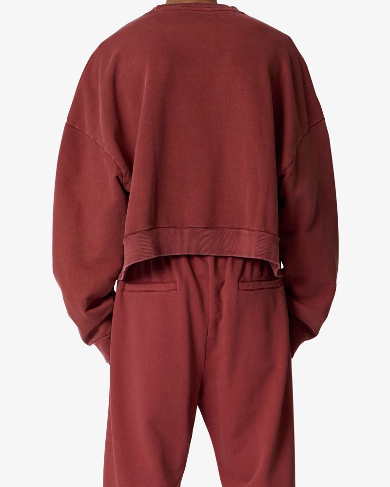 the Cropped Crewneck is made from a garment washed cotton fleece. featuring ribbing at the wrist. collar and sweep. the classic crewneck ribbing and stitch detail at the collar. and is finished in an oversized fit with a dropped shoulder design.