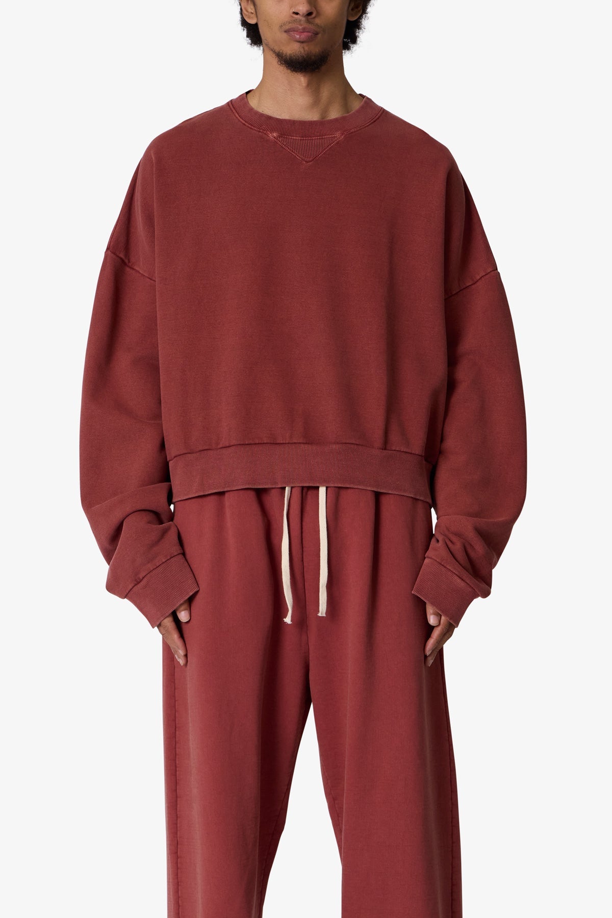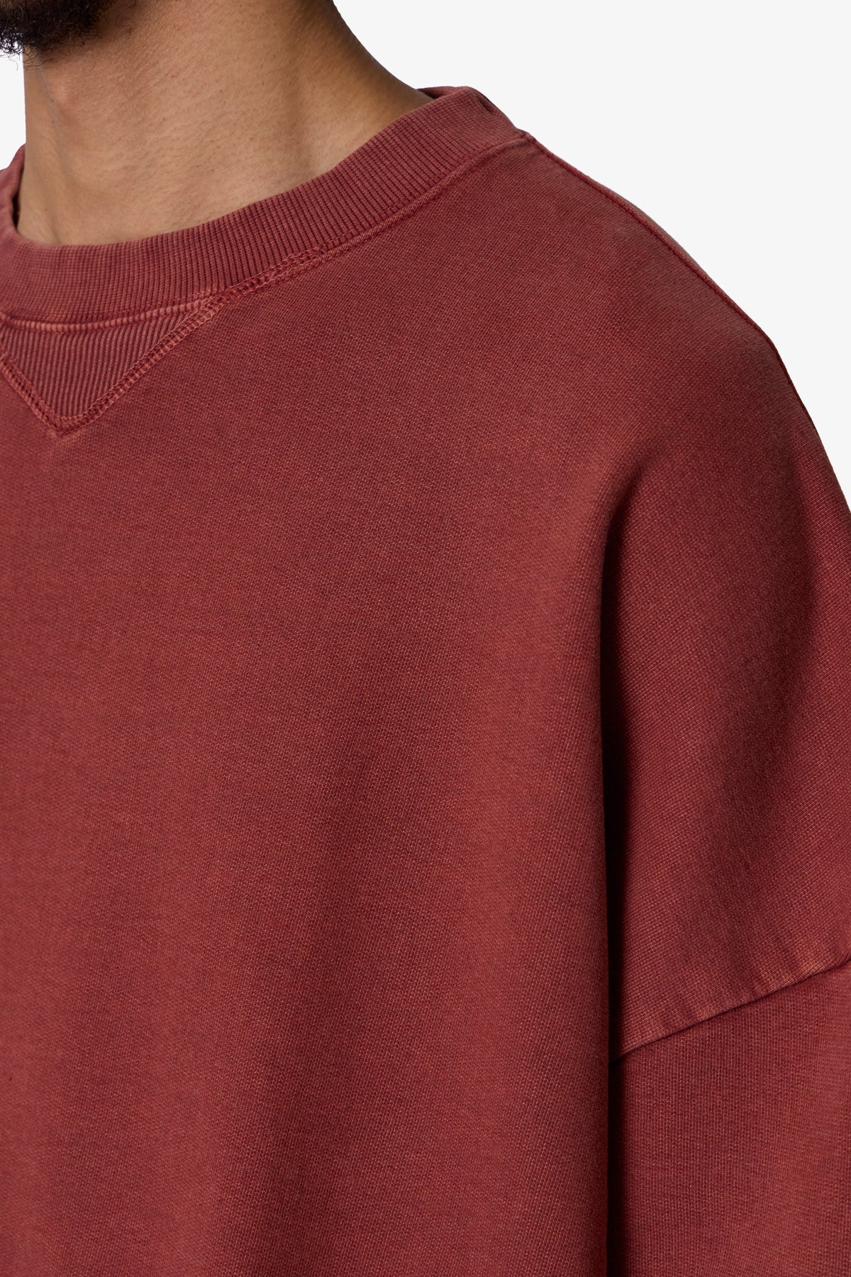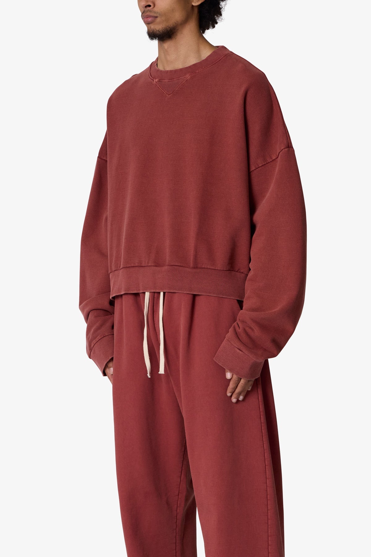 the Cropped Crewneck is made from a garment washed cotton fleece. featuring ribbing at the wrist. collar and sweep. the classic crewneck ribbing and stitch detail at the collar. and is finished in an oversized fit with a dropped shoulder design.