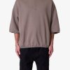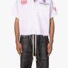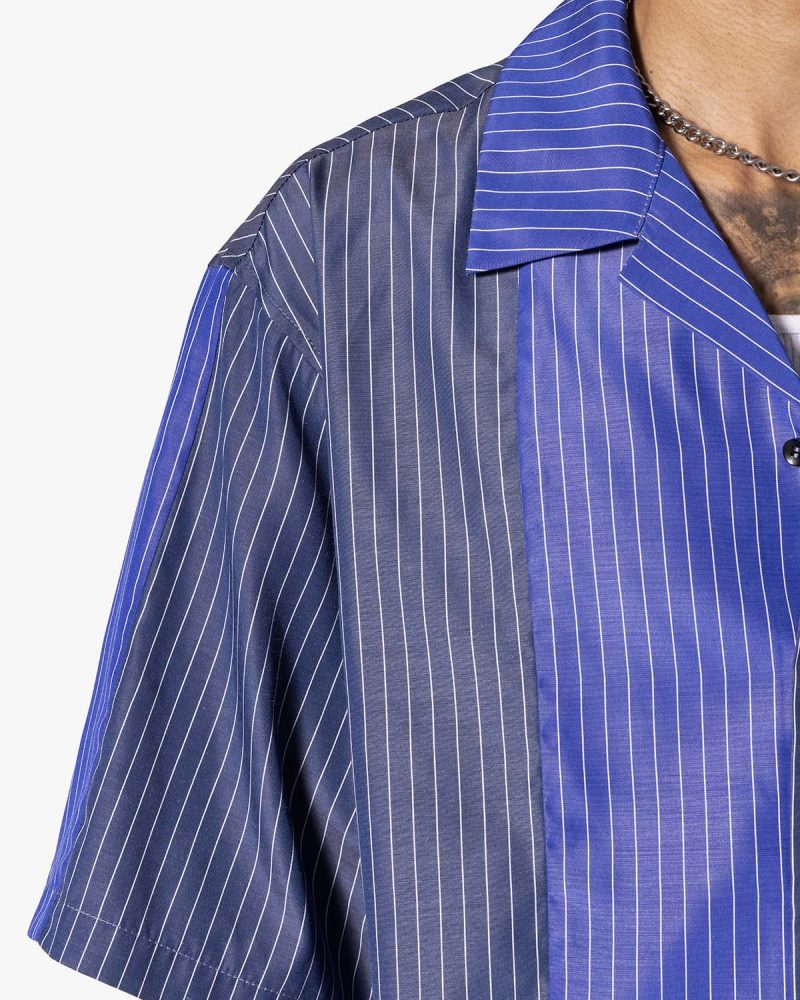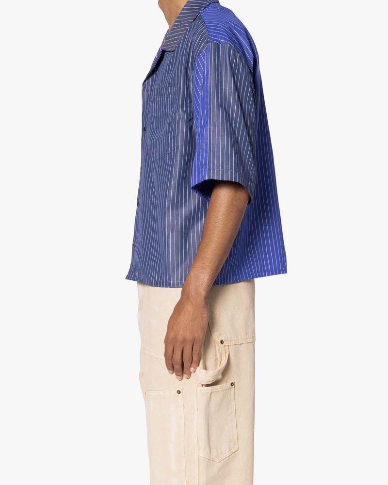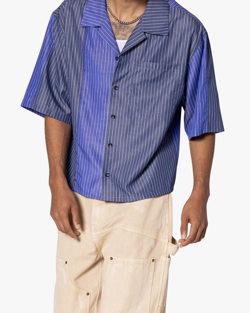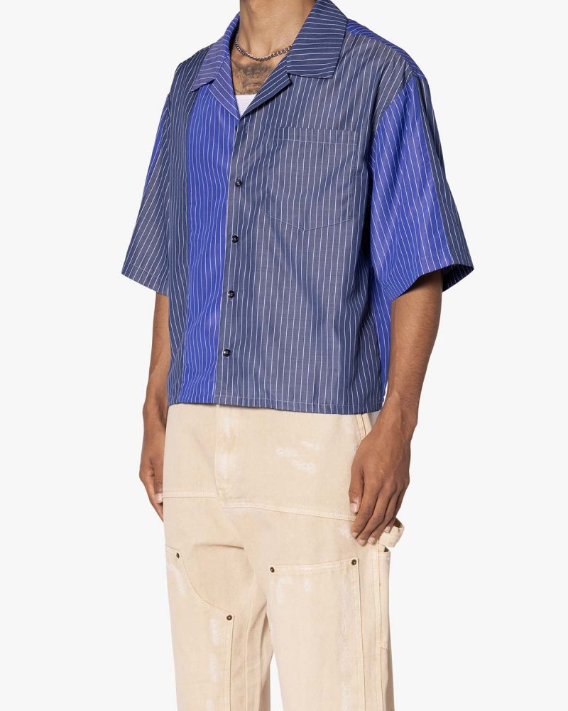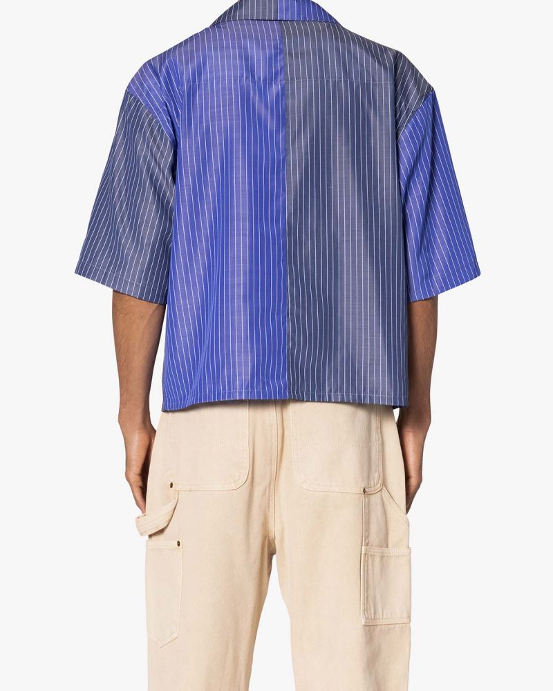the Cropped Panel Stripe Short Sleeve Shirt is made in a standard relax fit. a light polyester based fabric. multi pinstripe variations within shading of blue. finished hem. and a single pocket on the chest.