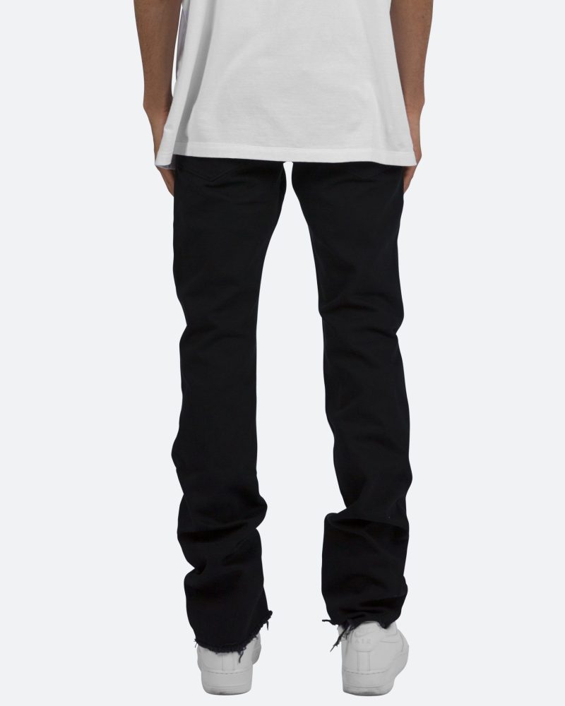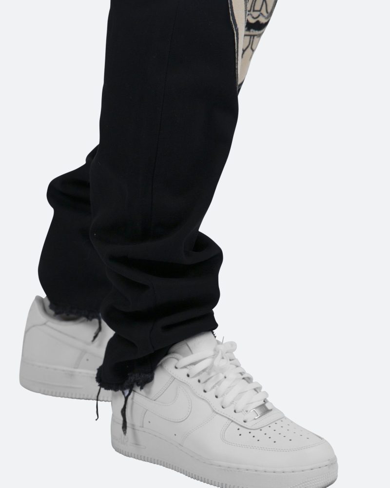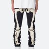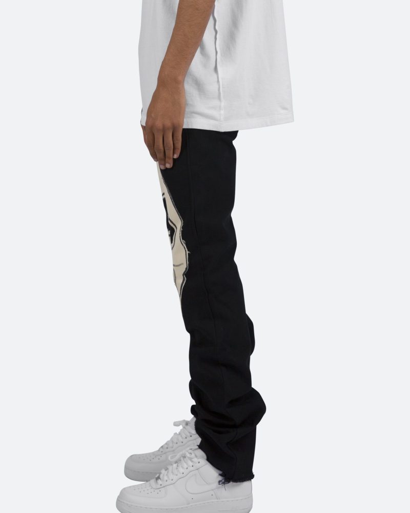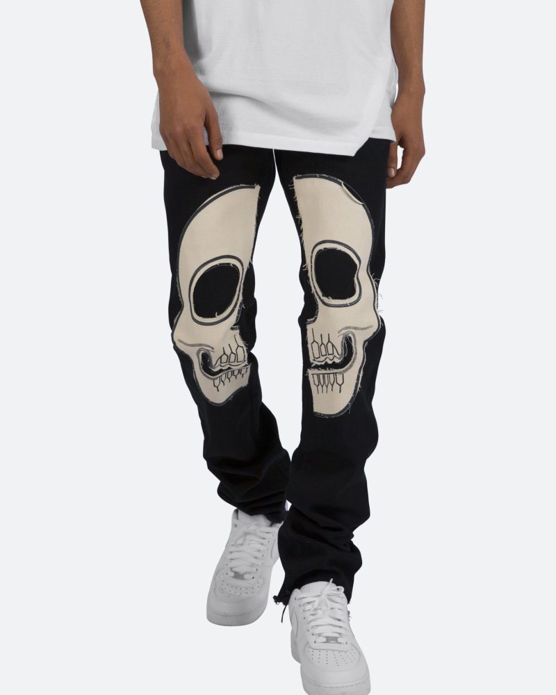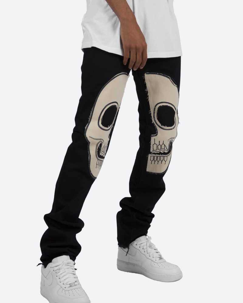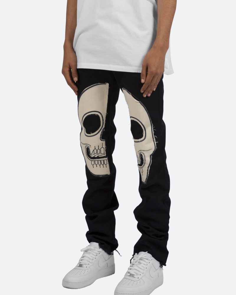 the D181 Denim is designed with our new D fit which is relaxed throughout with an extended inseam for stacking and features sewn-on skeleton artwork in canvas on both legs and is constructed from black denim with a raw leg opening.