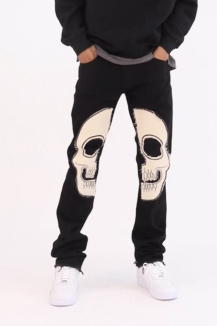 the D181 Denim is designed with our new D fit which is relaxed throughout with an extended inseam for stacking and features sewn-on skeleton artwork in canvas on both legs and is constructed from black denim with a raw leg opening.