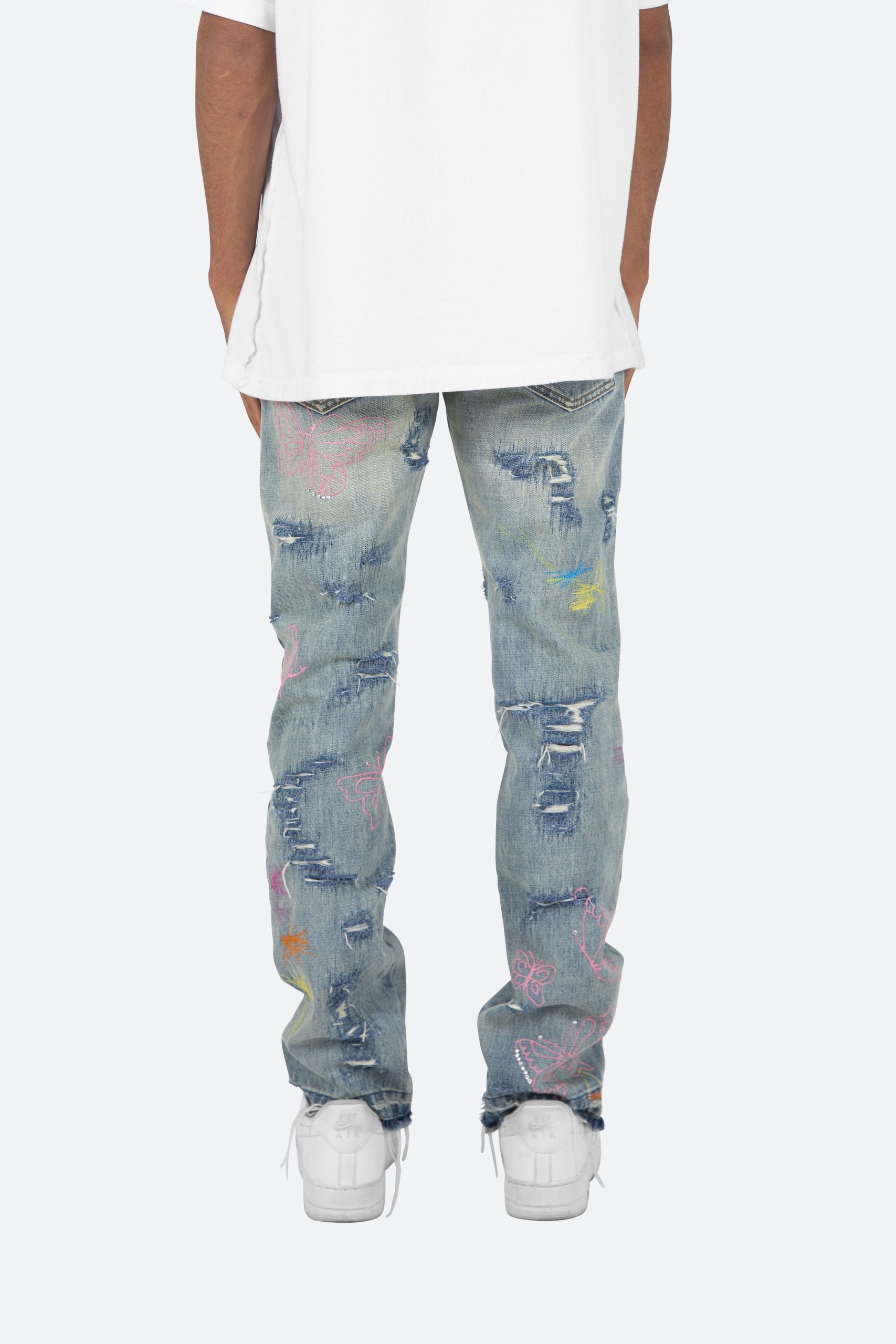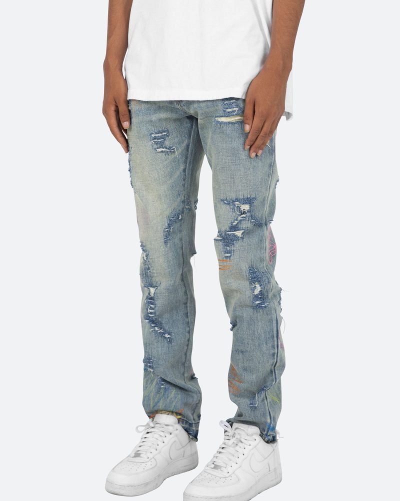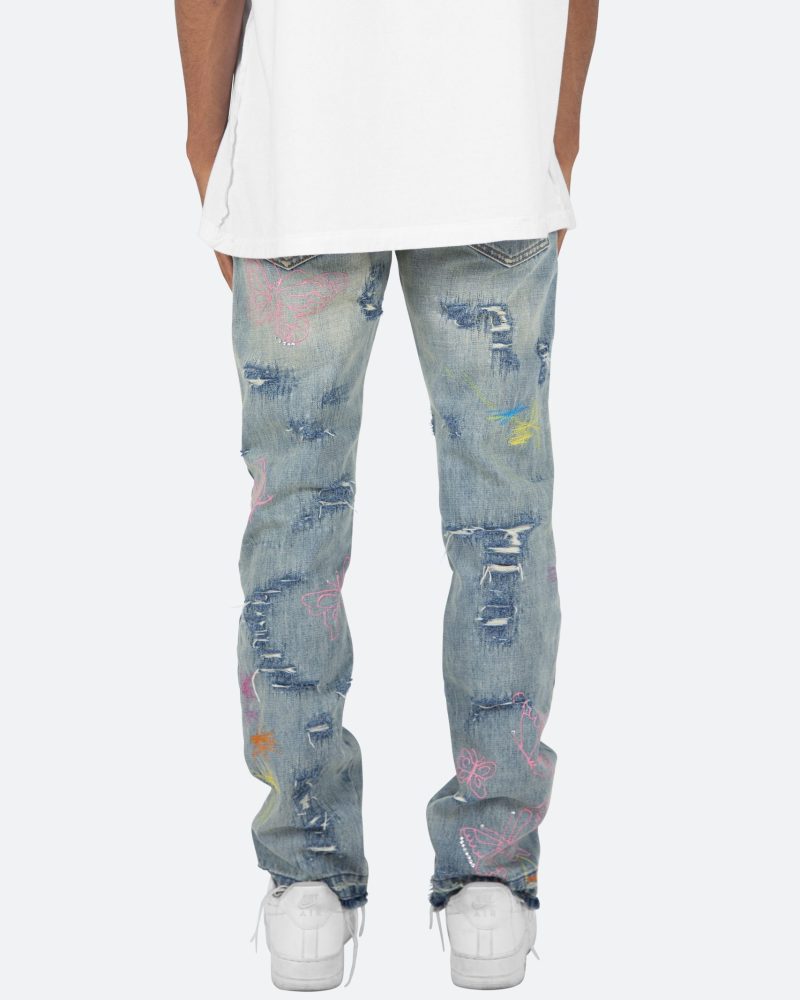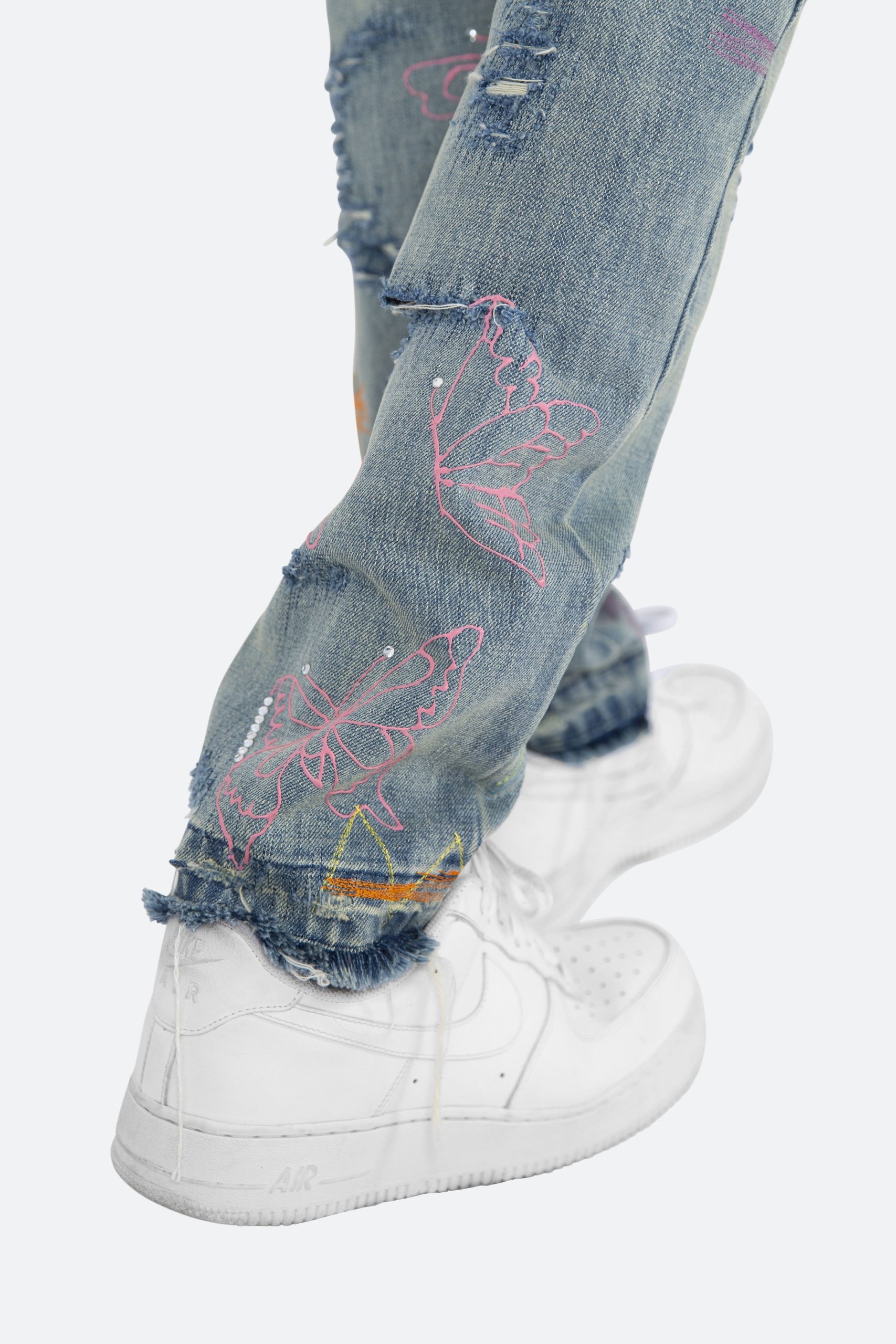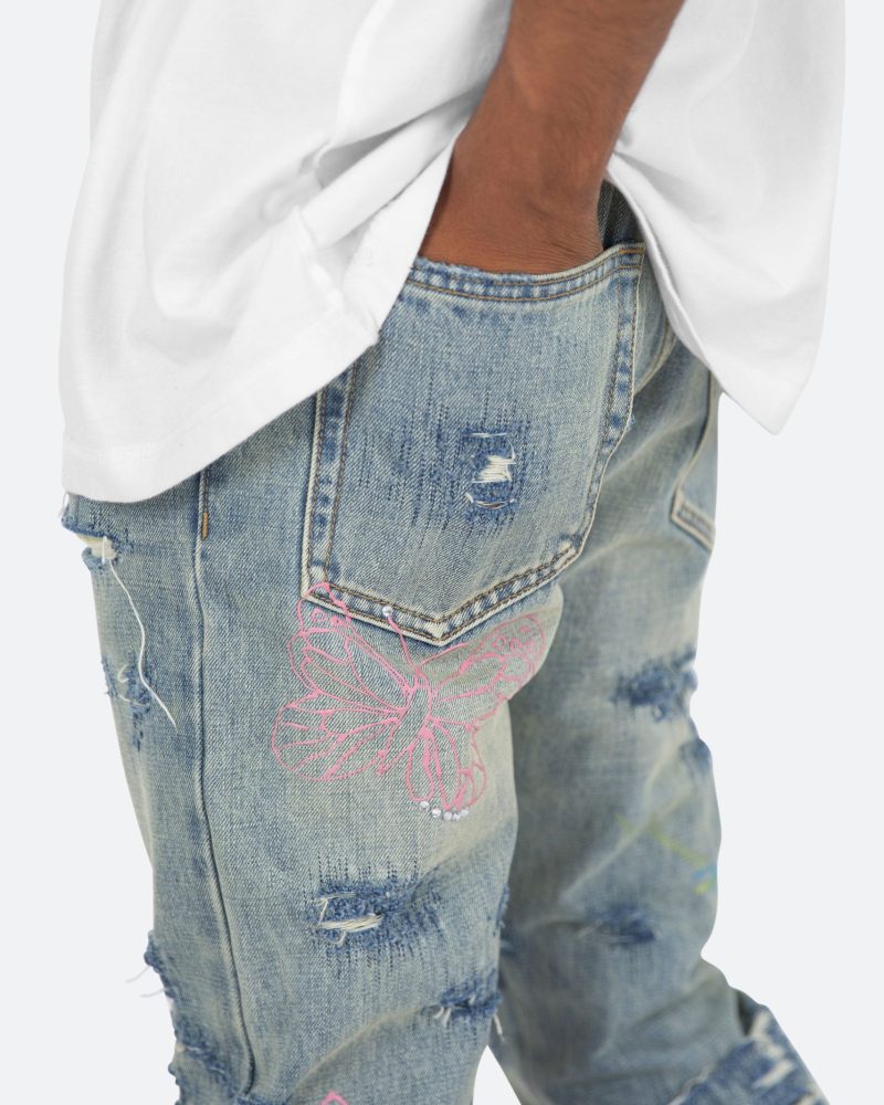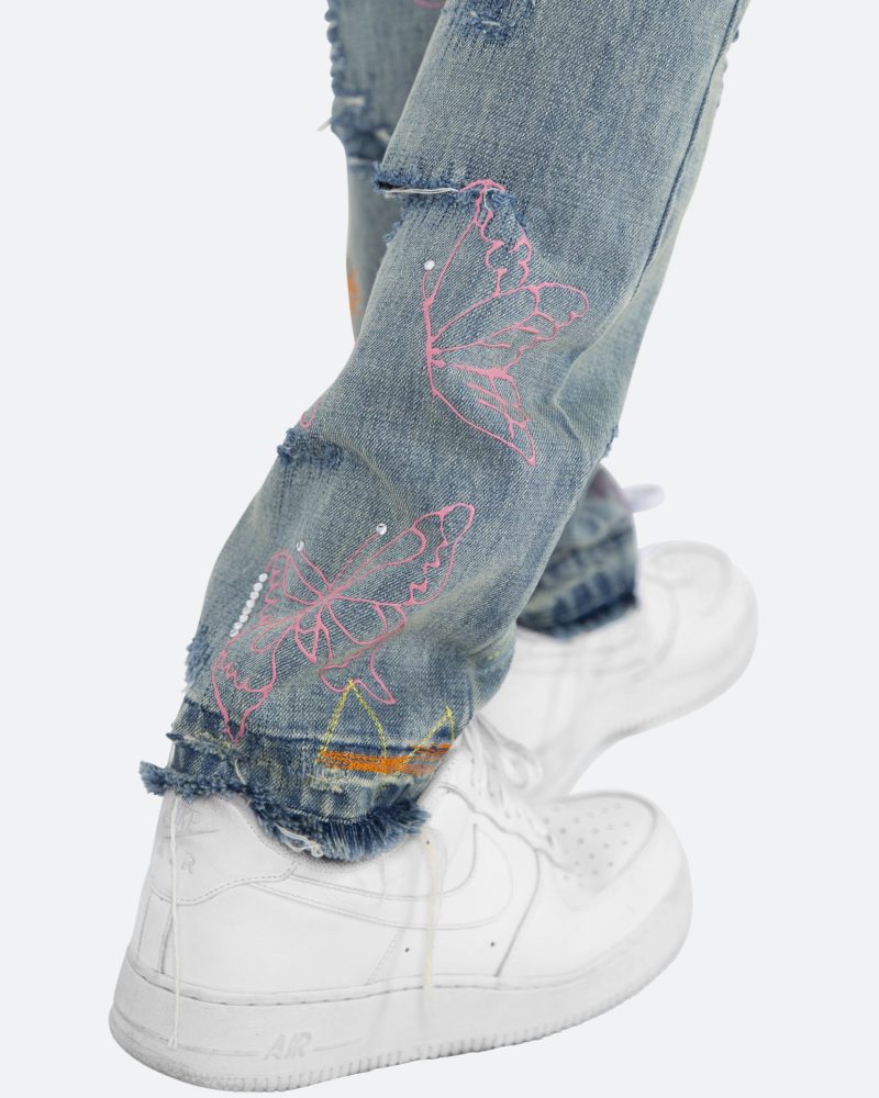 the D238 Ecstasy Wash Denim is designed with our new D fit which is relaxed throughout with an extended inseam for stacking and features a medium vintage wash with distressing and finished with butterfly prints throughout.