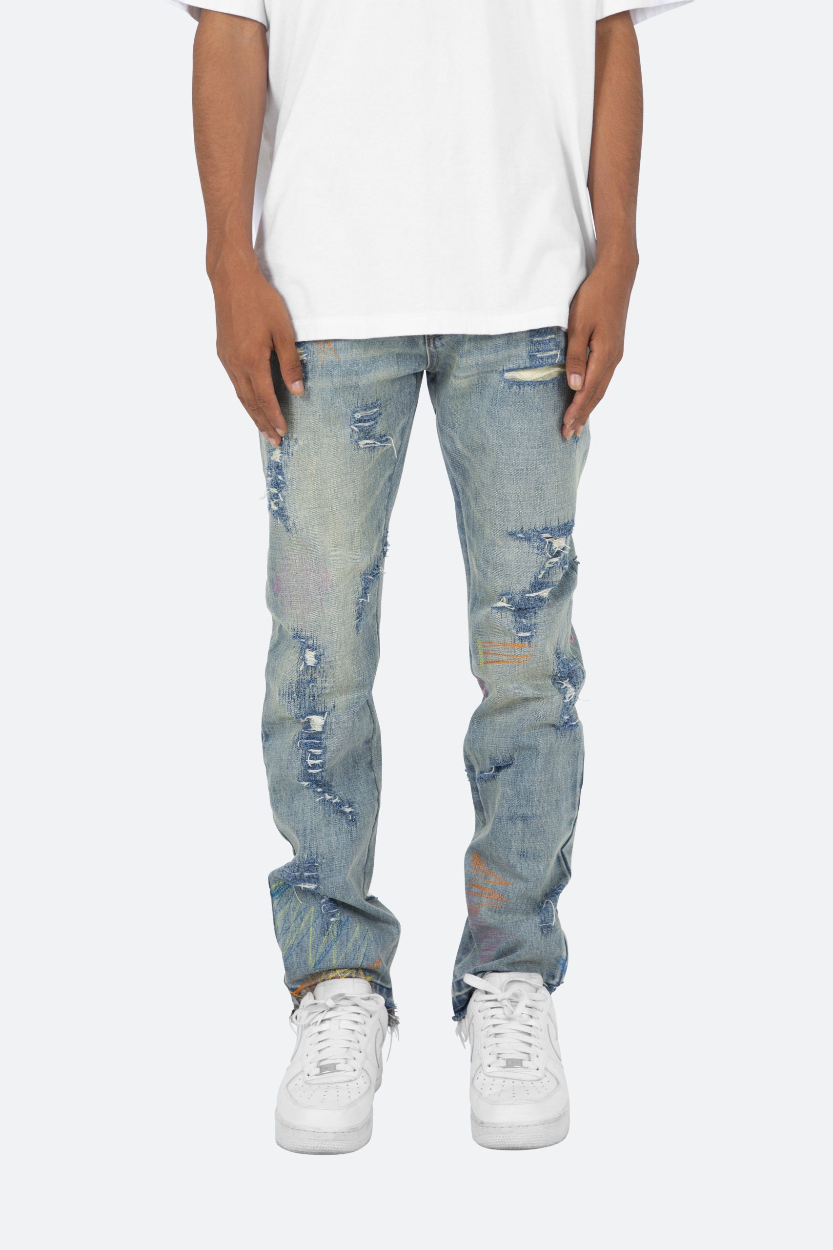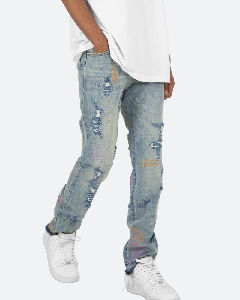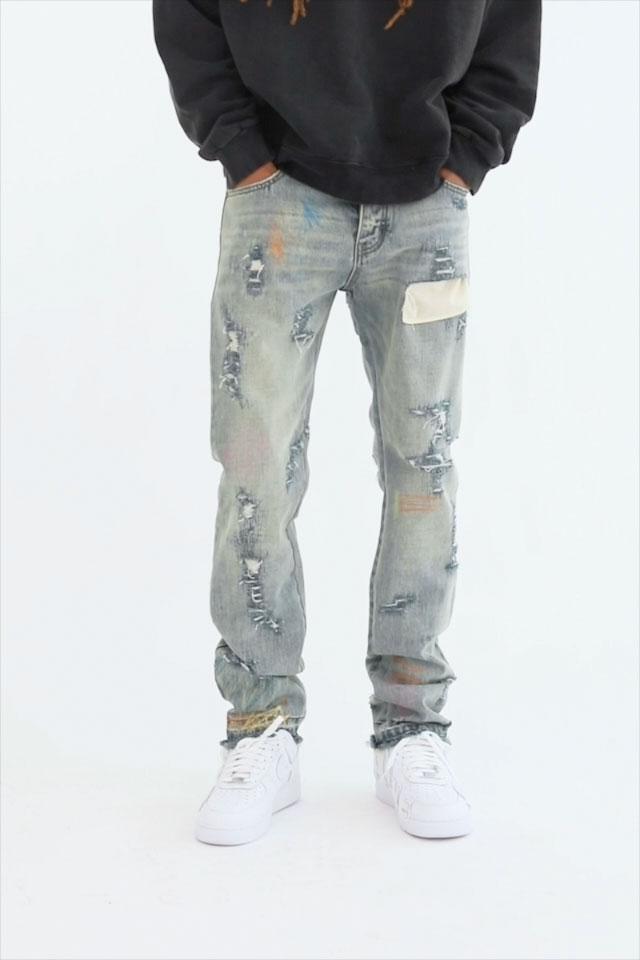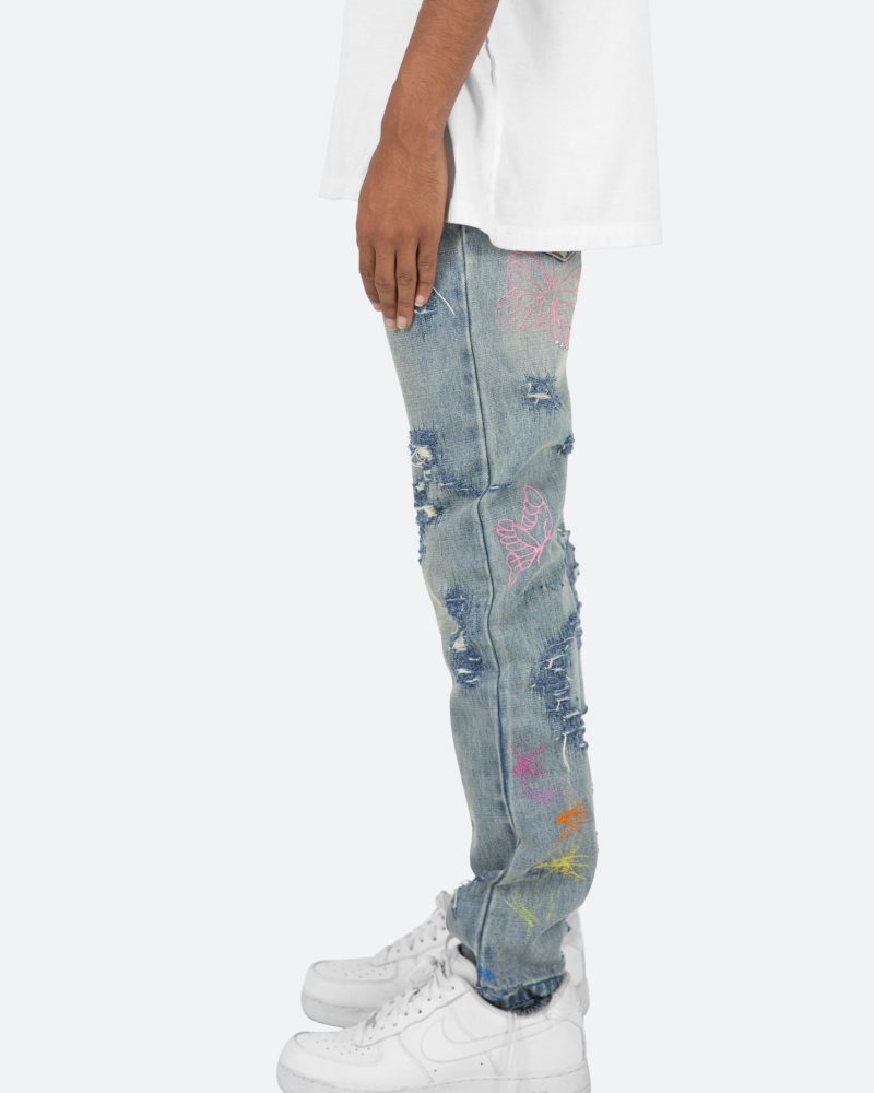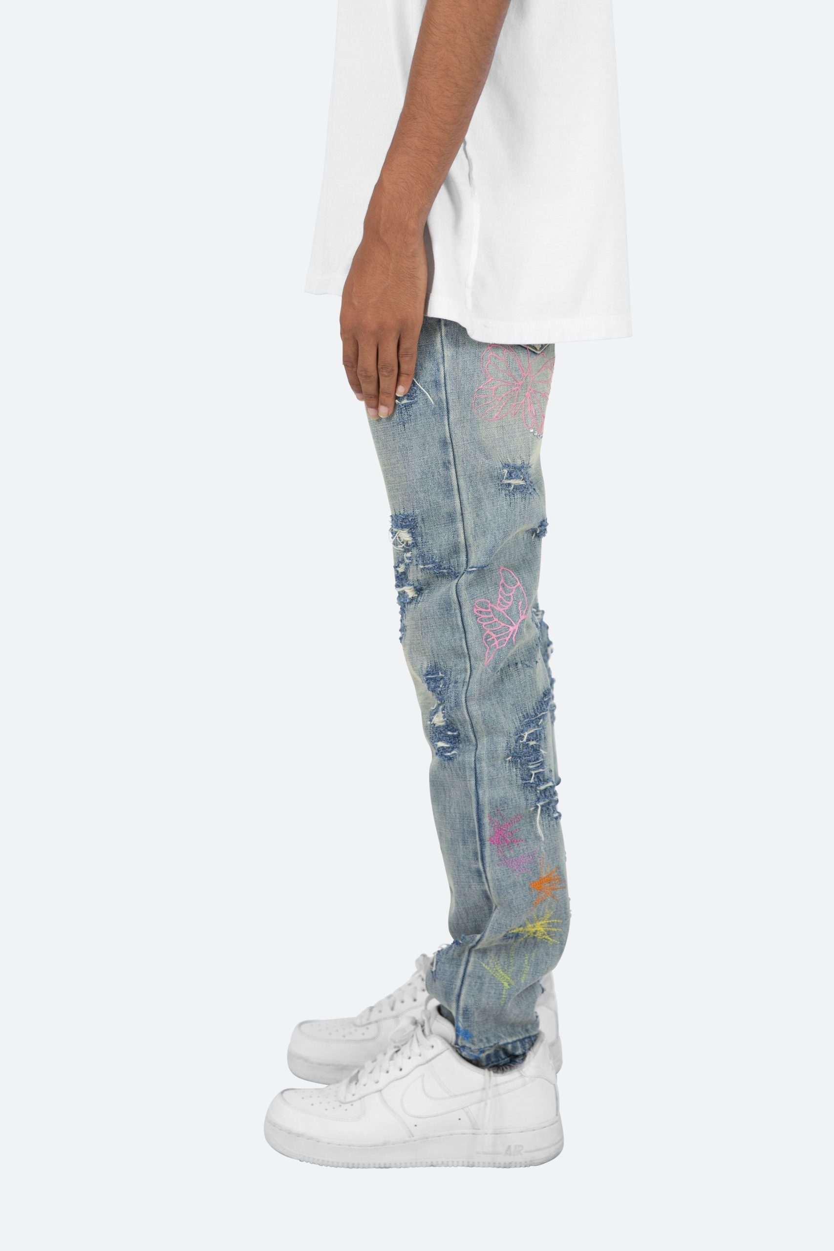 the D238 Ecstasy Wash Denim is designed with our new D fit which is relaxed throughout with an extended inseam for stacking and features a medium vintage wash with distressing and finished with butterfly prints throughout.