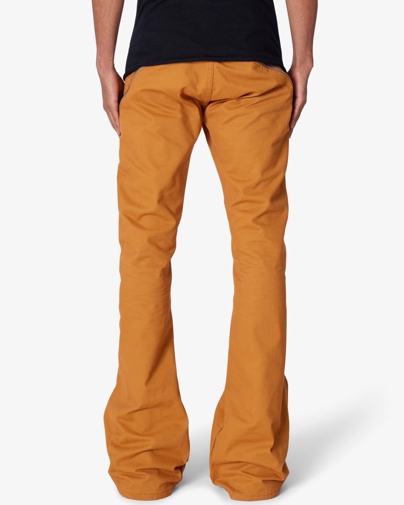 the D519 Zipper Flare Denim is designed with our D fit which is straight throughout. zipper detail extending from the thigh to the shin to provide a flare fit through the leg. and is constructed from orange denim.