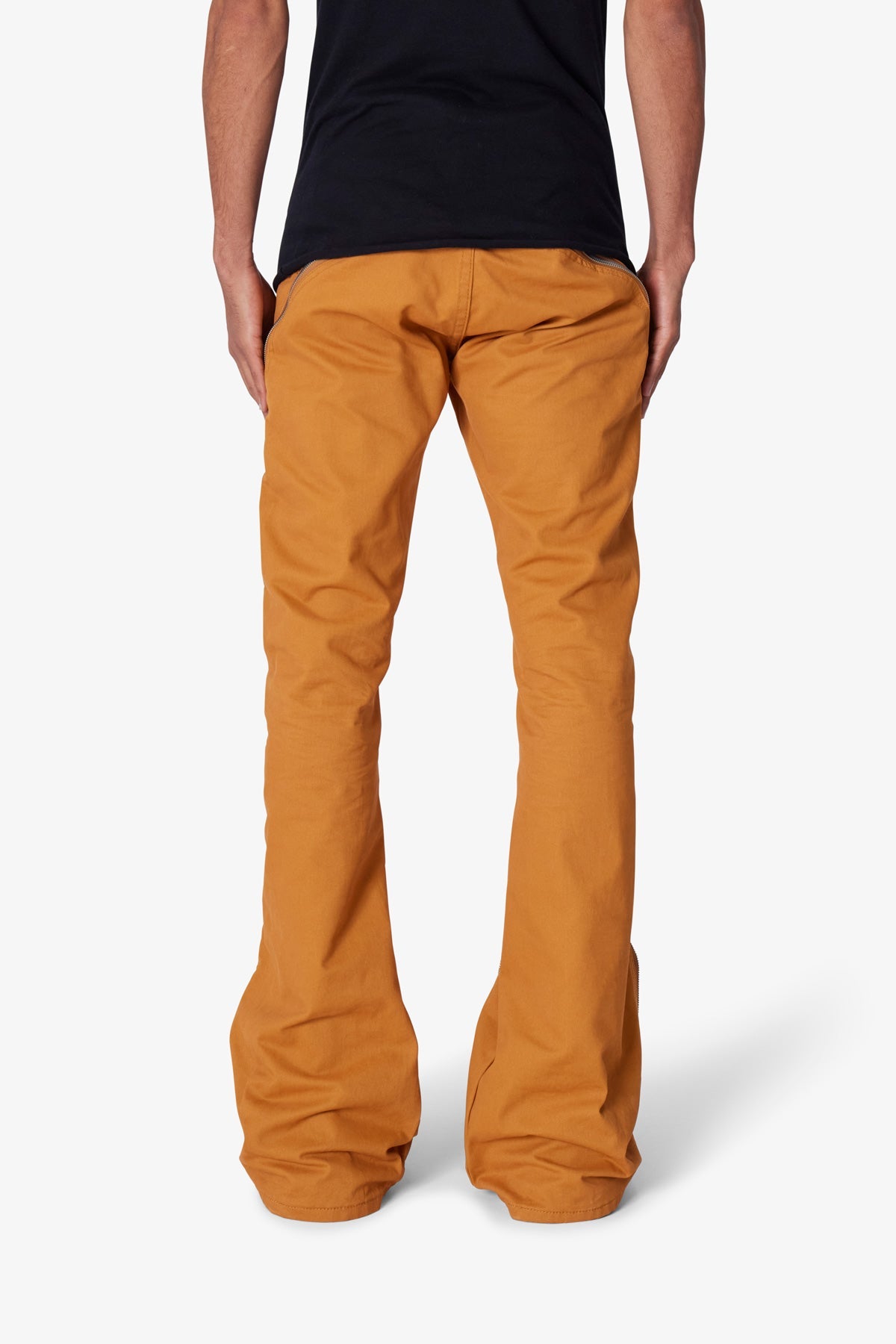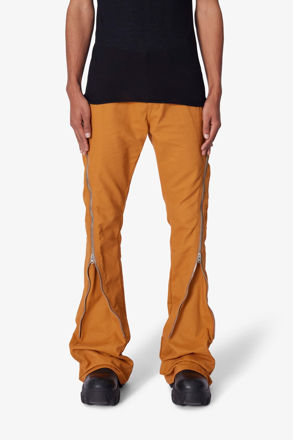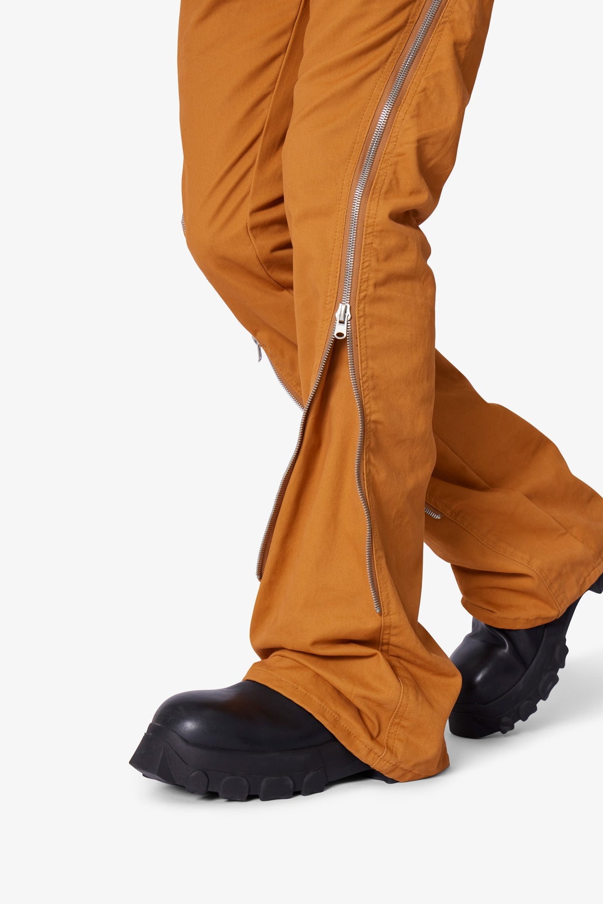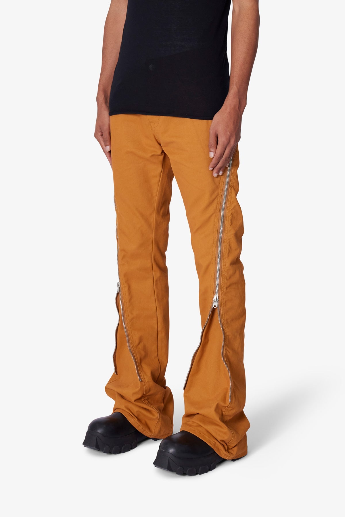 the D519 Zipper Flare Denim is designed with our D fit which is straight throughout. zipper detail extending from the thigh to the shin to provide a flare fit through the leg. and is constructed from orange denim.