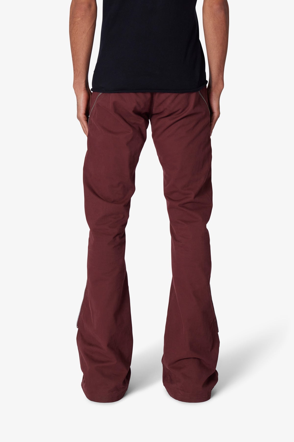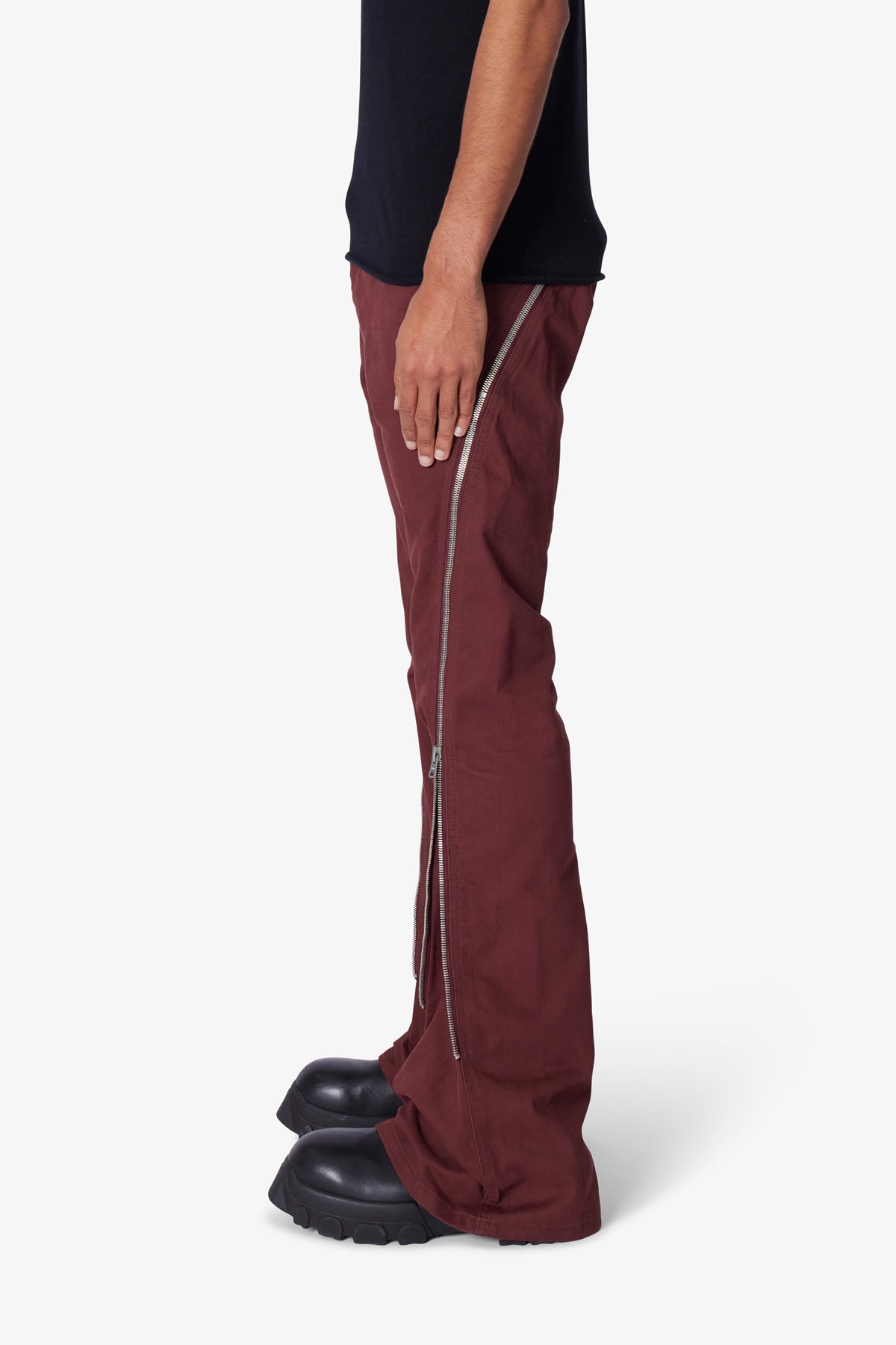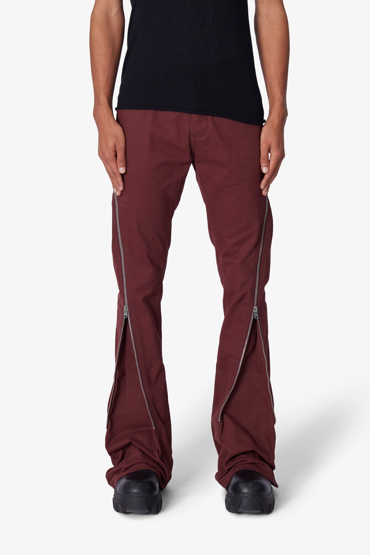 the D519 Zipper Flare Denim is designed with our D fit which is straight throughout. zipper detail extending from the thigh to the shin to provide a flare fit through the leg. and is constructed from black denim.