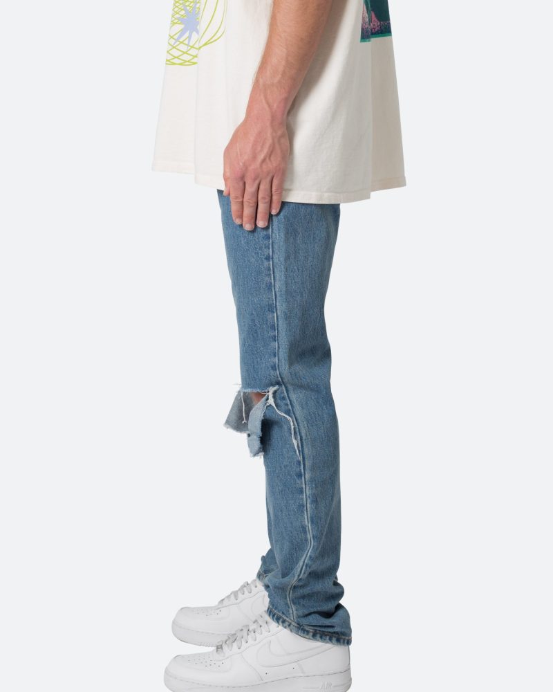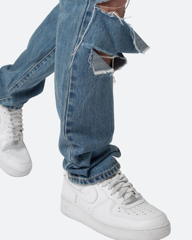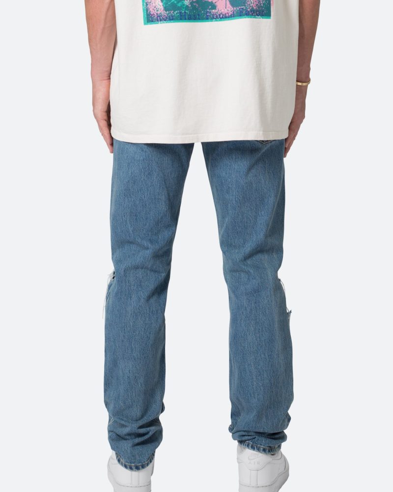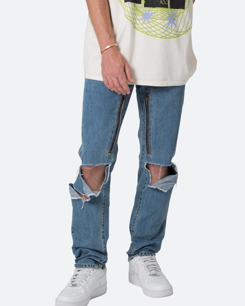 the D530 Zipper Straight Denim is designed with our new D fit which is relaxed throughout with an extended inseam for stacking and features a medium vintage wash. distressing details at the knees. and finished with zipper details at the thigh.