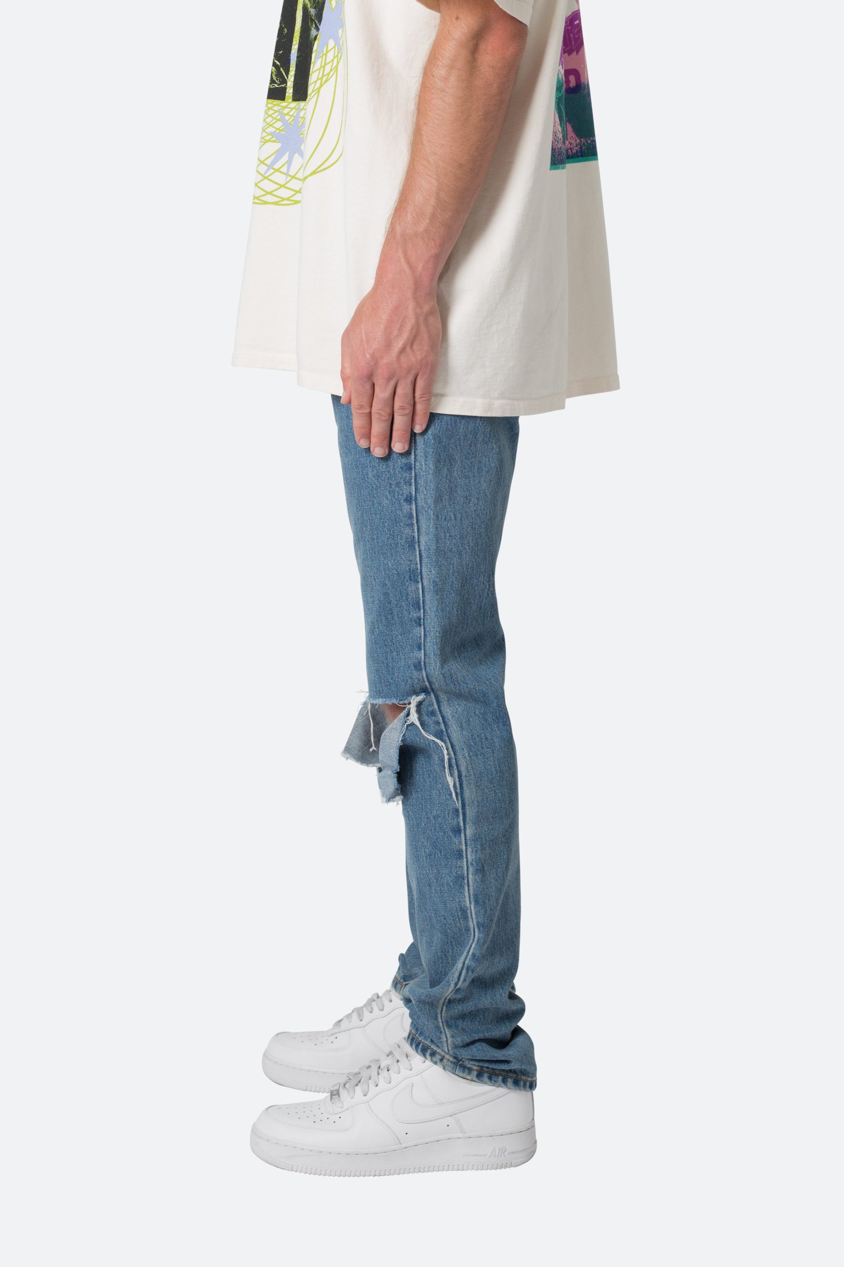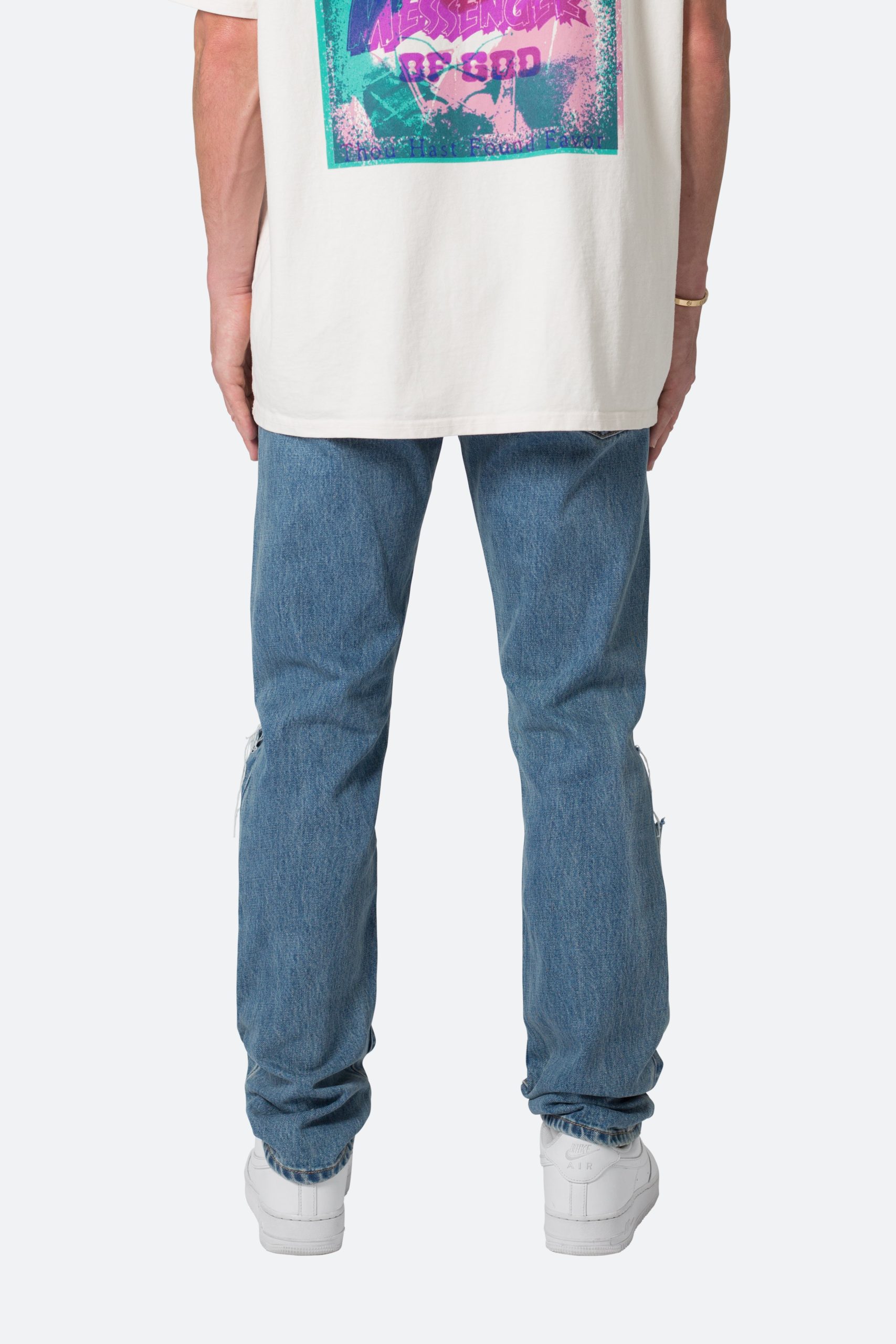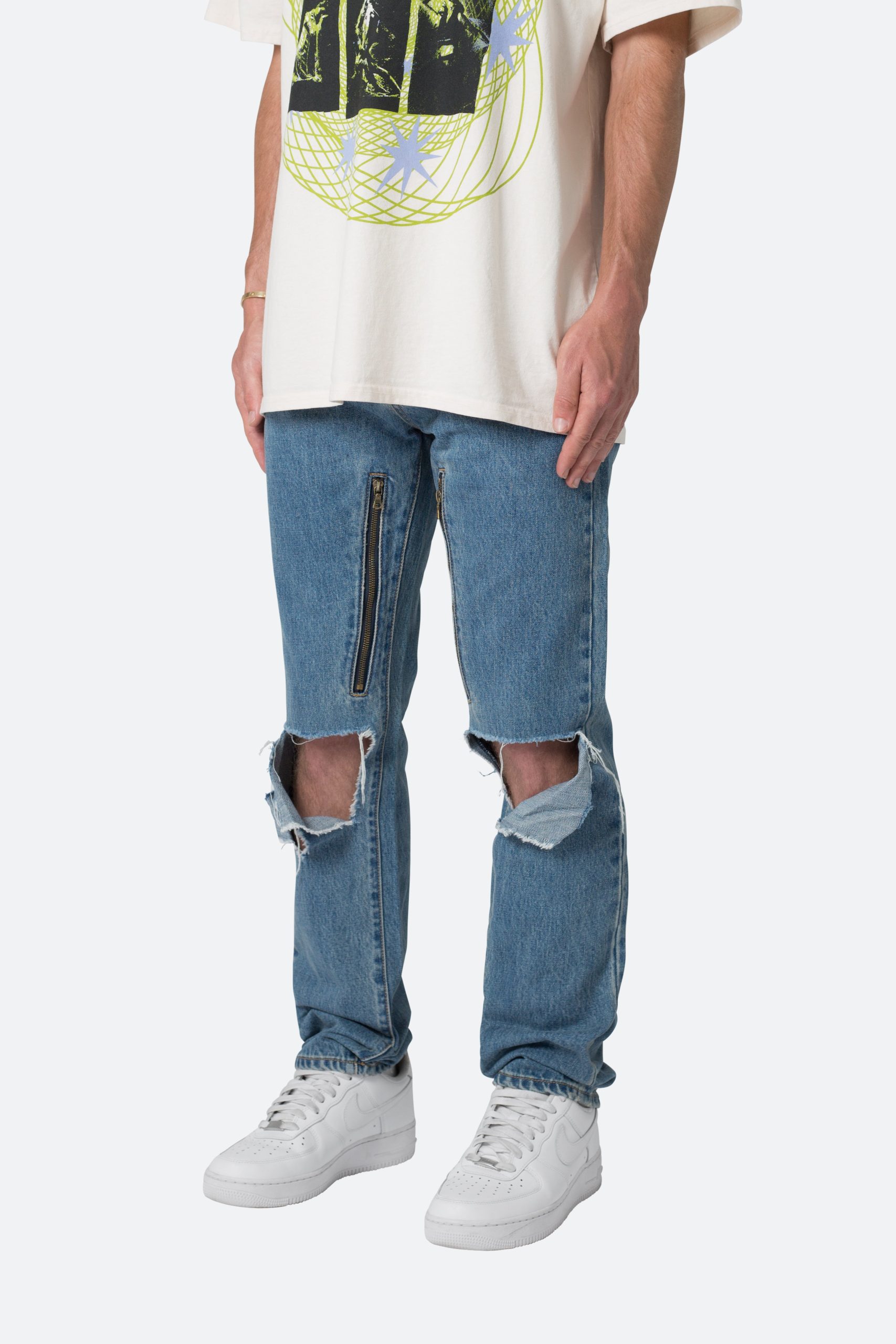 the D530 Zipper Straight Denim is designed with our new D fit which is relaxed throughout with an extended inseam for stacking and features a medium vintage wash. distressing details at the knees. and finished with zipper details at the thigh.
