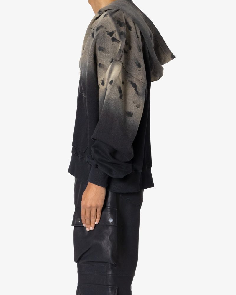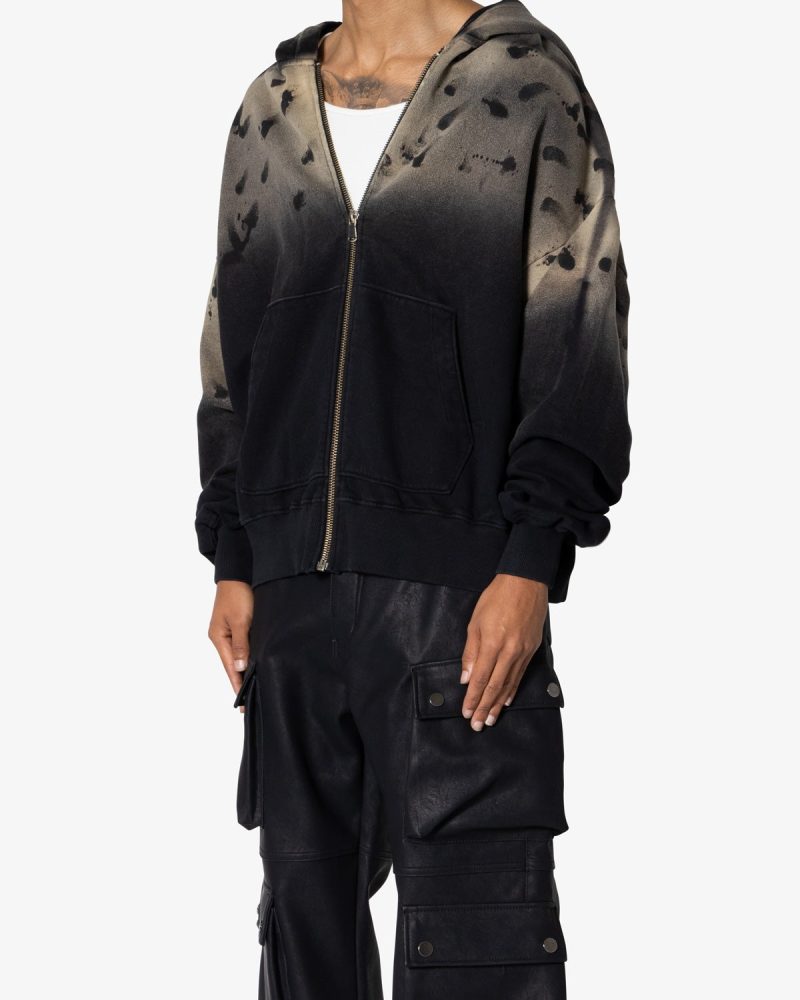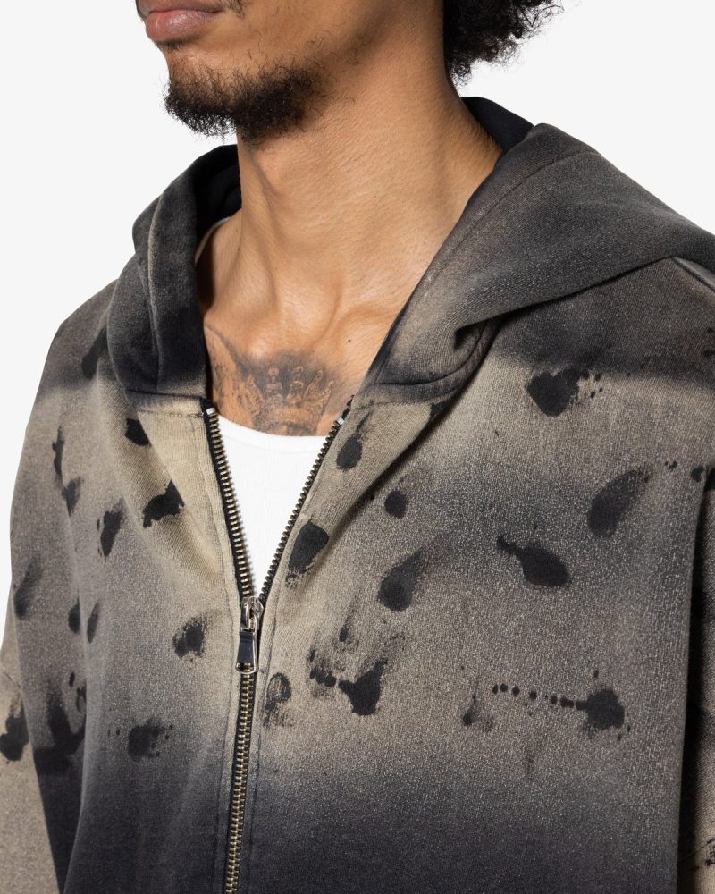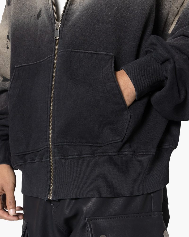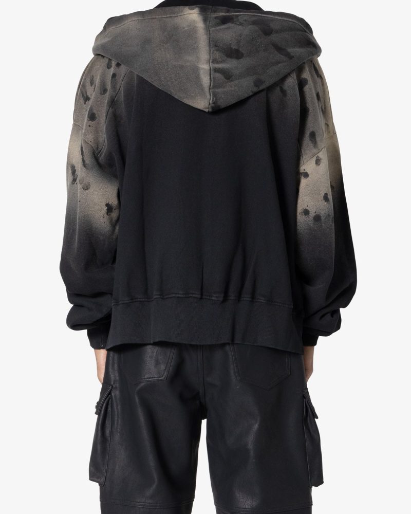 the Destroyed Hoodie is an oversized fit silhouette with a dropped shoulder that features an extreme vintage wash that is stronger at the shoulders. distressing details in the washed areas throughout. zipper closure and finished with welt pockets.