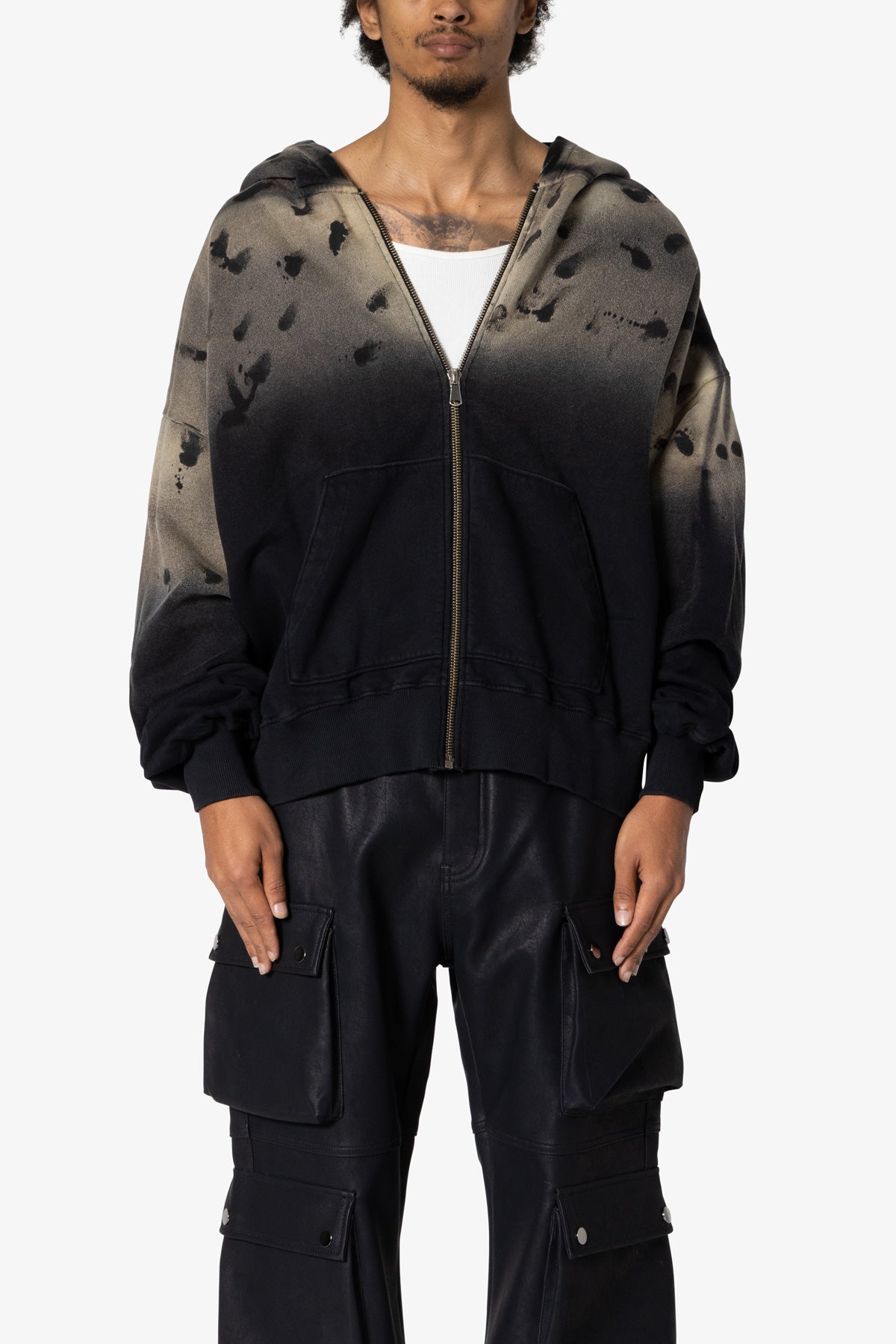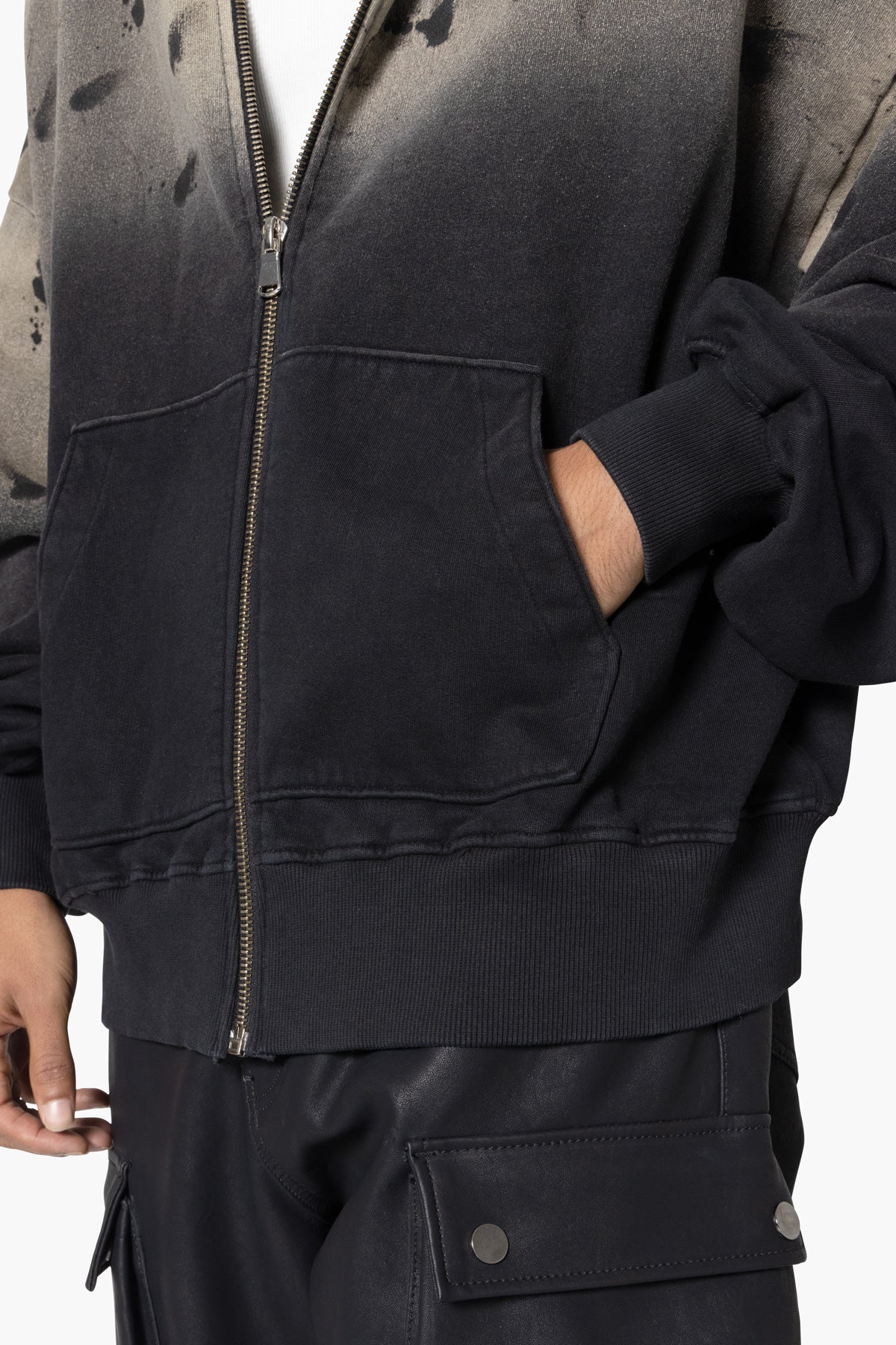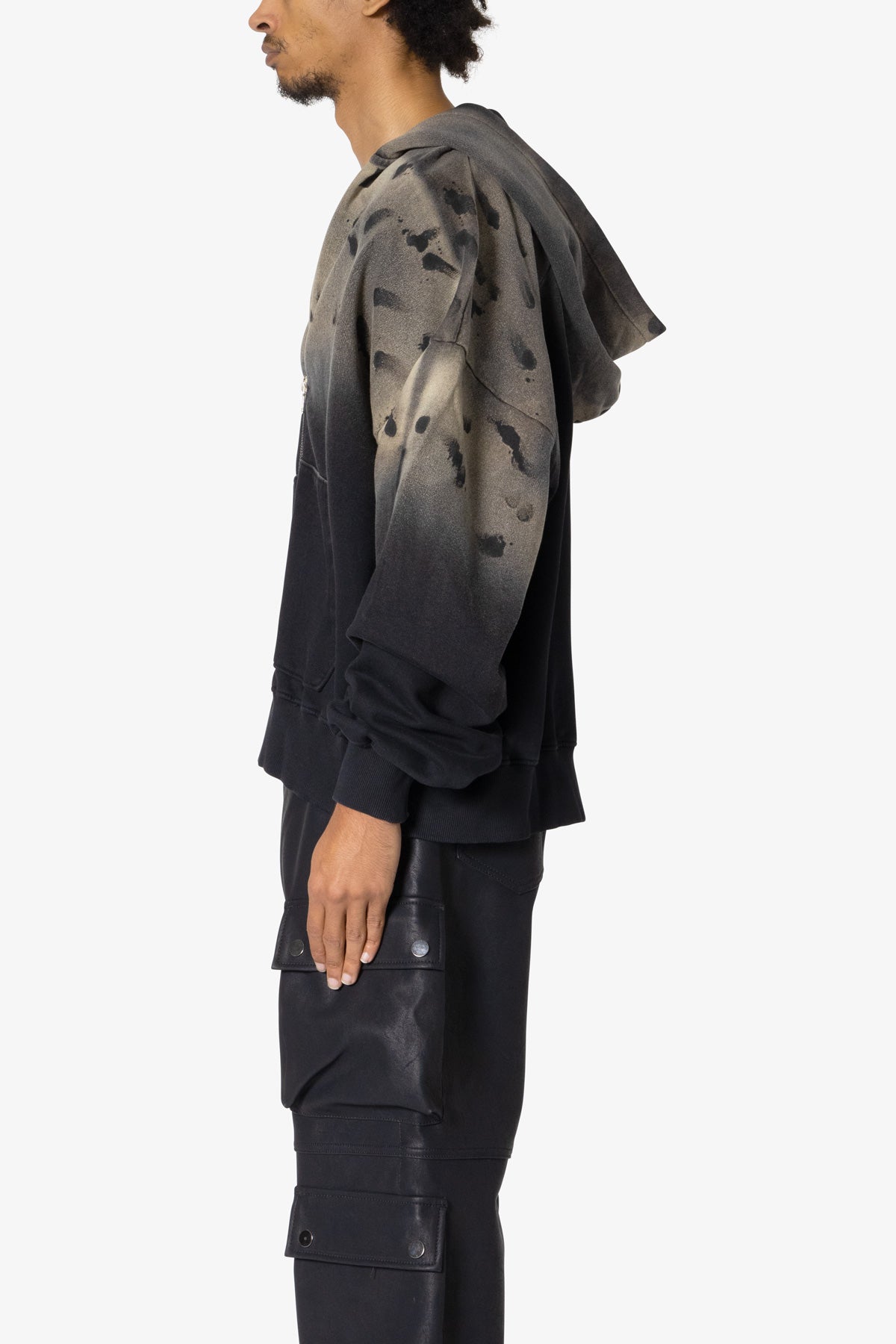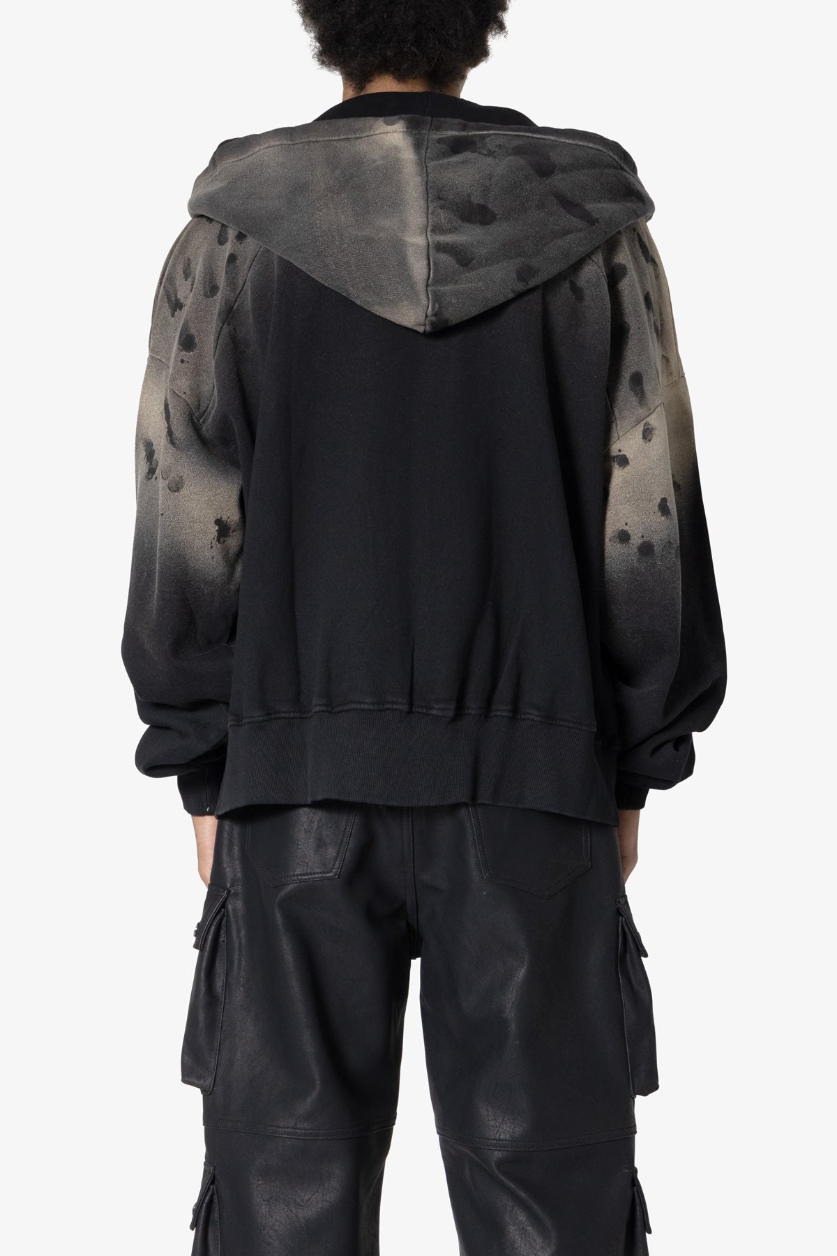 the Destroyed Hoodie is an oversized fit silhouette with a dropped shoulder that features an extreme vintage wash that is stronger at the shoulders. distressing details in the washed areas throughout. zipper closure and finished with welt pockets.