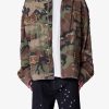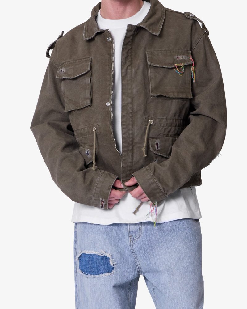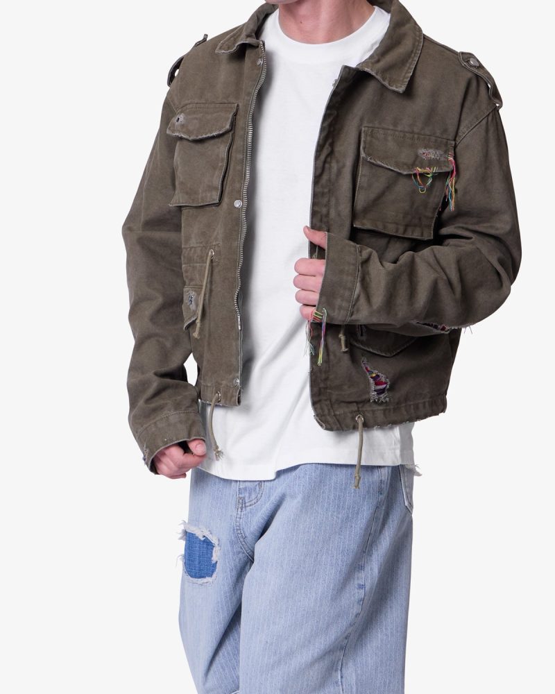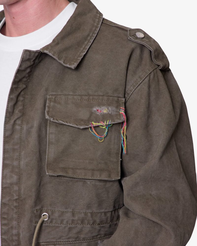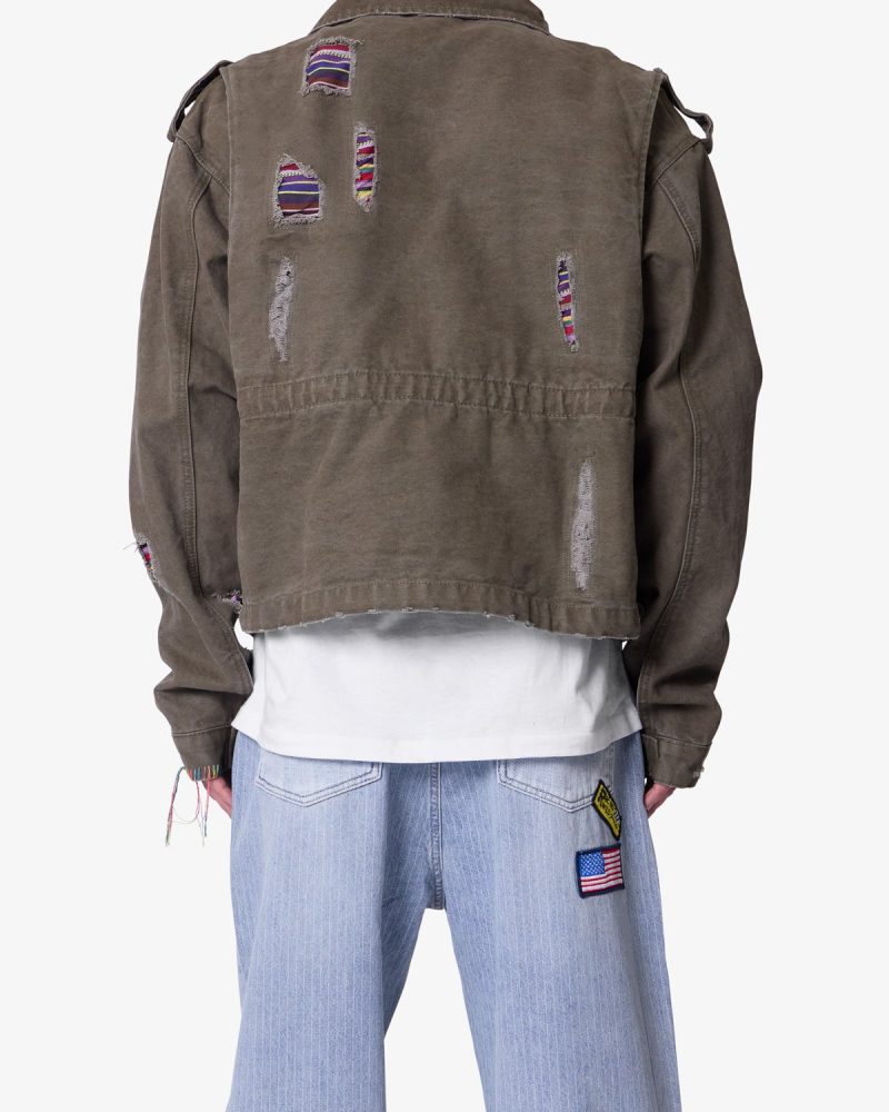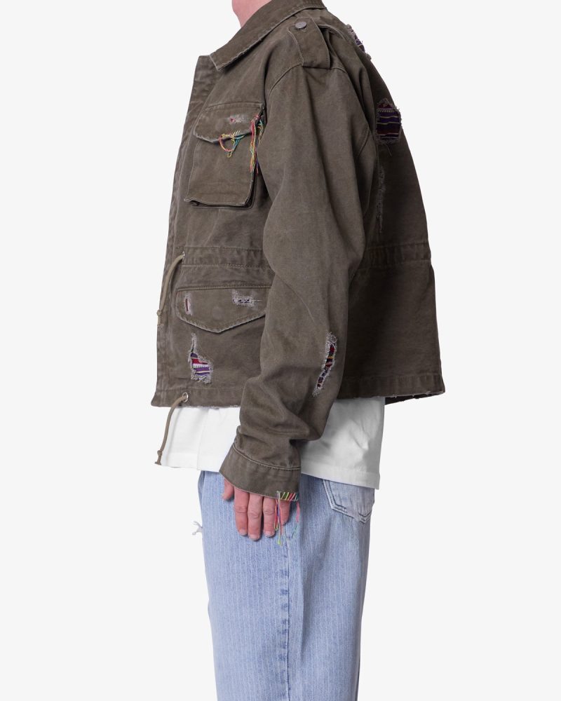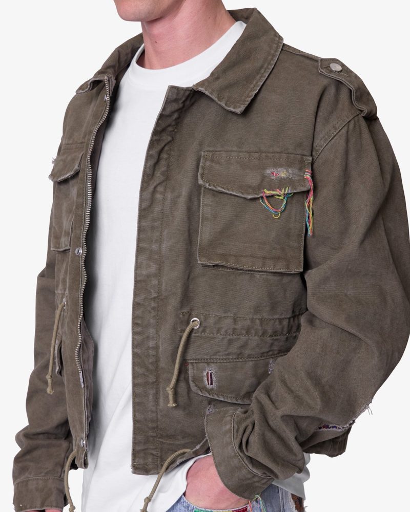 Constructed from 100% cotton canvas with a heavy vintage wash. this standard fit jacket is slightly cropped at the waist. Features include four front cargo pockets. epaulets. a snap and zipper front closure. and a drawcord at the waist. Finished with subtle distressing and patch repairs using fabric inspired by tribal wovens.