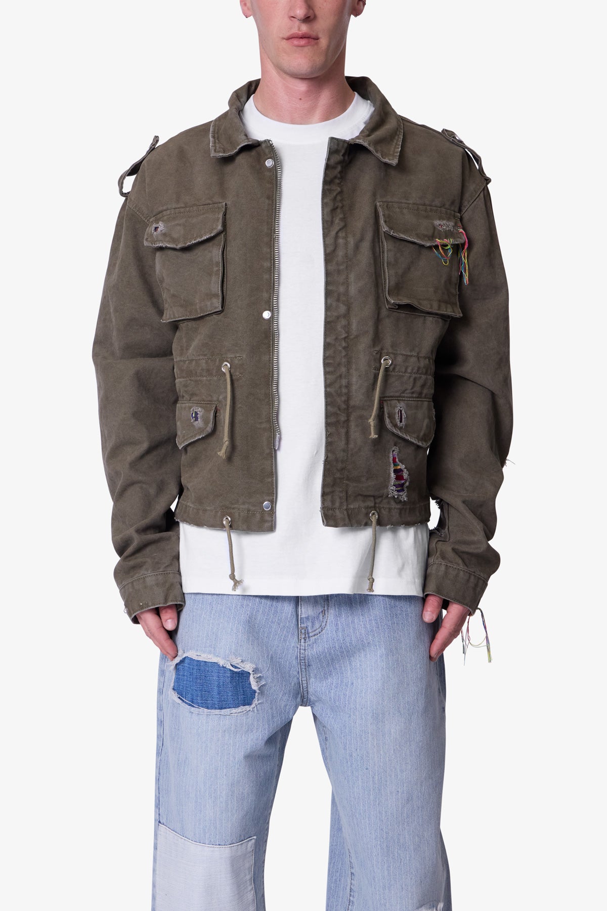 Constructed from 100% cotton canvas with a heavy vintage wash. this standard fit jacket is slightly cropped at the waist. Features include four front cargo pockets. epaulets. a snap and zipper front closure. and a drawcord at the waist. Finished with subtle distressing and patch repairs using fabric inspired by tribal wovens.