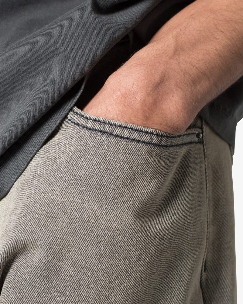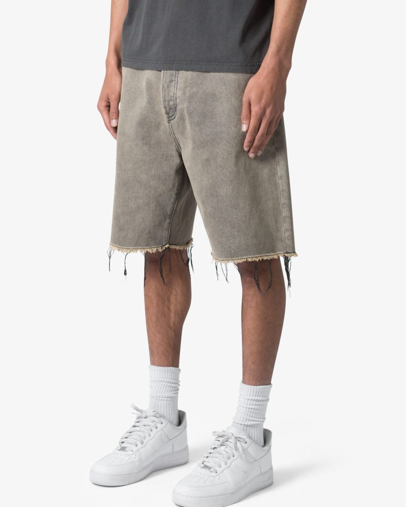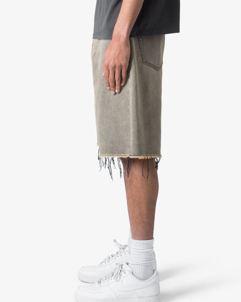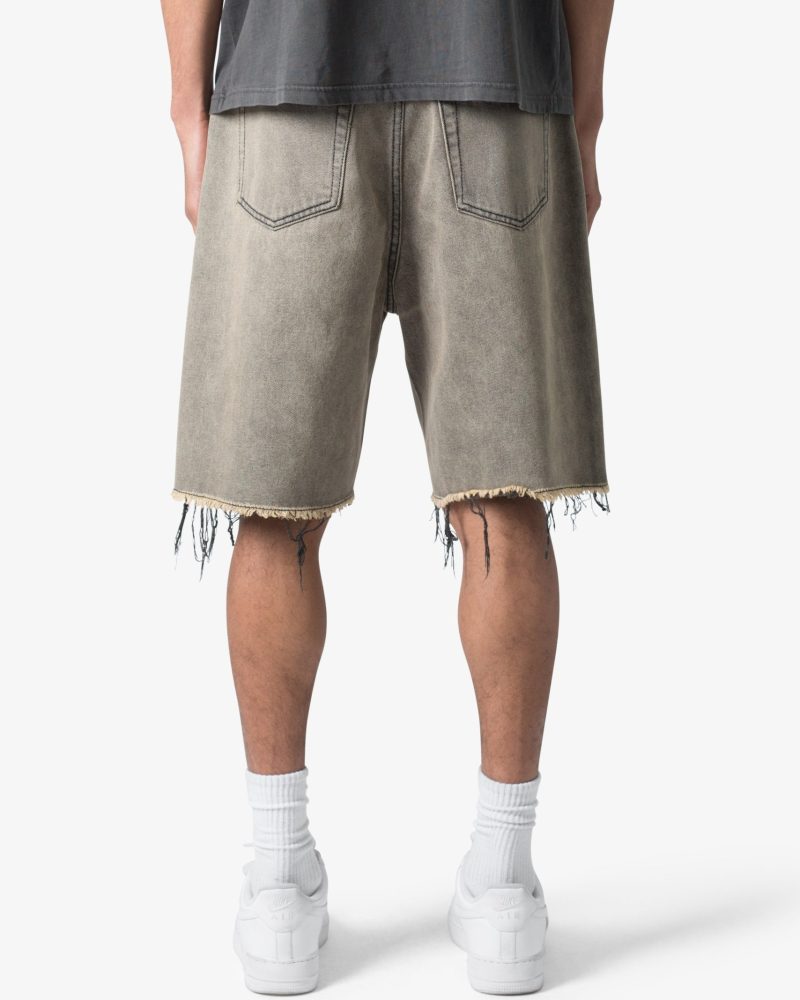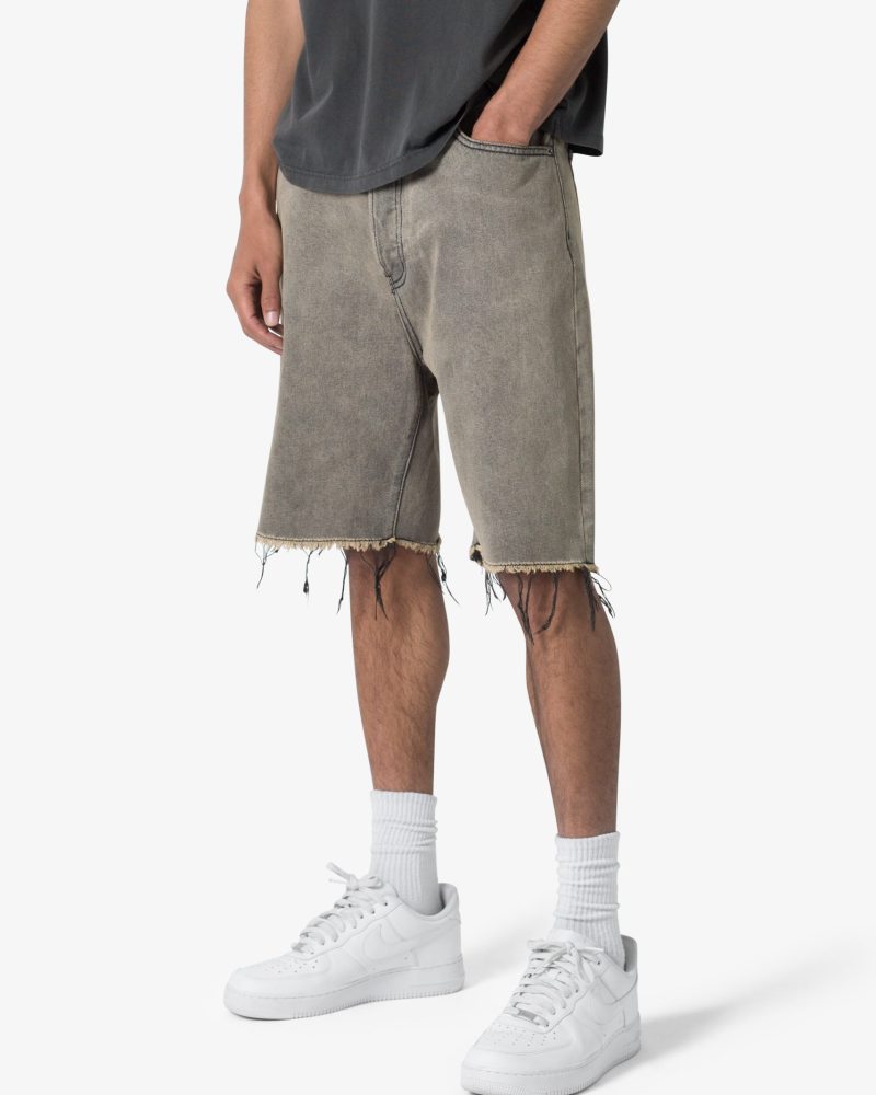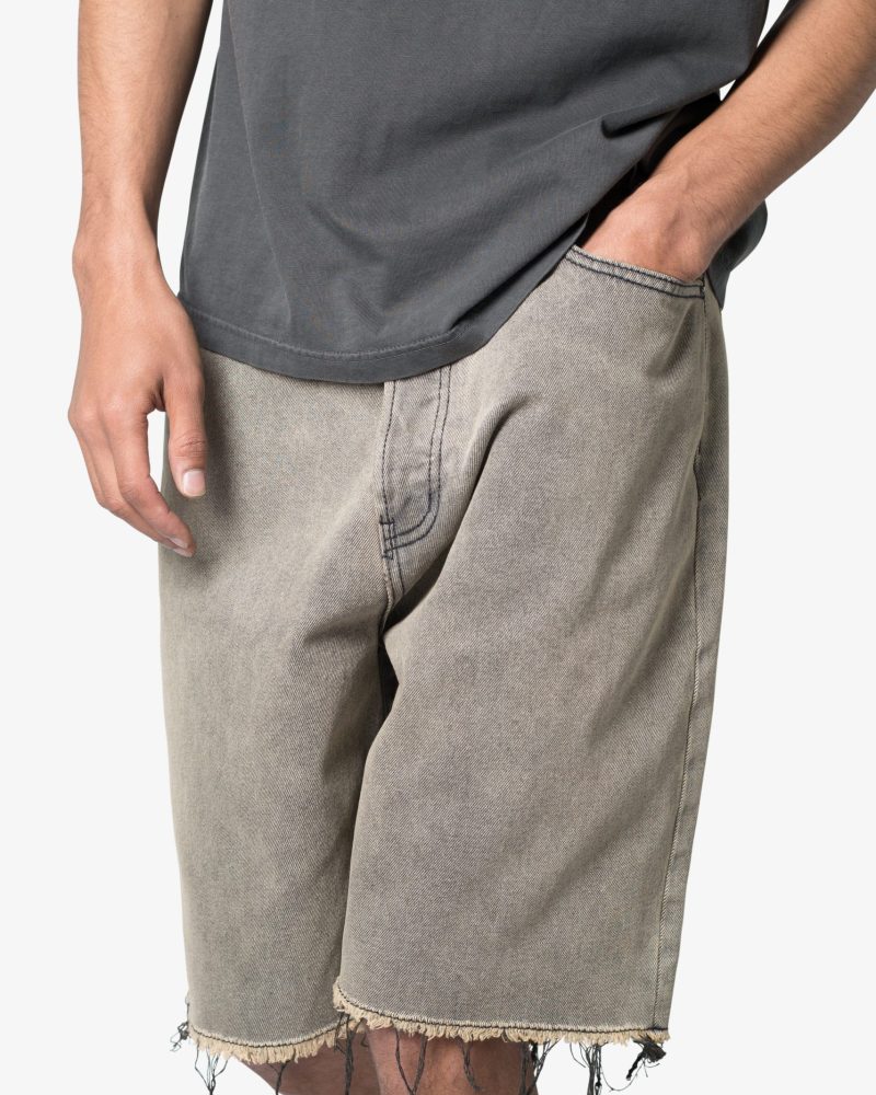 the Distressed Mineral Denim Shorts are designed with a relaxed fit throughout. featuring traditional five pocket denim details. raw hem at the leg opening. and finished with mineral wash.