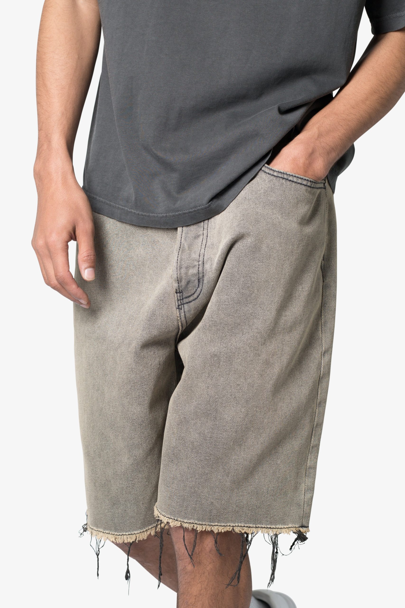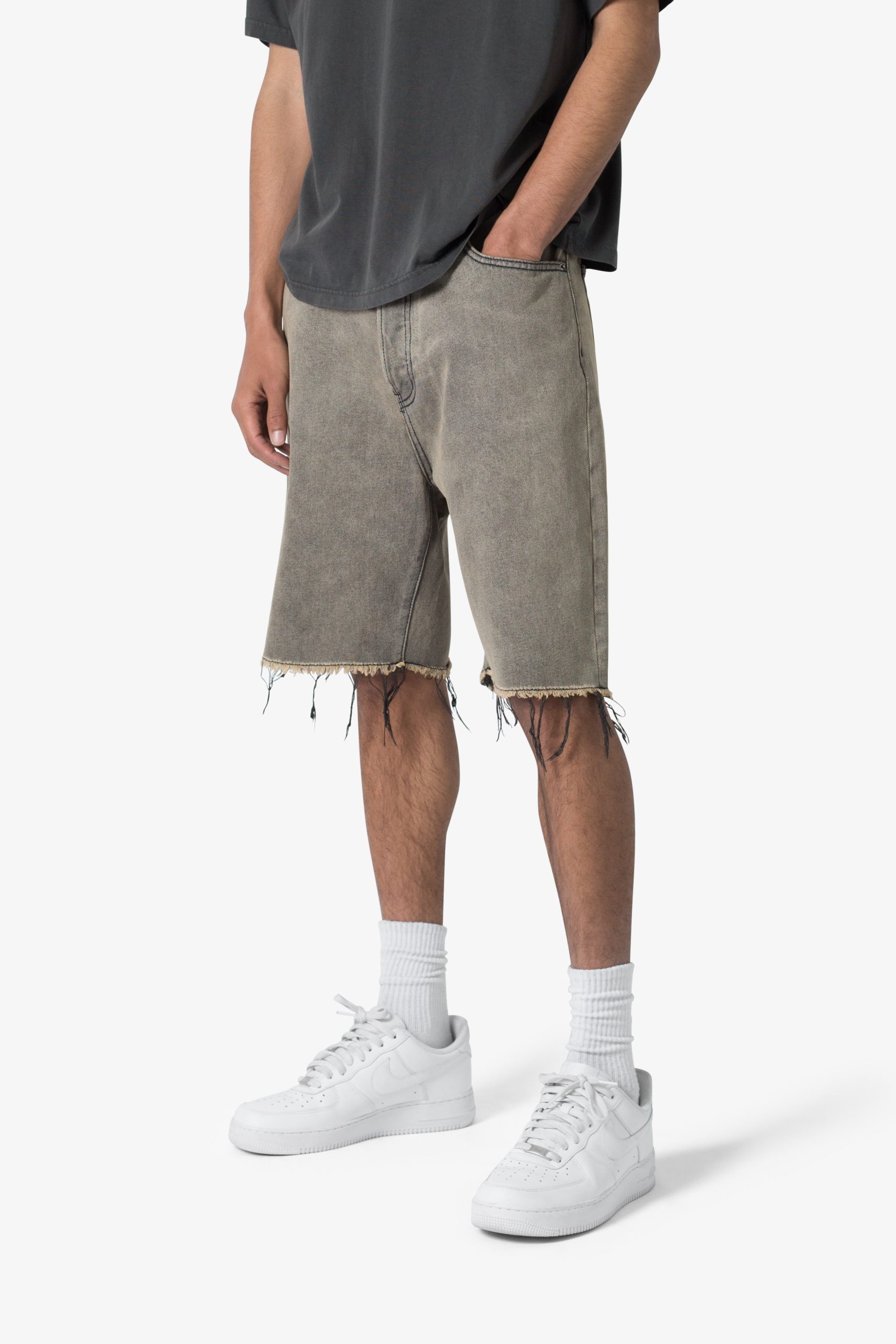 the Distressed Mineral Denim Shorts are designed with a relaxed fit throughout. featuring traditional five pocket denim details. raw hem at the leg opening. and finished with mineral wash.