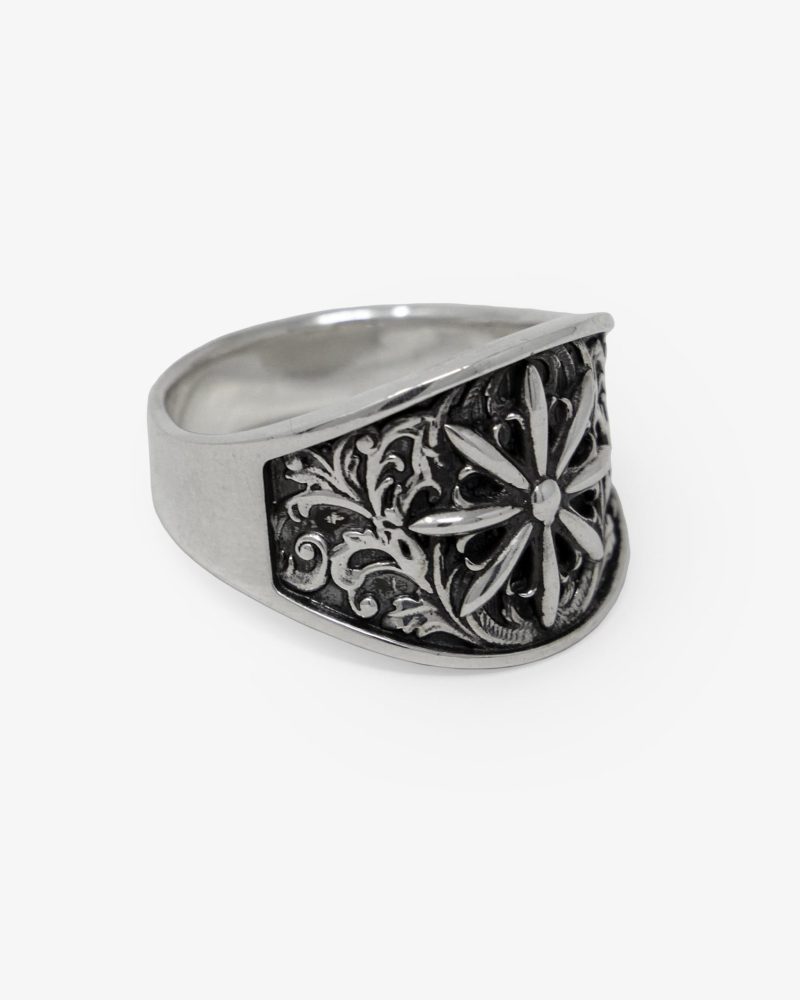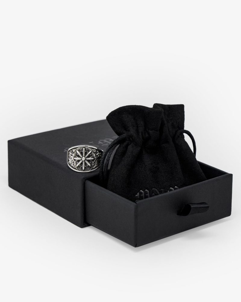 the Embossed Star Sterling Silver Ring is a timeless piece crafted from 100% sterling silver. featuring custom molds for a unique design featuring complex details on a band shape. The vintage patina adds a touch of classic charm and presented in a custom embossed box and velvet bag.
