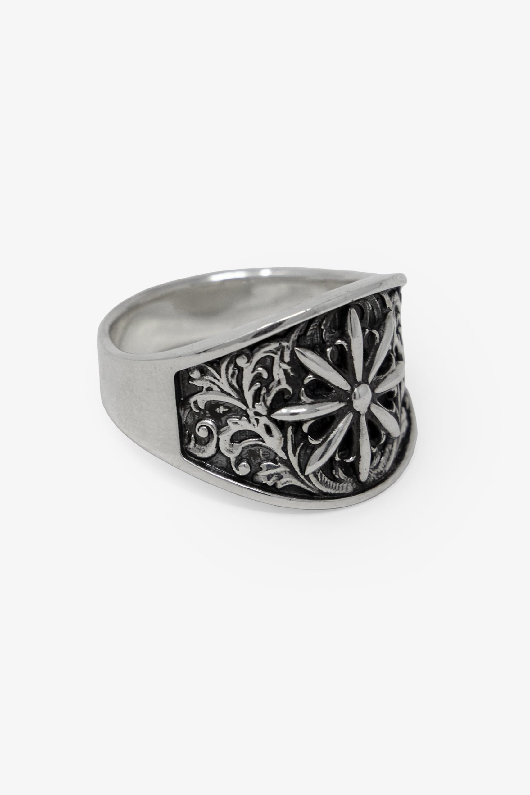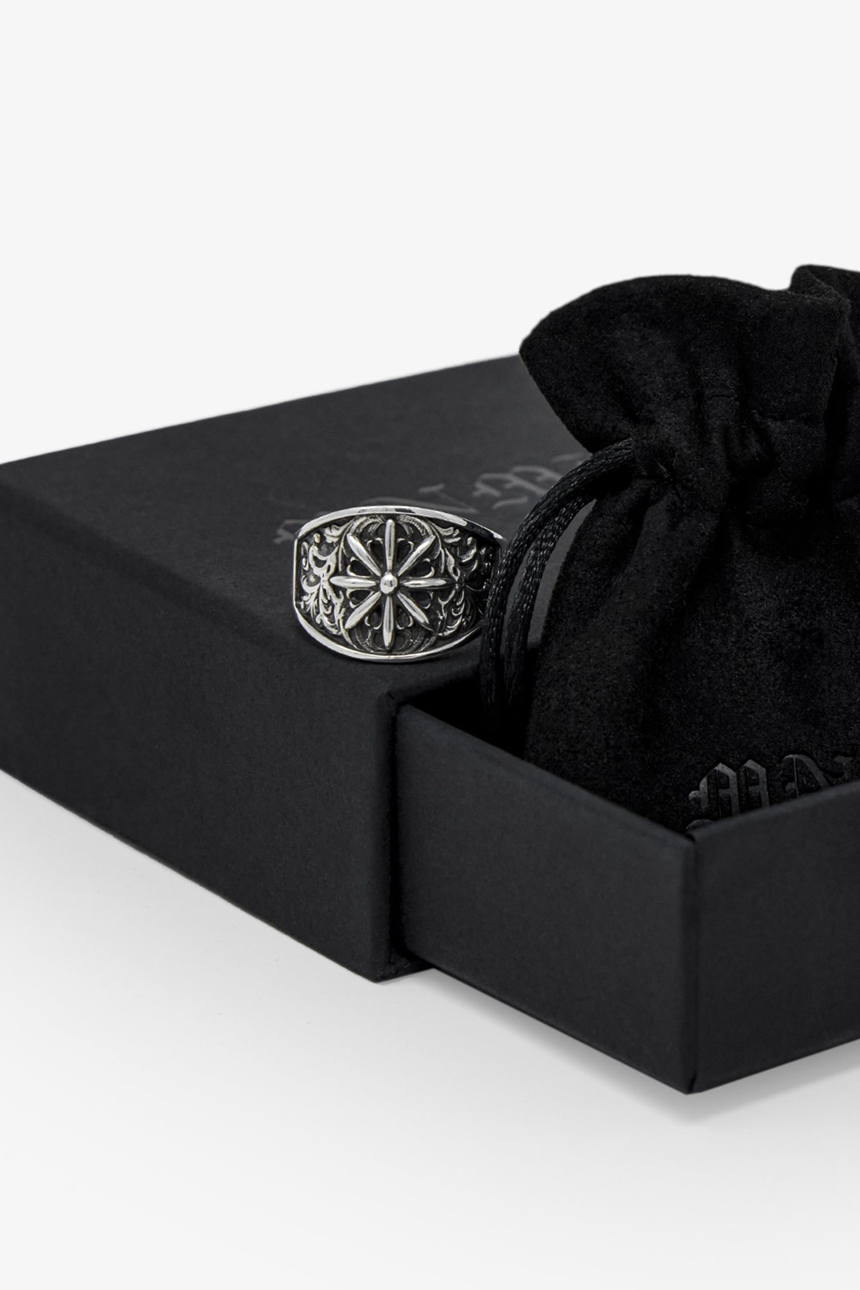 the Embossed Star Sterling Silver Ring is a timeless piece crafted from 100% sterling silver. featuring custom molds for a unique design featuring complex details on a band shape. The vintage patina adds a touch of classic charm and presented in a custom embossed box and velvet bag.