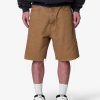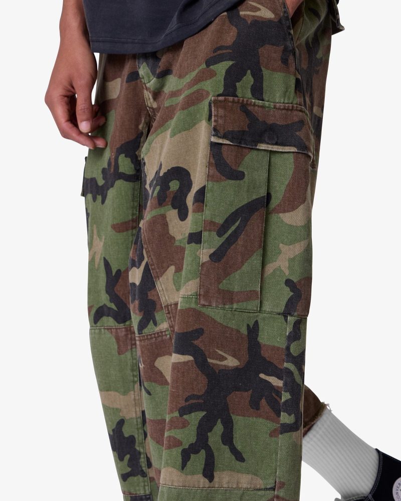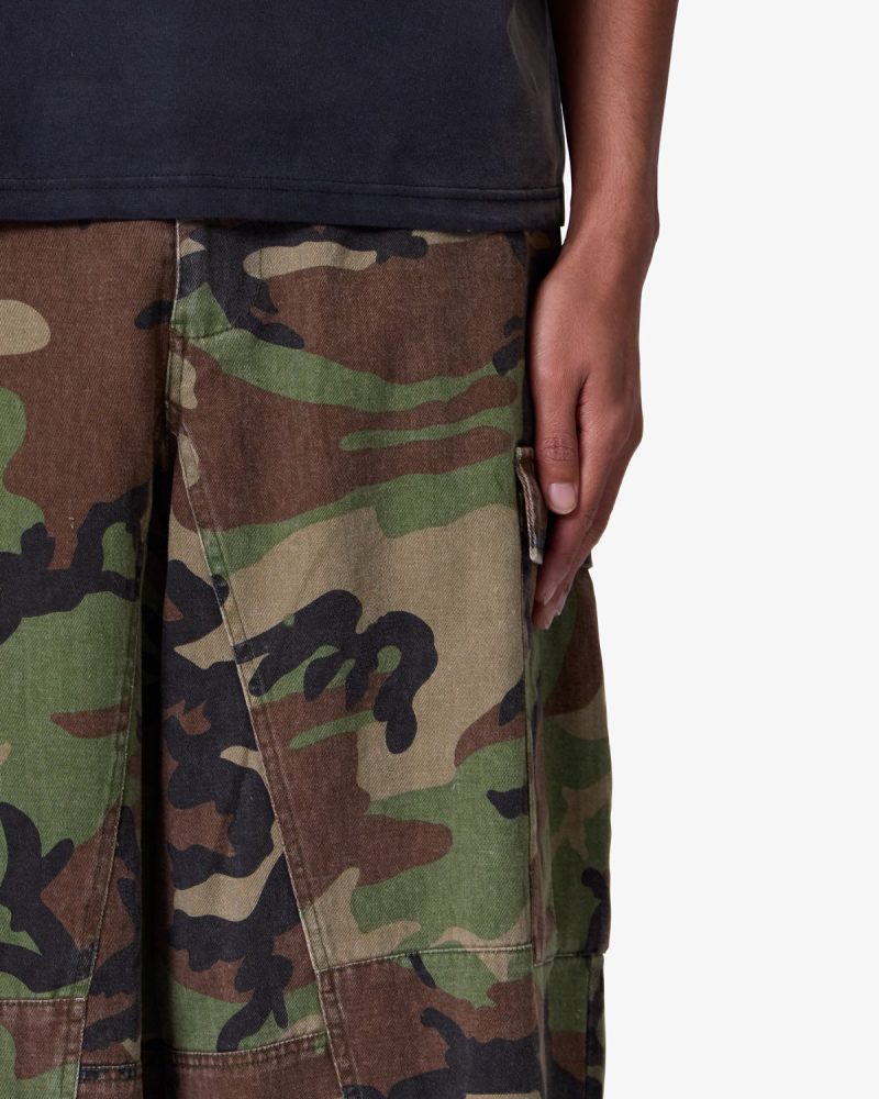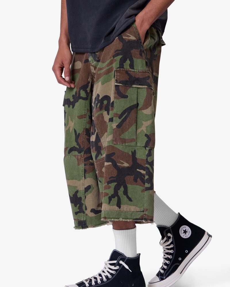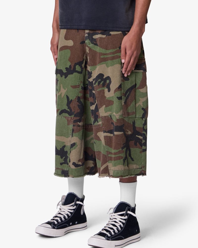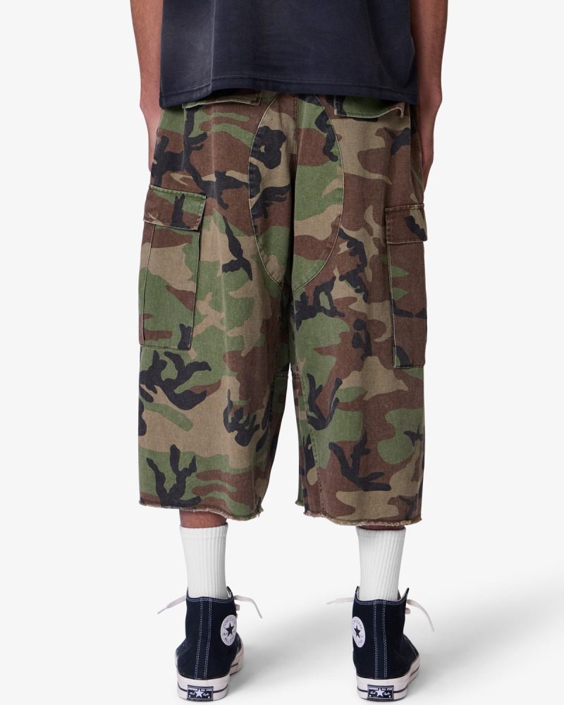 the Extra Long Cargo Shorts are designed with an exaggerated baggy fit throughout with an extended length. cargo pockets at the side seam. a button fly. and is finished with a raw hem at the leg opening.