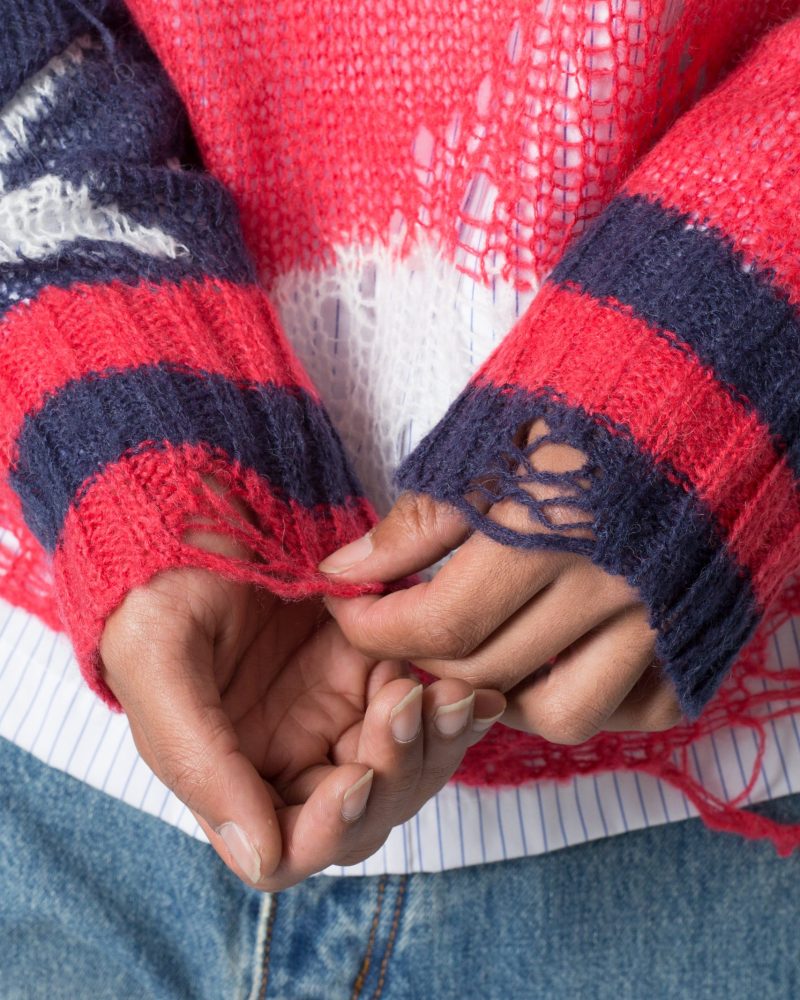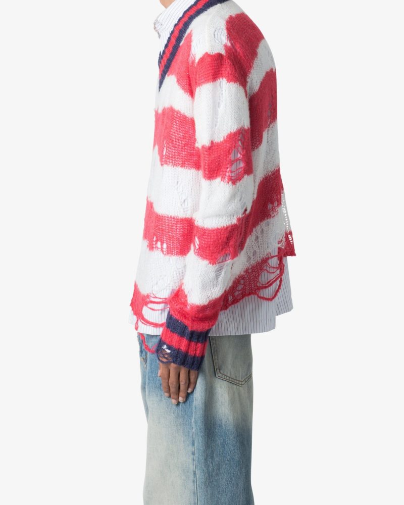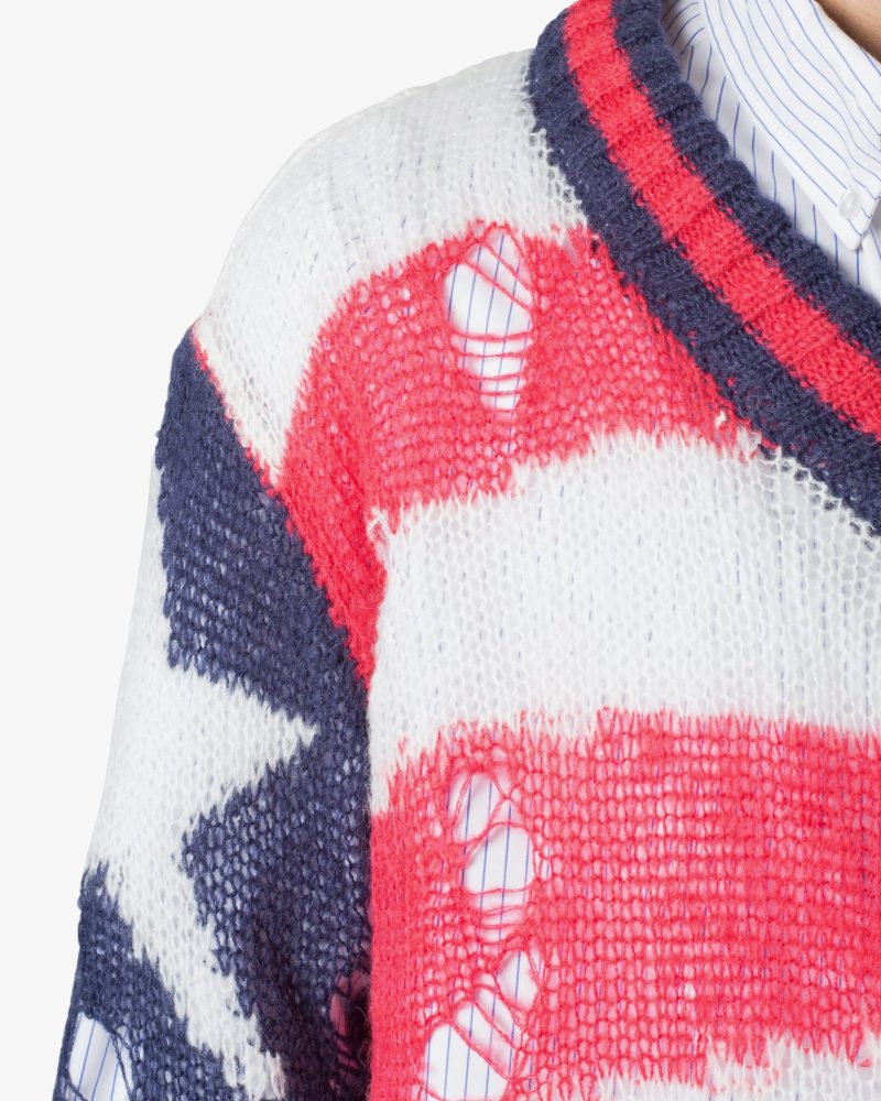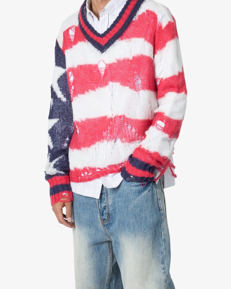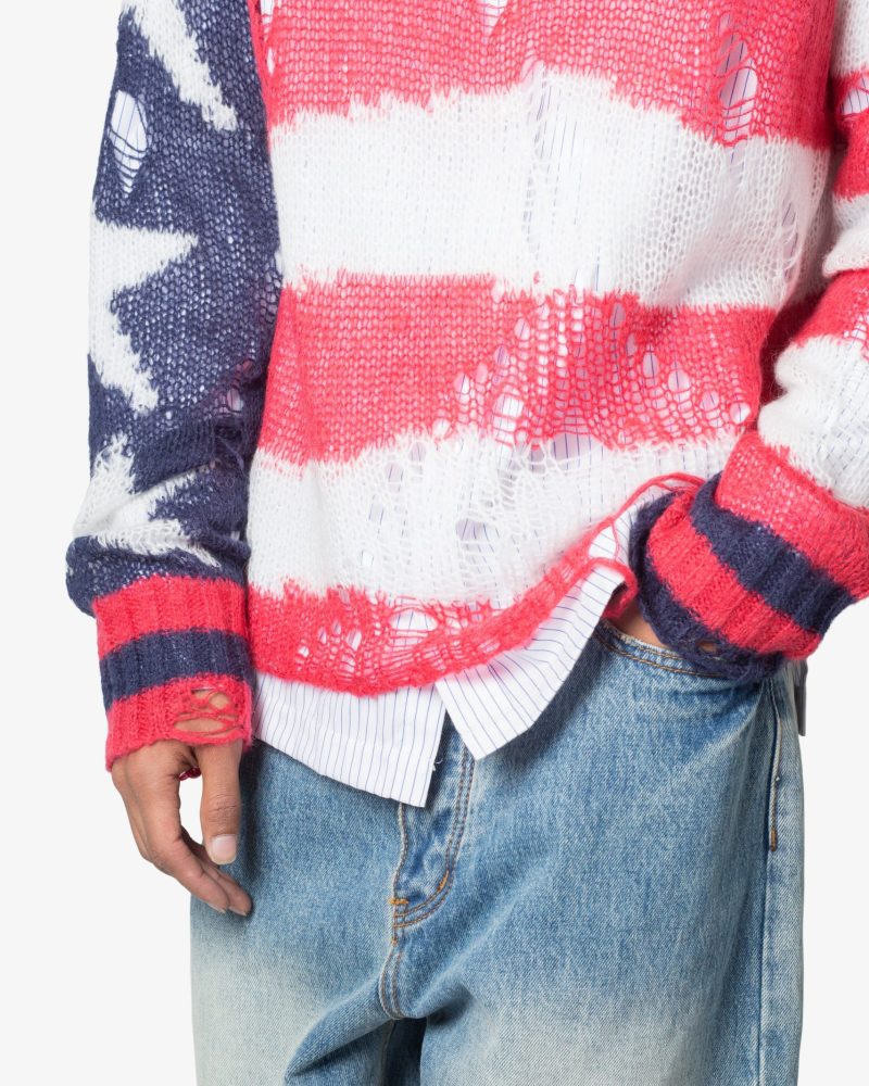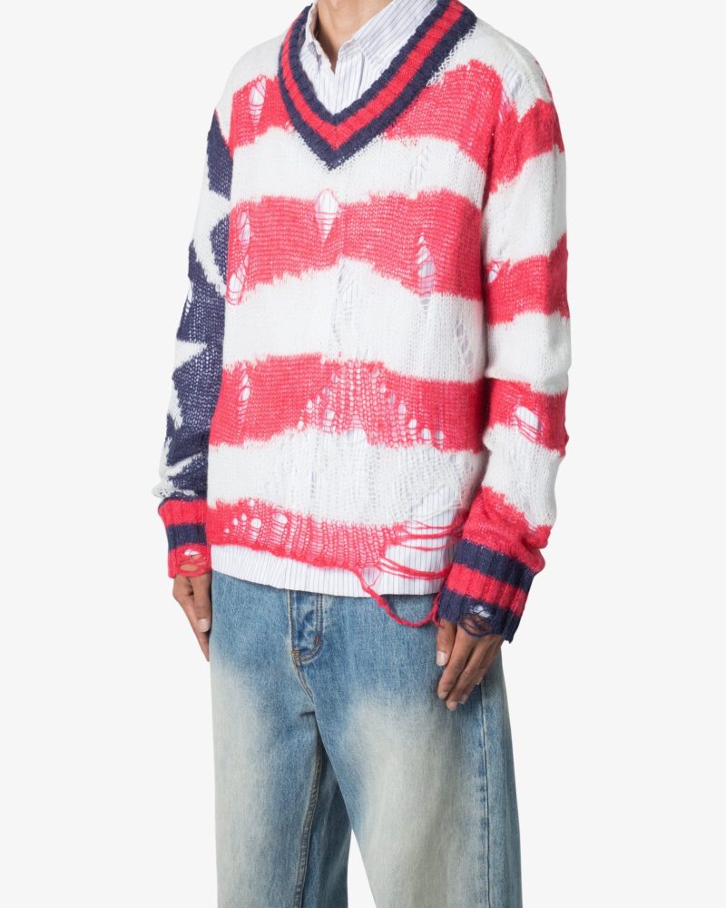 the Flag Loose Knitted Sweater is a custom knit sweater that is constructed from a synthetic blend yarn in a relaxed fit. multi color stripe details throughout. a very loose knit. and is finished with runs and distressing details throughout
