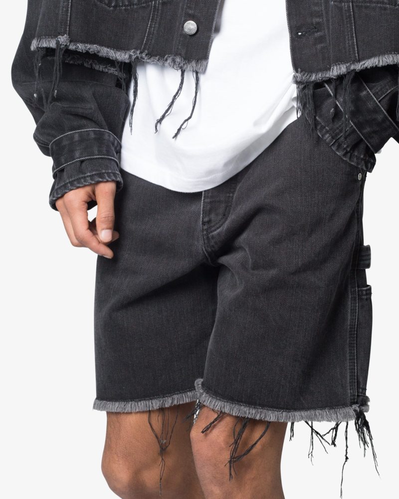 the Frayed Denim Shorts are designed with a relaxed fit throughout. featuring a garment washed denim fabric. and finished off with raw hem.