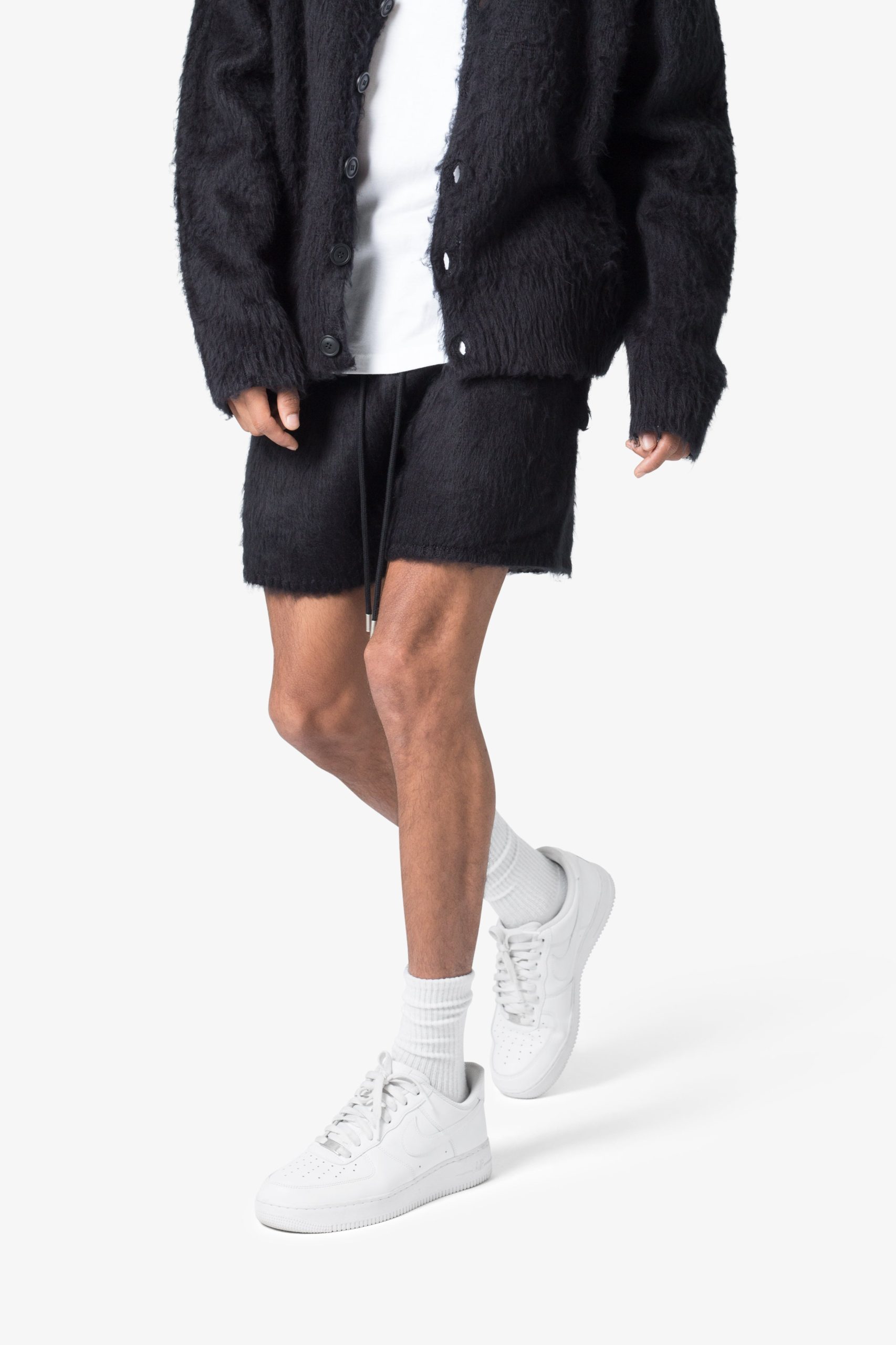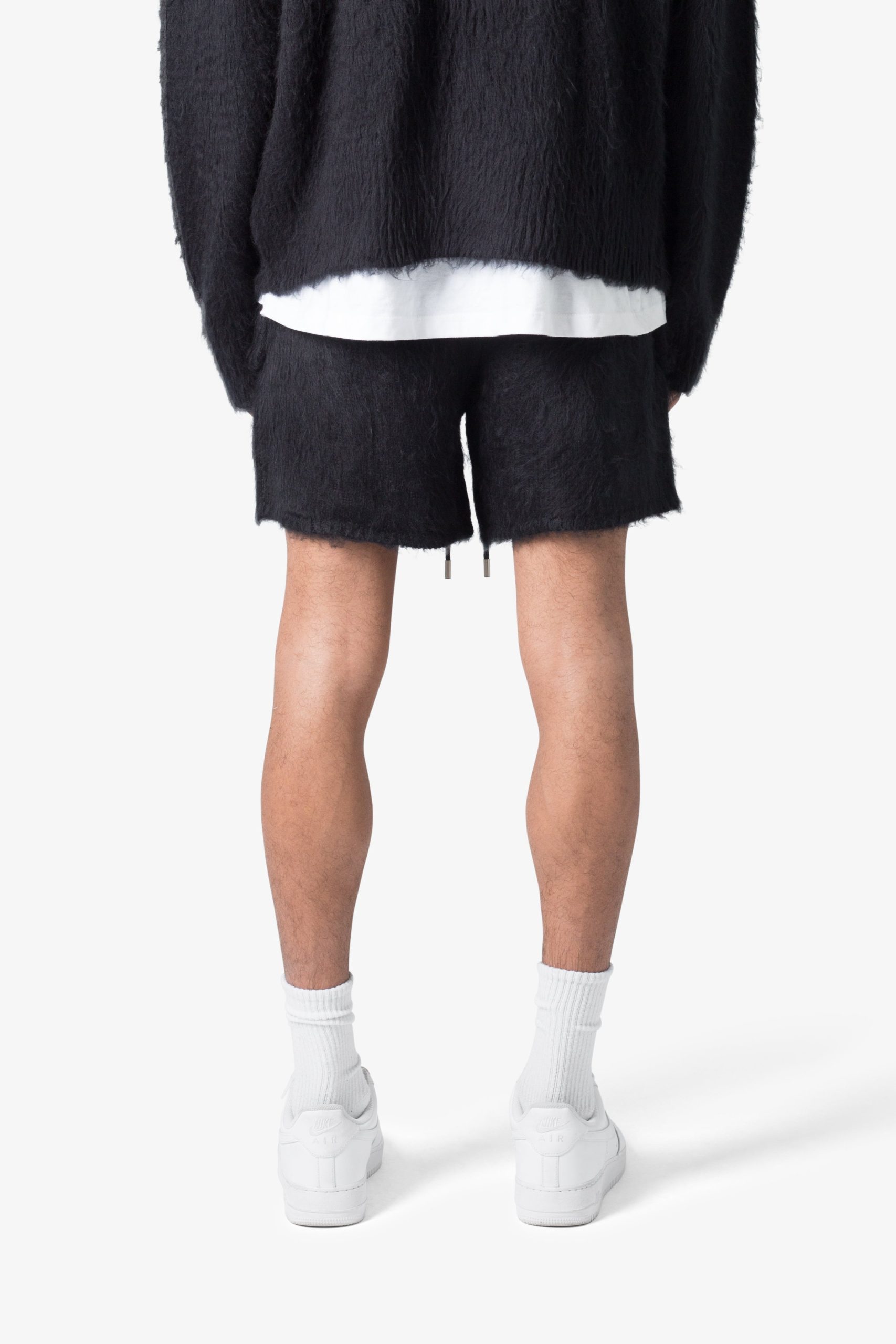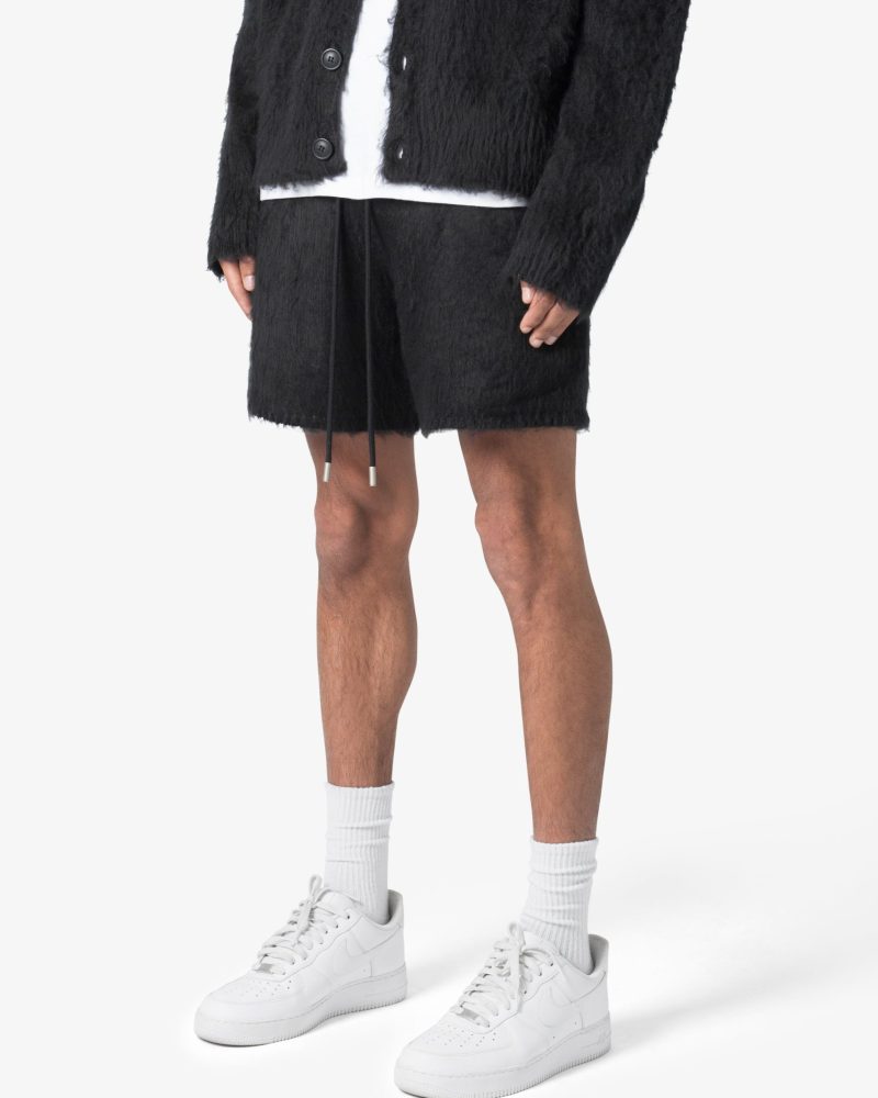 the Fuzzy Sweatshorts are constructed in a a custom acrylic sweater knit. The shorts feature an elasticized waist in self fabric. pockets at the outseam. a contrasting drawstring. and is finished with brushing on the outside to provide a fuzzy texture.