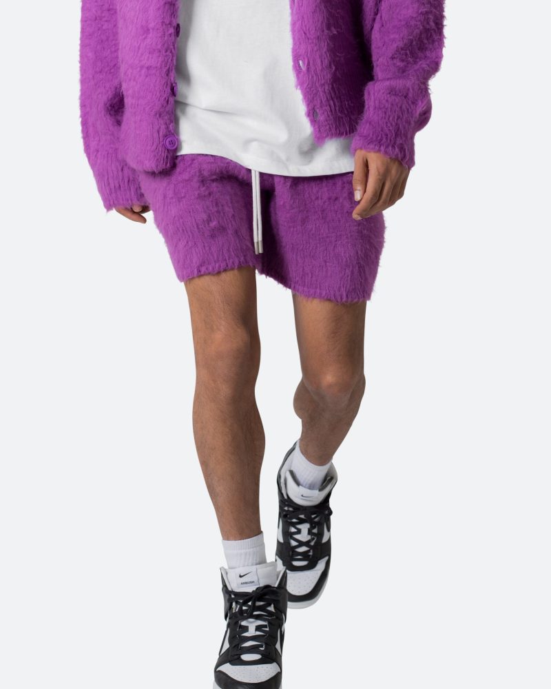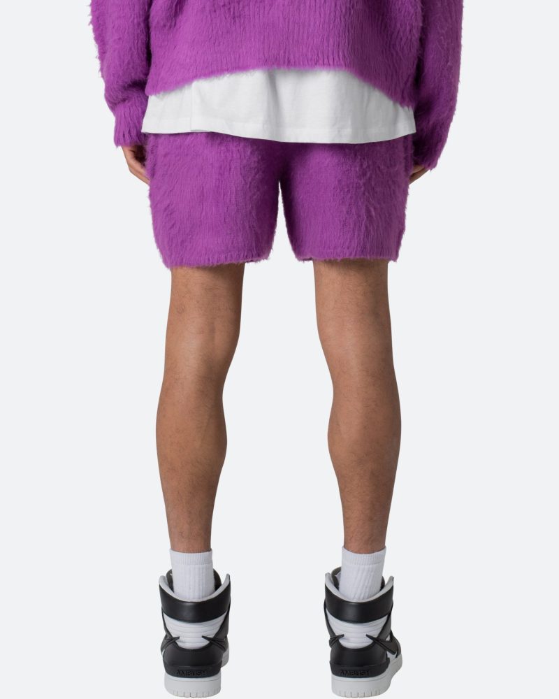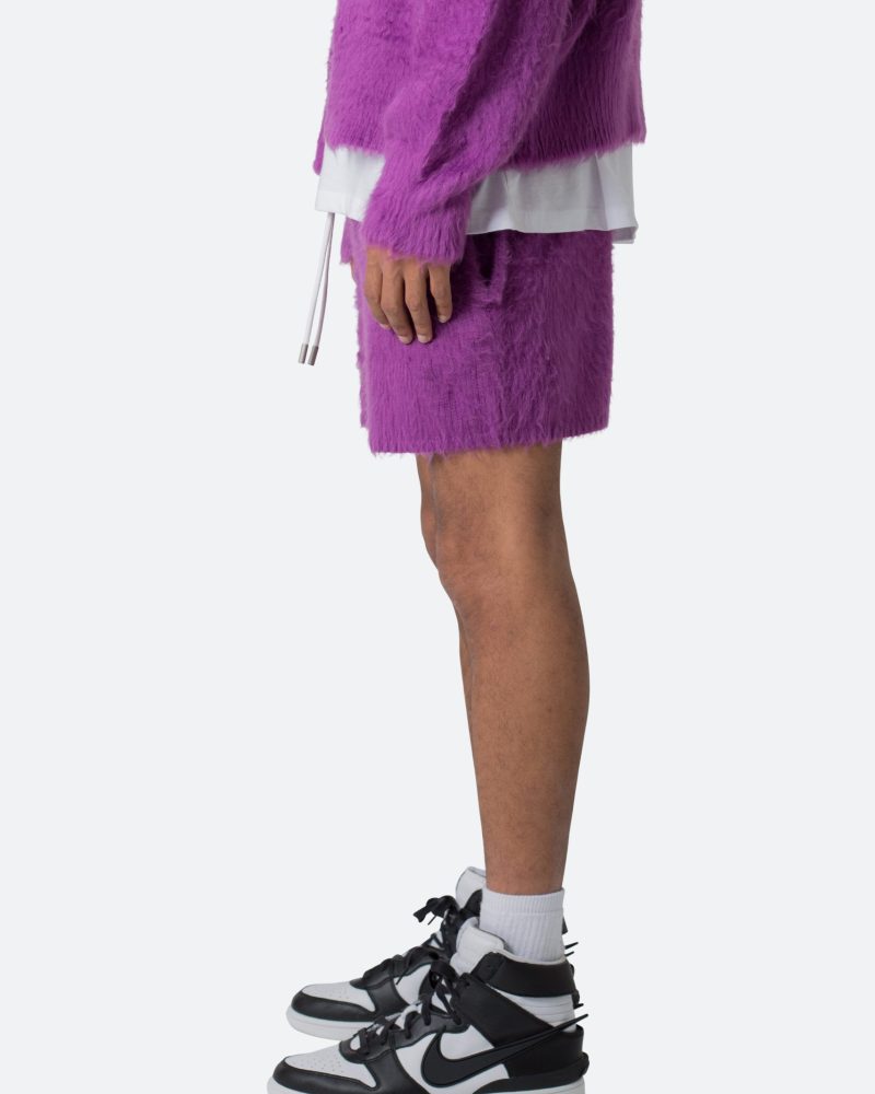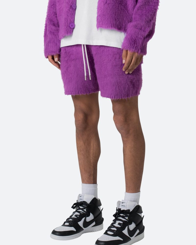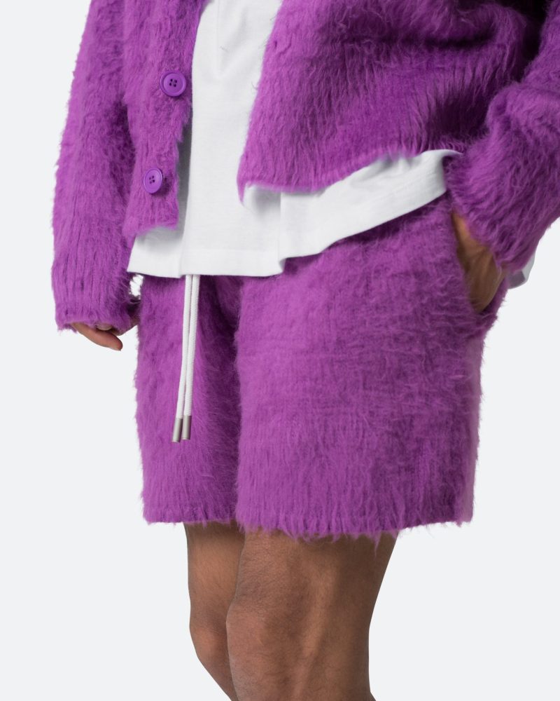 the Fuzzy Sweatshorts are constructed in a a custom acrylic sweater knit. The shorts feature an elasticized waist in self fabric. pockets at the outseam. a contrasting drawstring. and is finished with brushing on the outside to provide a fuzzy texture.