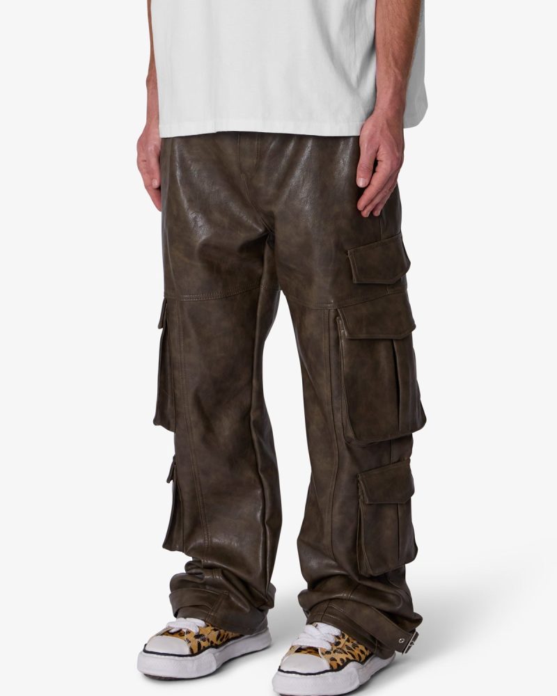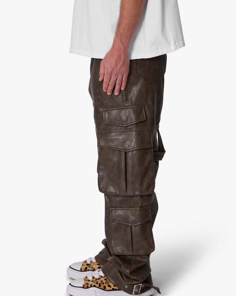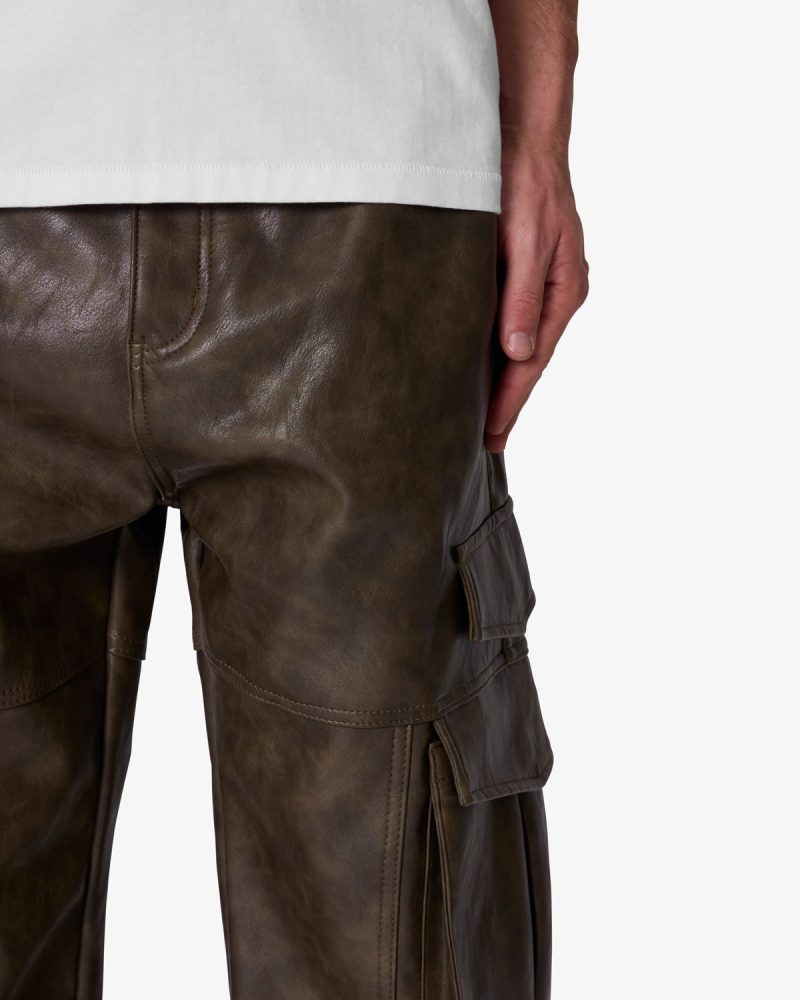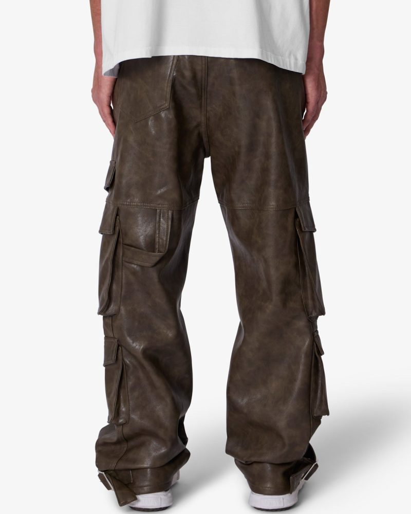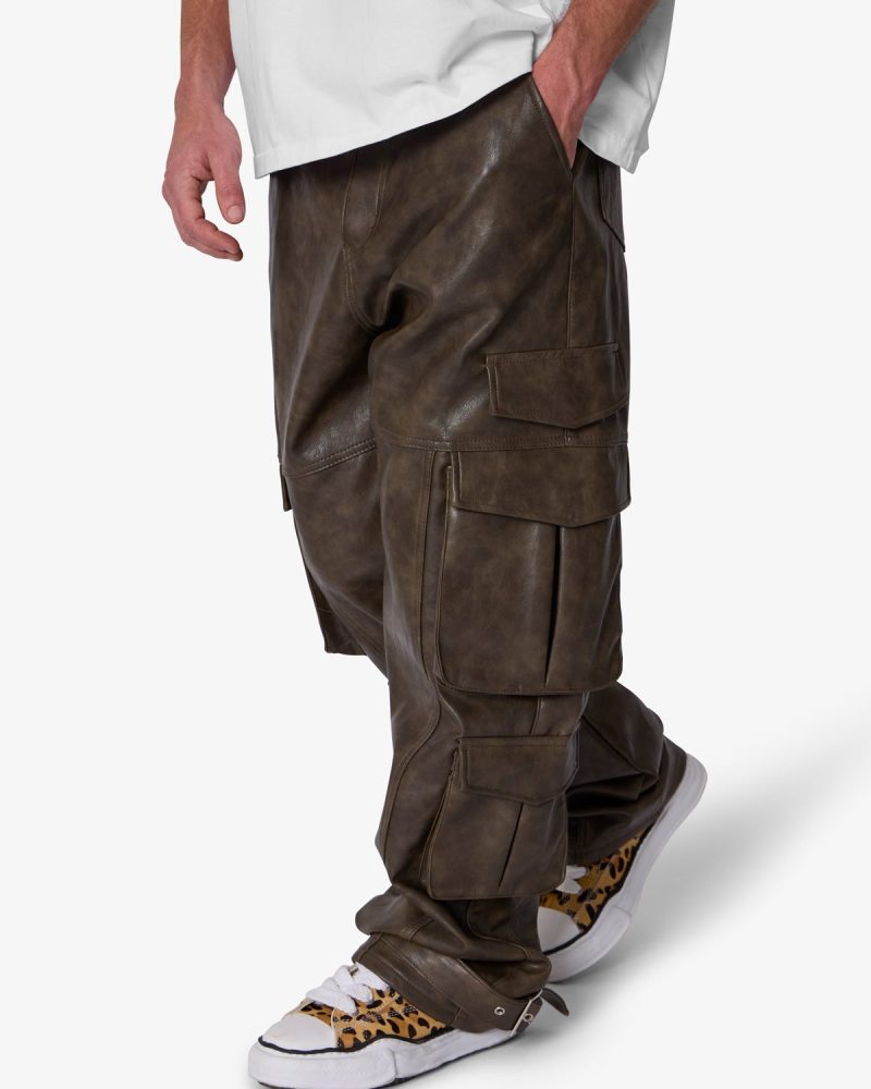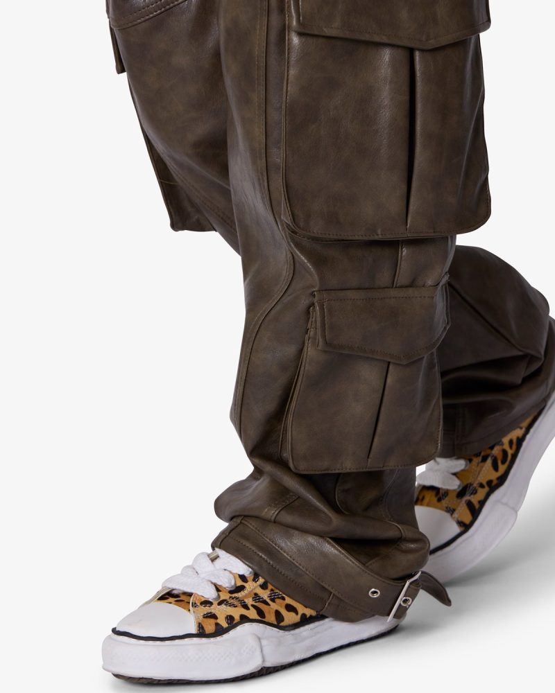 the G33 Leather Cargo Pants are designed with an oversized. baggy fit. constructed from a washed synthetic leather fabric. hidden snap closures on the cargo pockets throughout. and finished with a zipper fly.