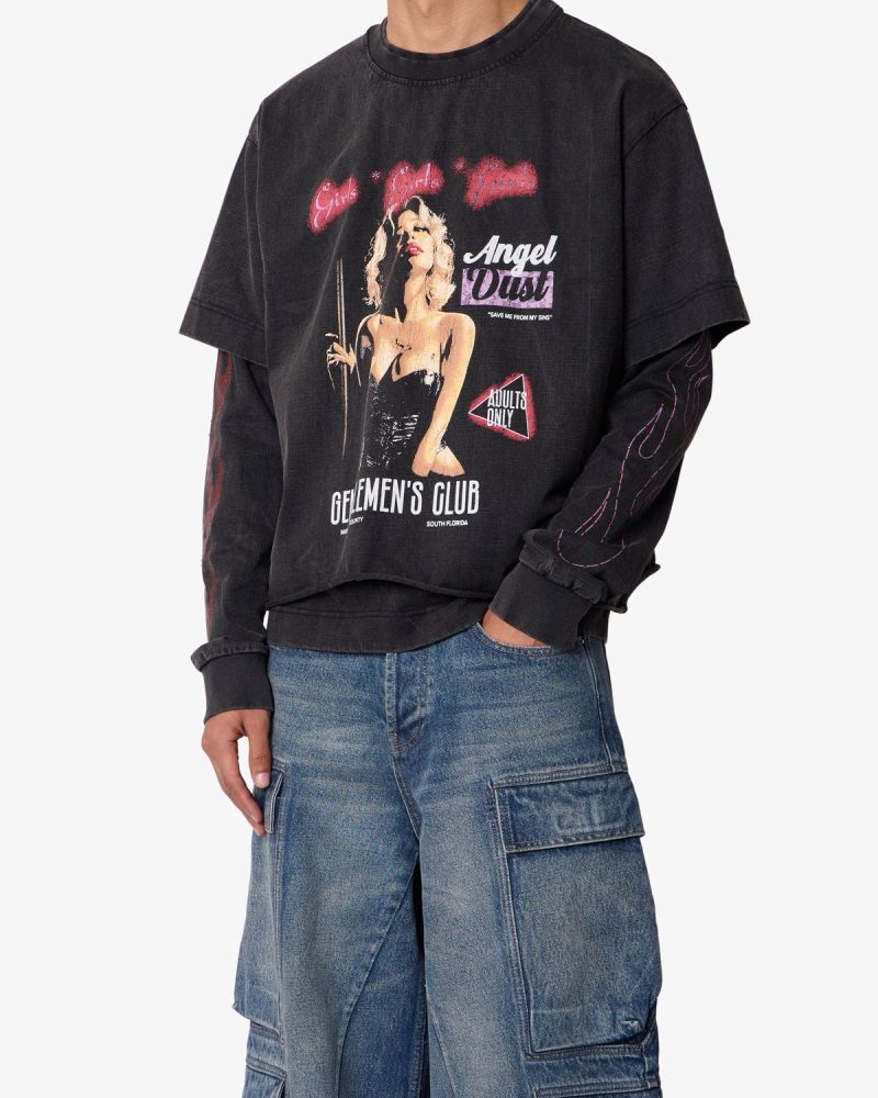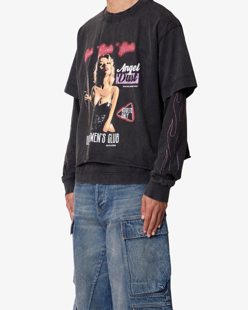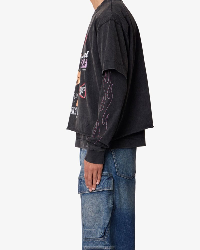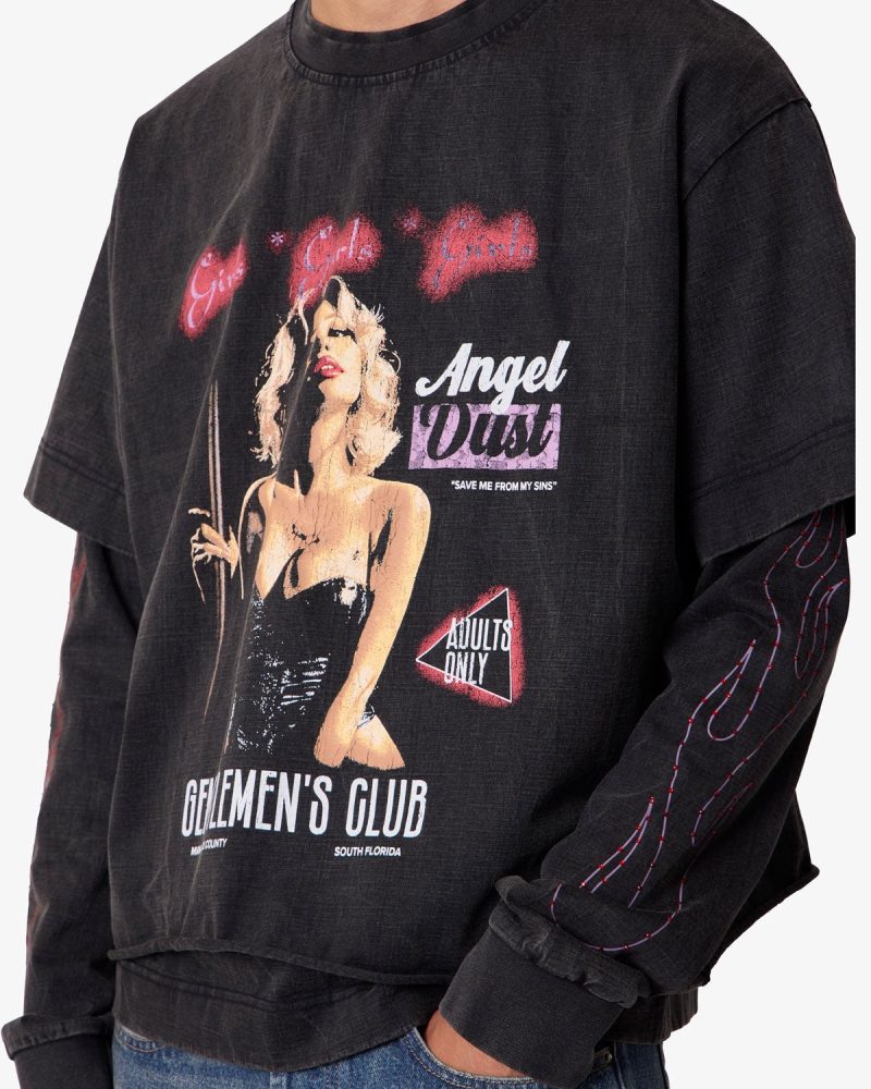 Constructed from 100% cotton jersey with an enzyme wash. the Gentlemens Club Printed L/S Tee features a double layer design with long sleeves and a raw hem. Finished with a screen print graphic on the front and flame detail prints on the sleeves.