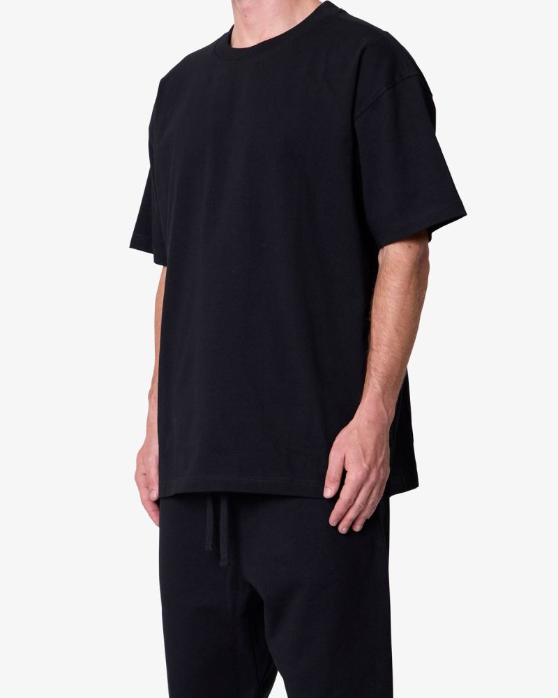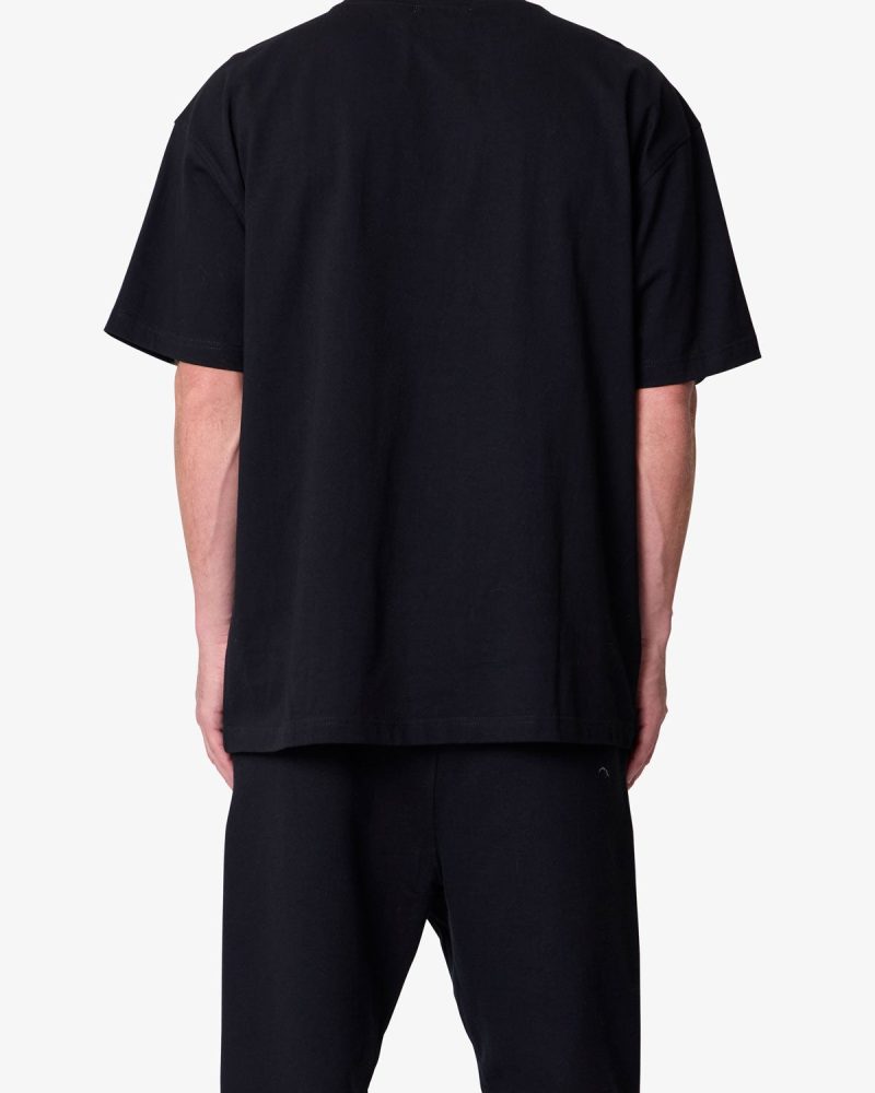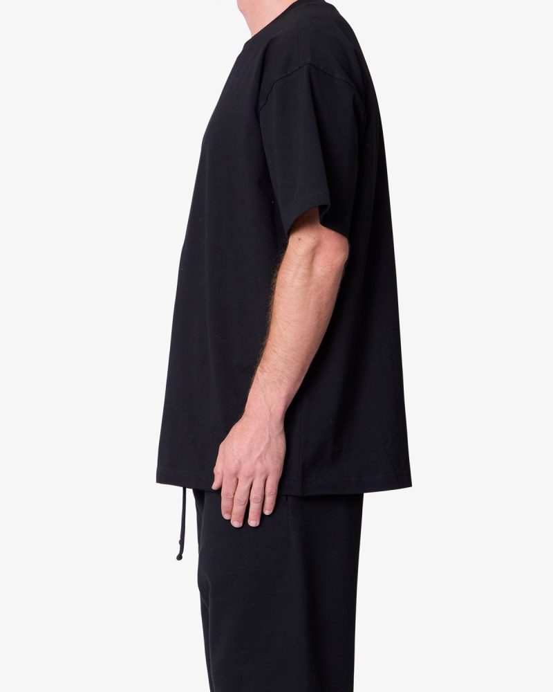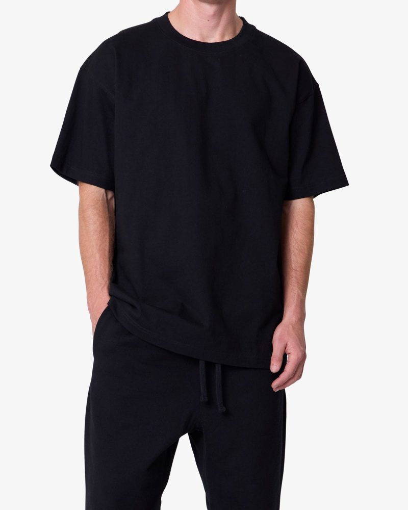 Constructed from heavyweight 300 gsm cotton jersey. the Heavy Basic Tee features a relaxed fit with dropped shoulders. Designed with a ribbed neck and coverstitched hems. the garment-washed fabric offers a structured drape ideal for layering or standalone wear.
