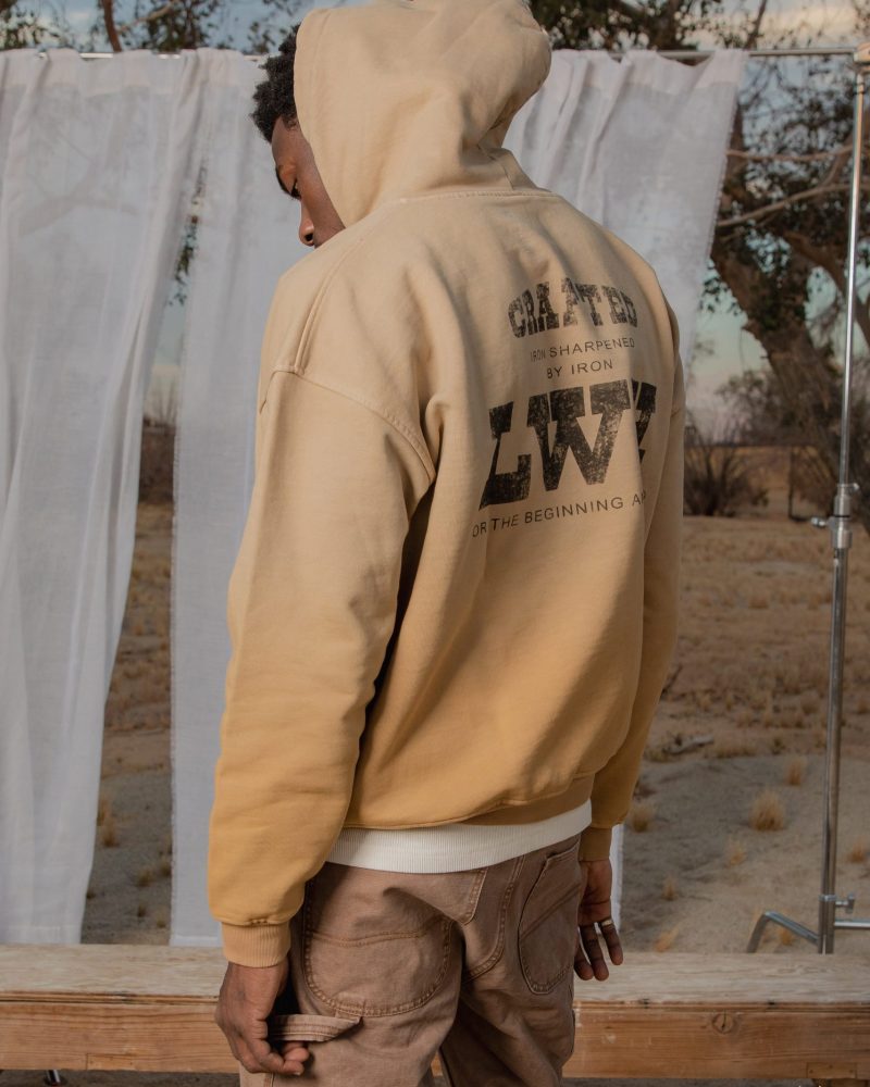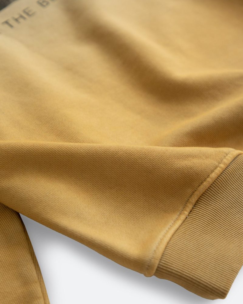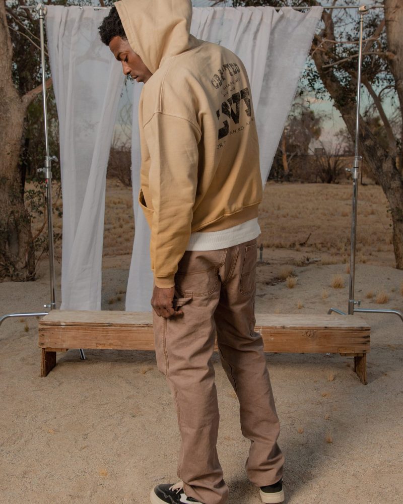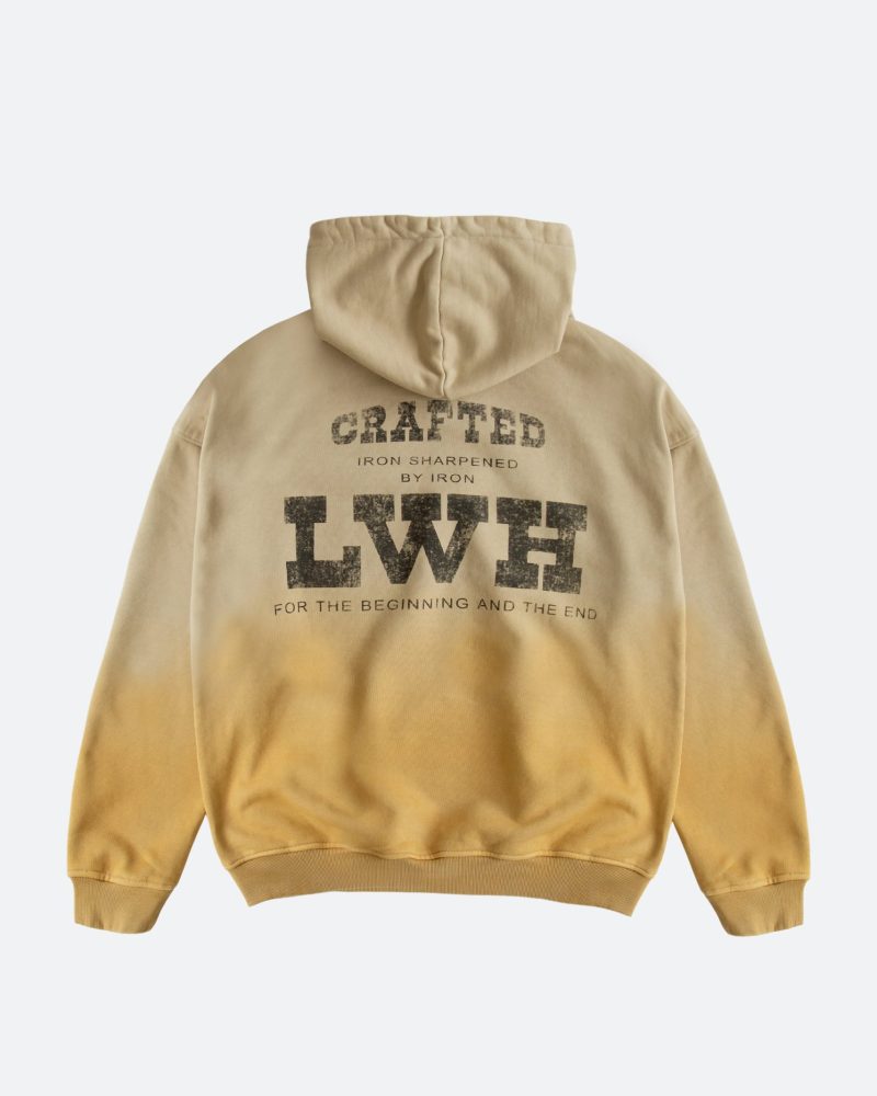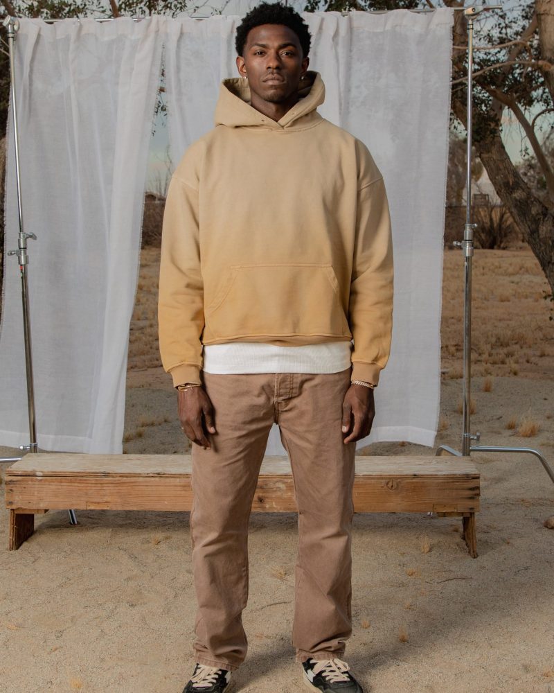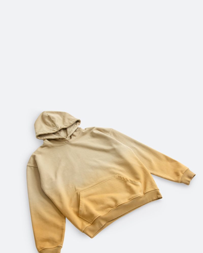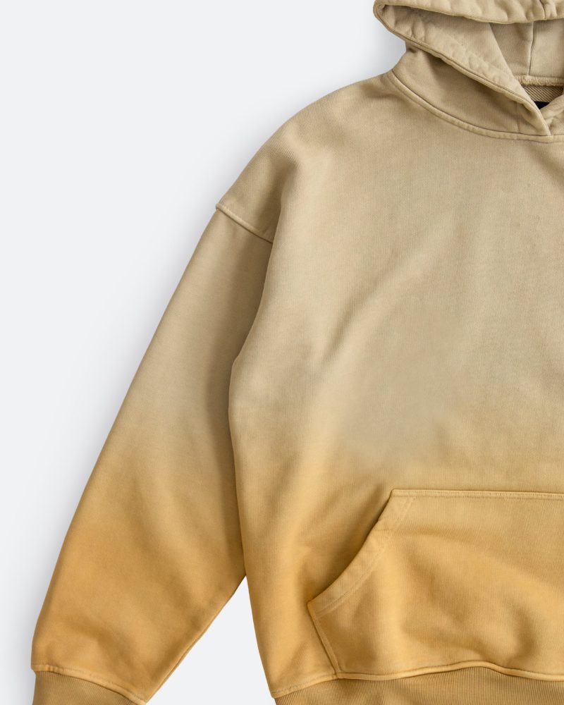 the Heavy Gradient Hoodie features a relaxed fit constructed with premium brushed french terry treated with our unique vintage wash process to achieve the ombré sun fading effect. It is cut to fit boxy with a drop shoulder and finished with loose ribbing at the waist for decreased tee shirt piling. The front pouch pocket and body match the ribbing at the waist and wrists and finished with a single color vintage print on the back.