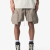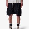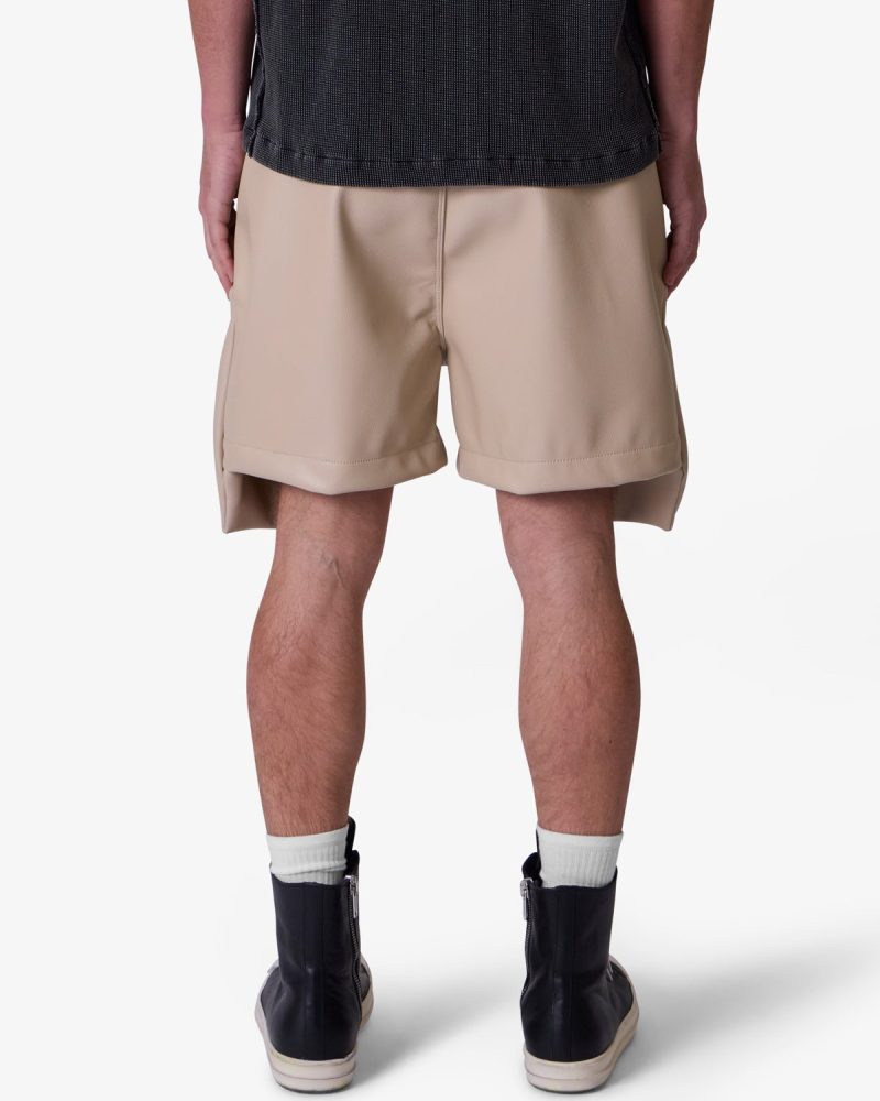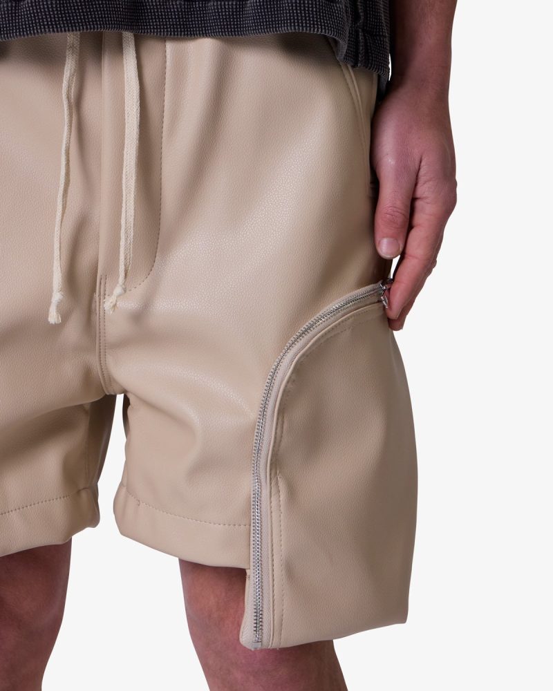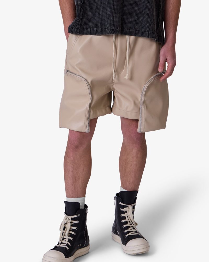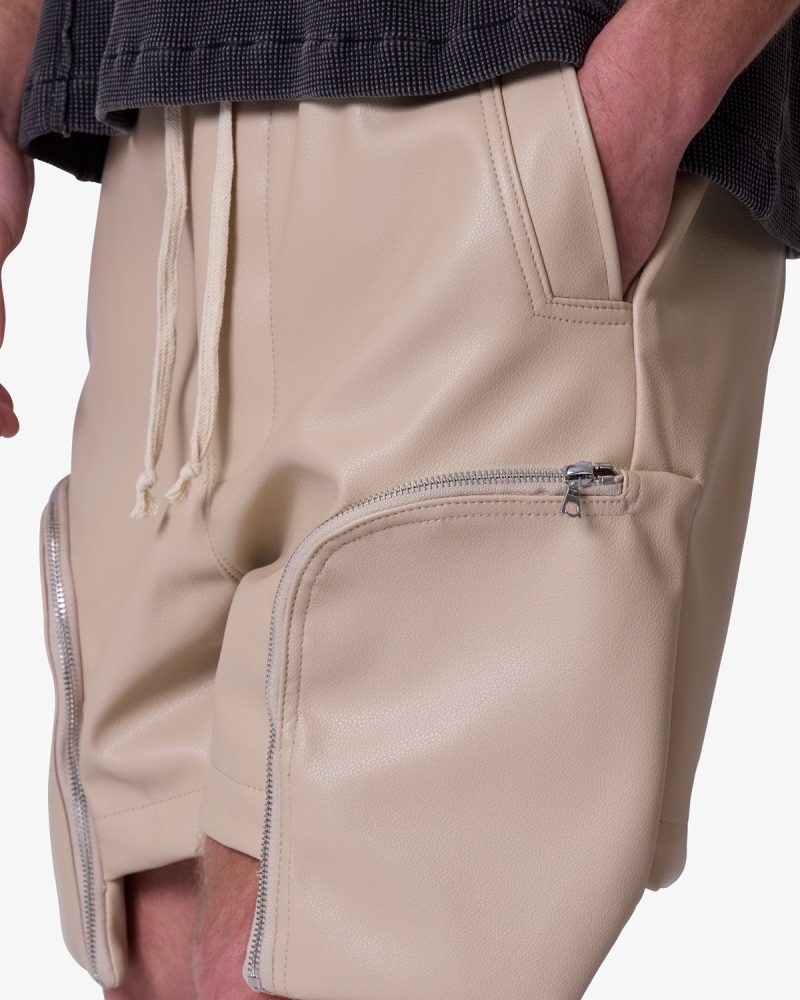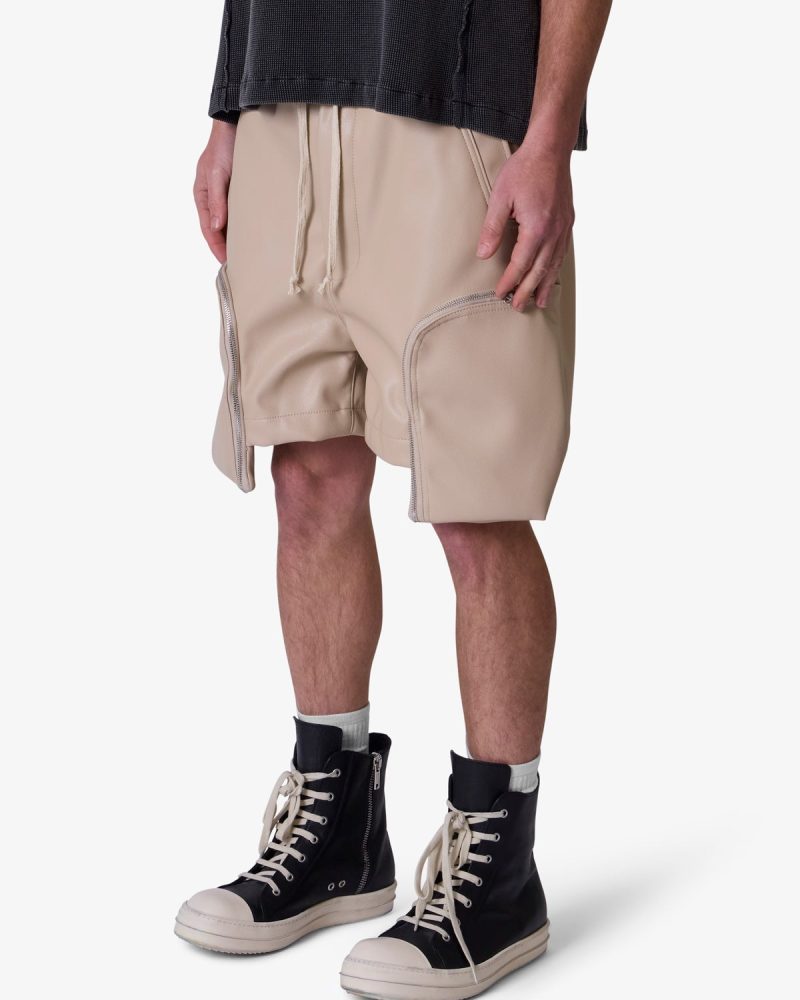 the Leather Pocket Geo Shorts are constructed from a faux leather fabric in a baggy fit. The shorts feature an elasticized waist. welt pockets. exaggerated zipper pockets that extend past the leg opening with grommet details. and finished with a contrasting cotton drawcords.