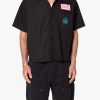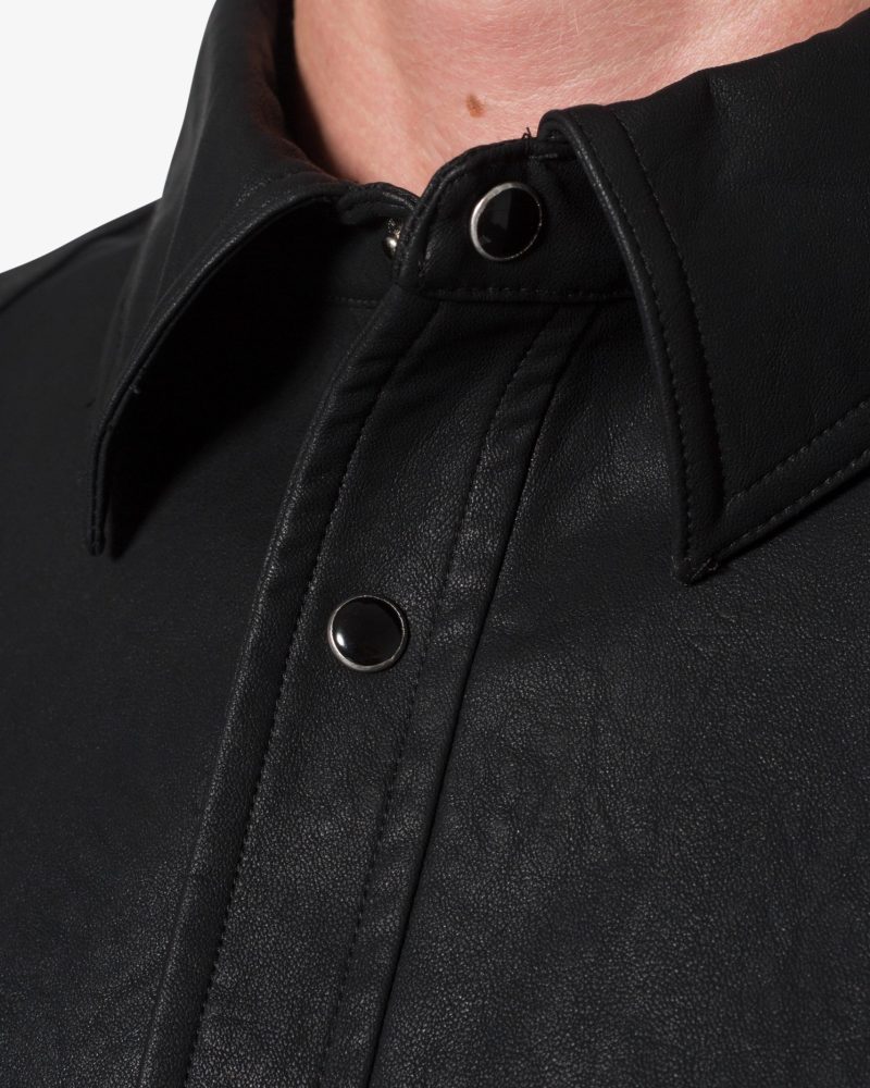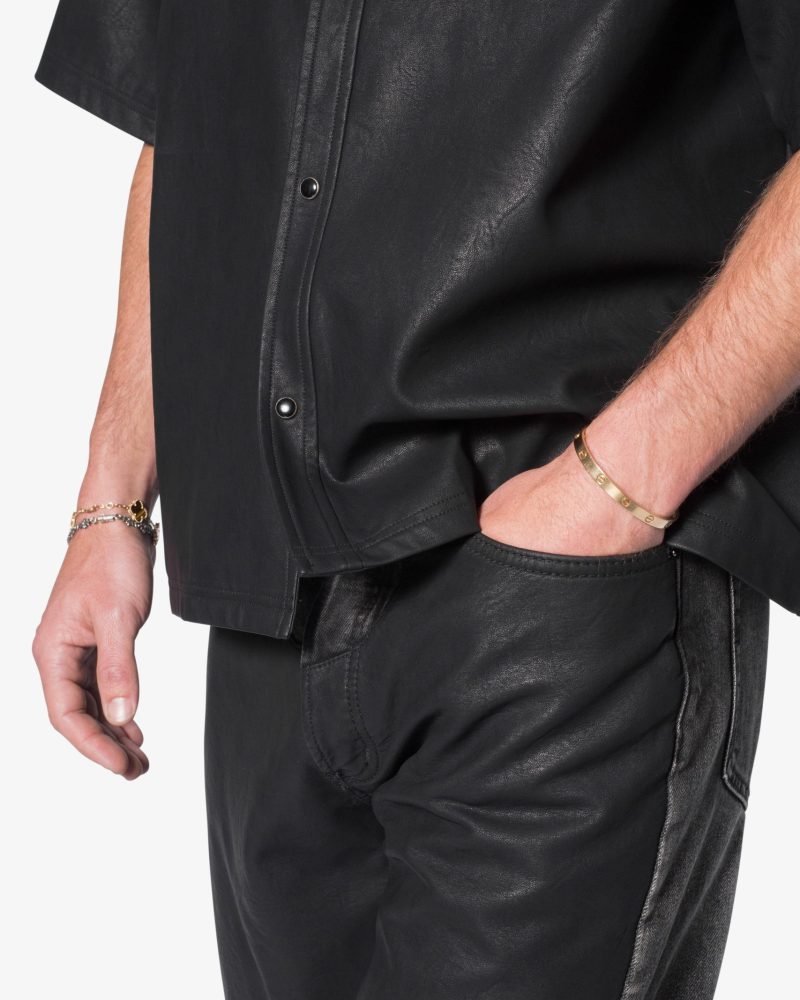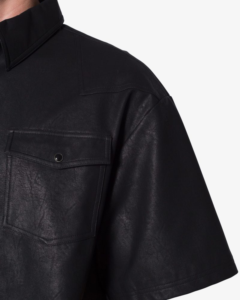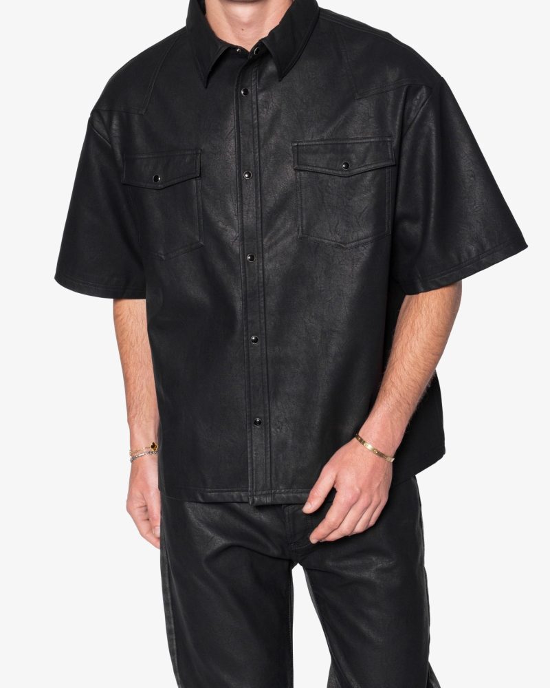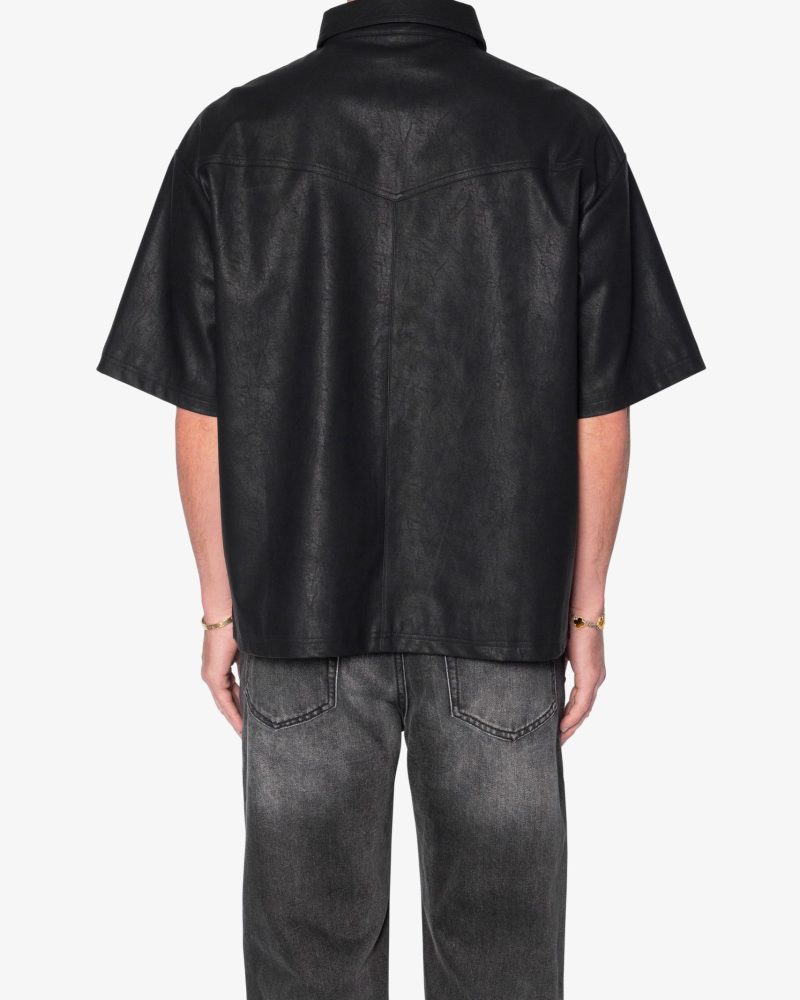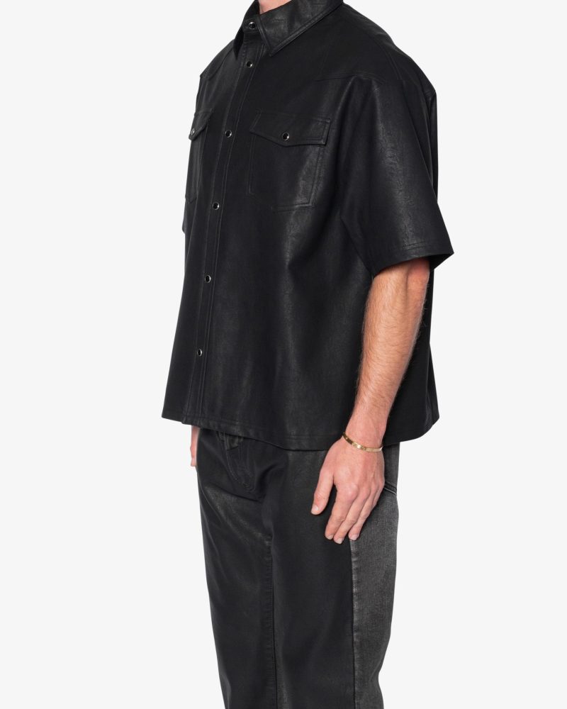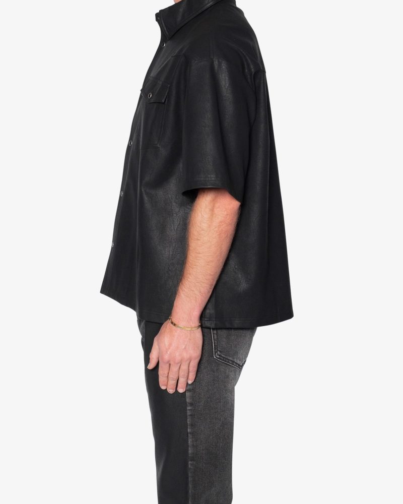 the Leather S/S Shirt is made from a faux leather fabric. The relaxed-fit shirt features a button placket. a drop shoulder. and is finished black snap buttons.