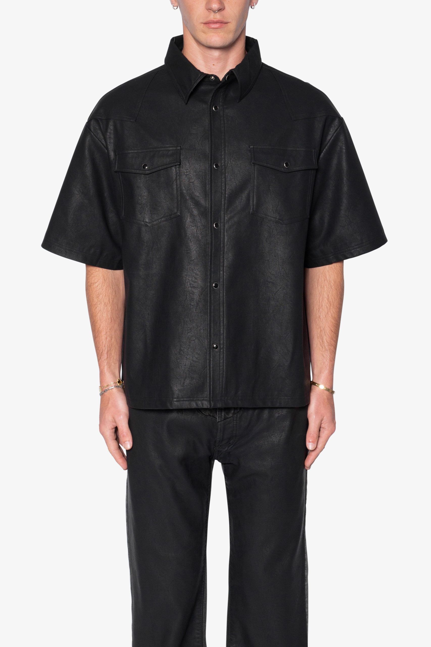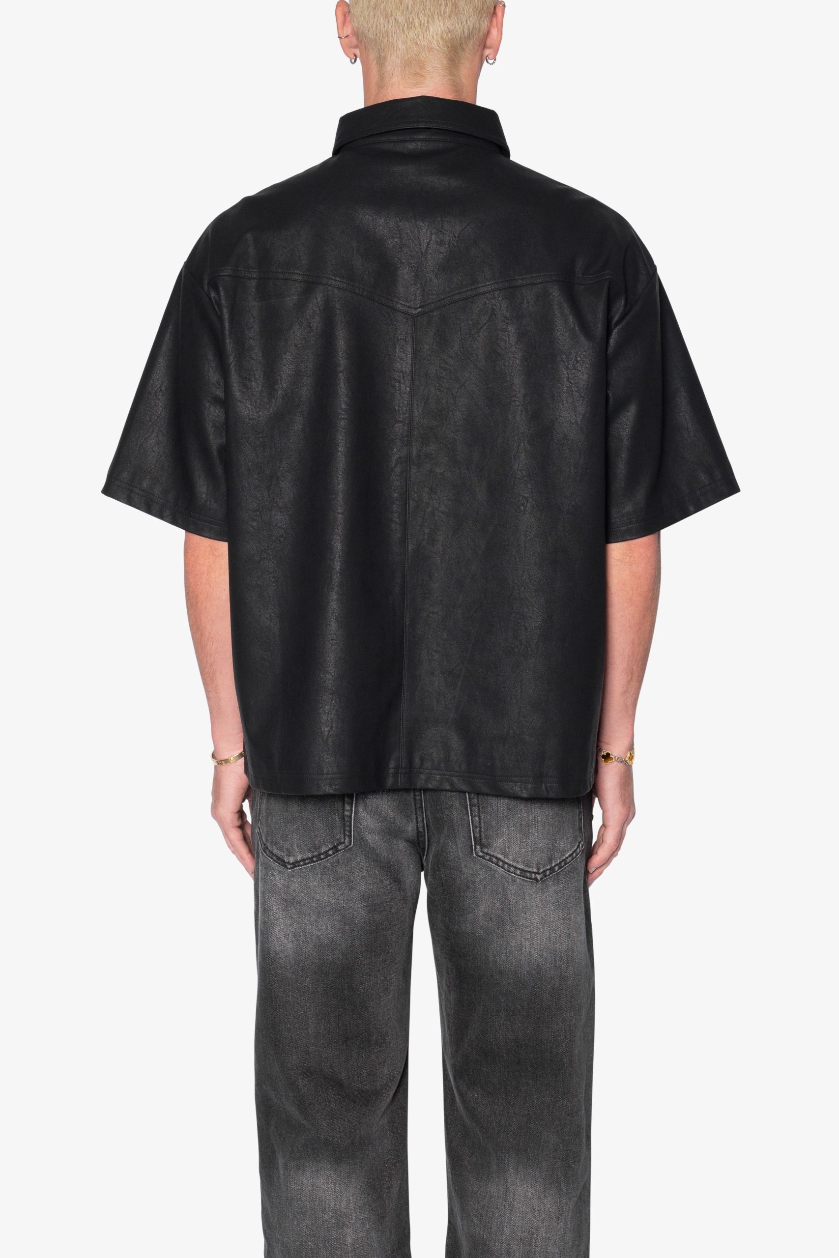 the Leather S/S Shirt is made from a faux leather fabric. The relaxed-fit shirt features a button placket. a drop shoulder. and is finished black snap buttons.