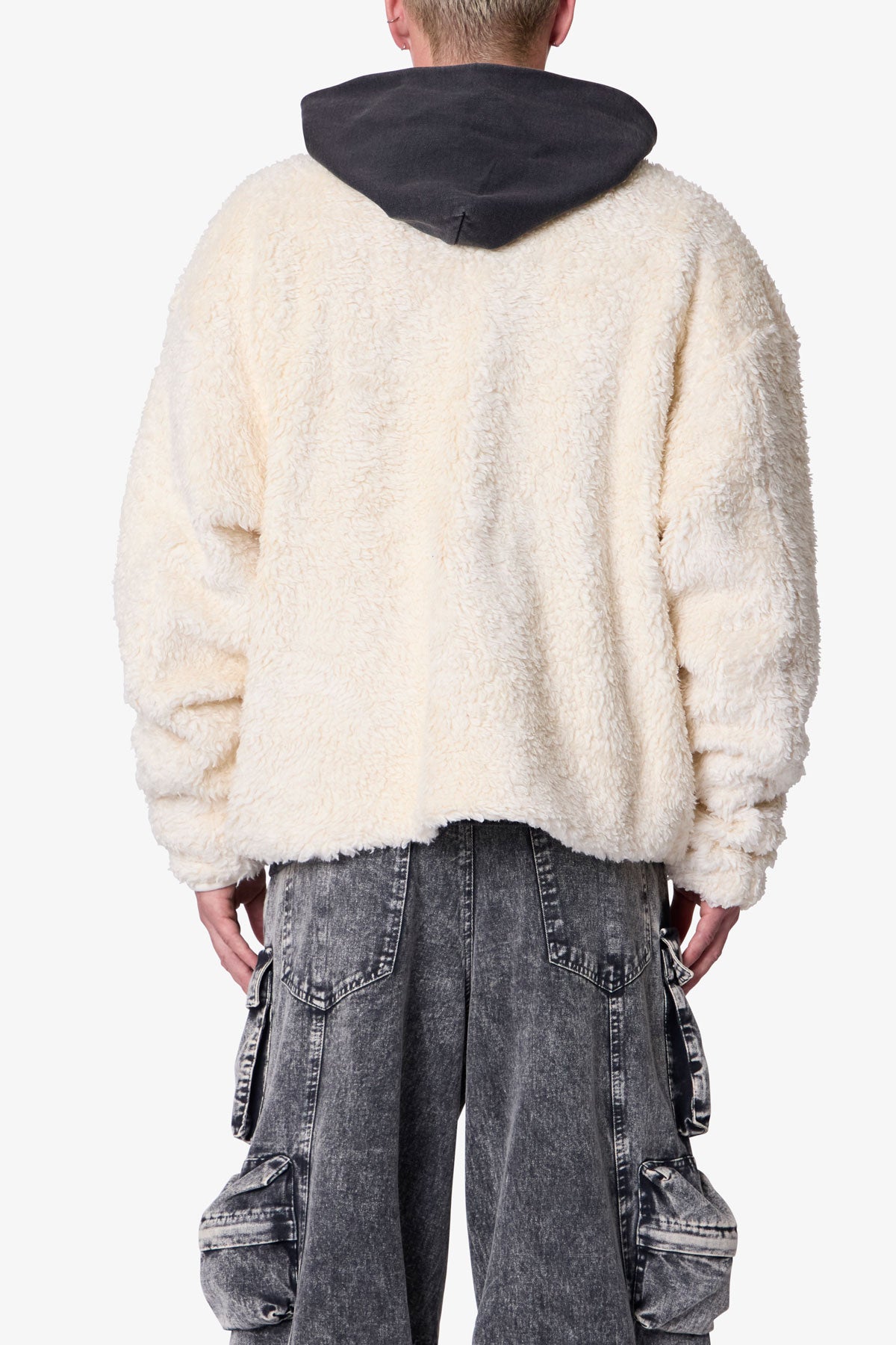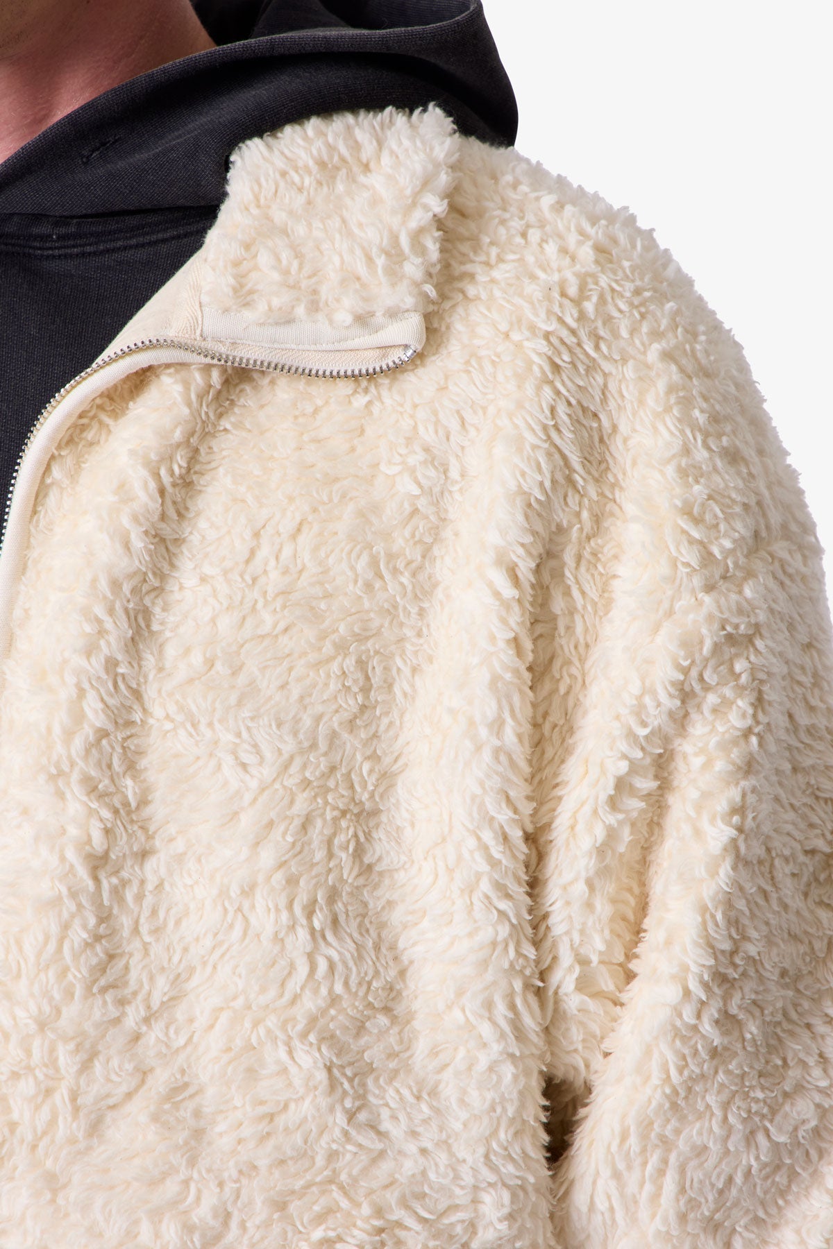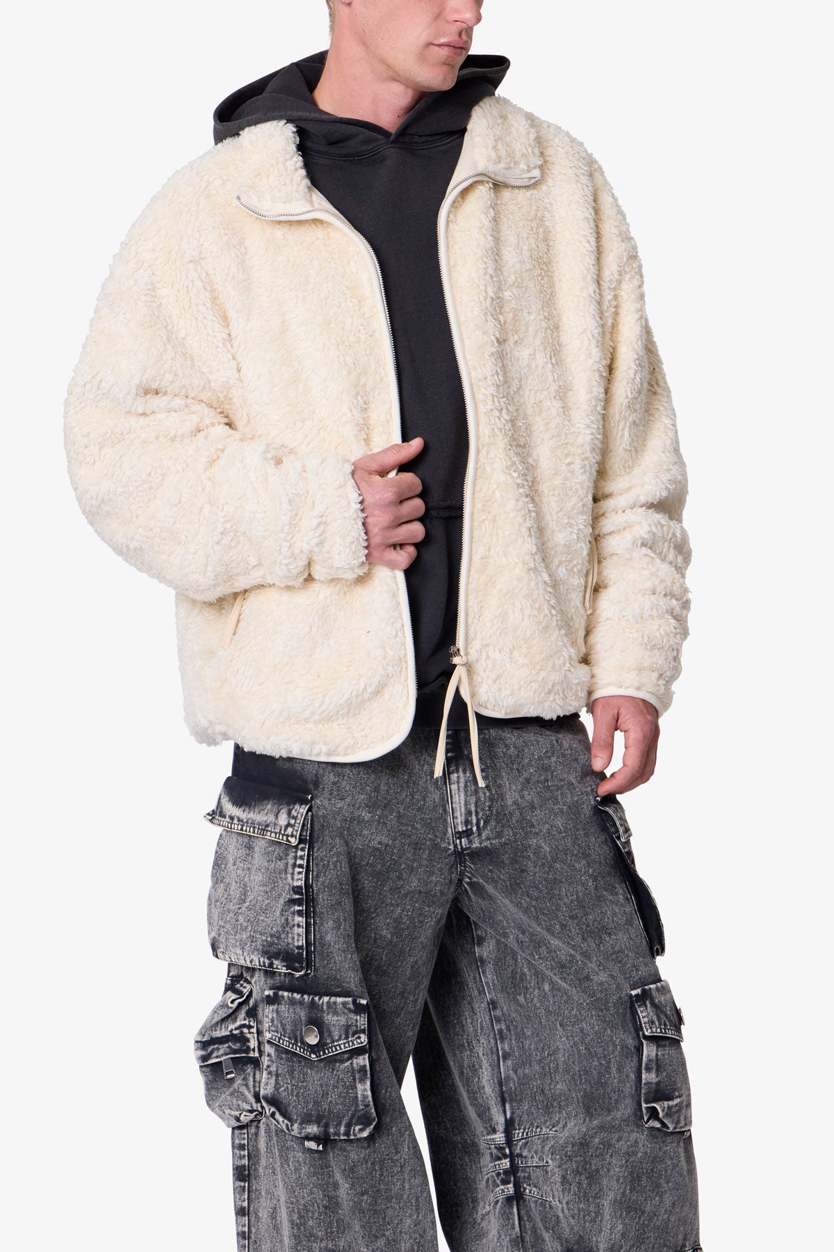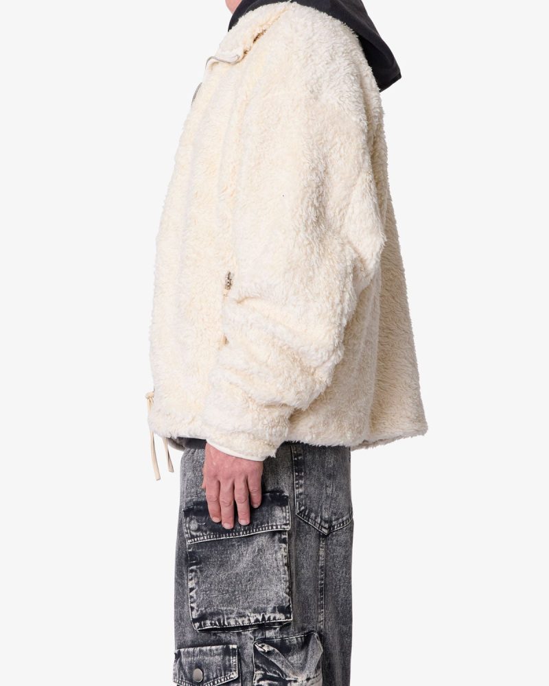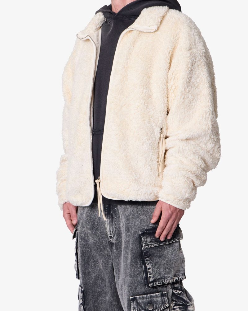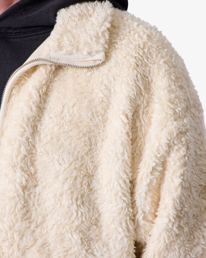 Constructed from 100% polyester faux sherpa with a garment wash finish. the Leather Trim Sherpa Zip Up Jacket is designed in a relaxed fit with dropped shoulders and a stand collar. Tonal faux leather trim details accent the silhouette. which is completed with front side zip pockets and a full-length zip closure.