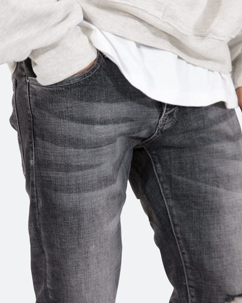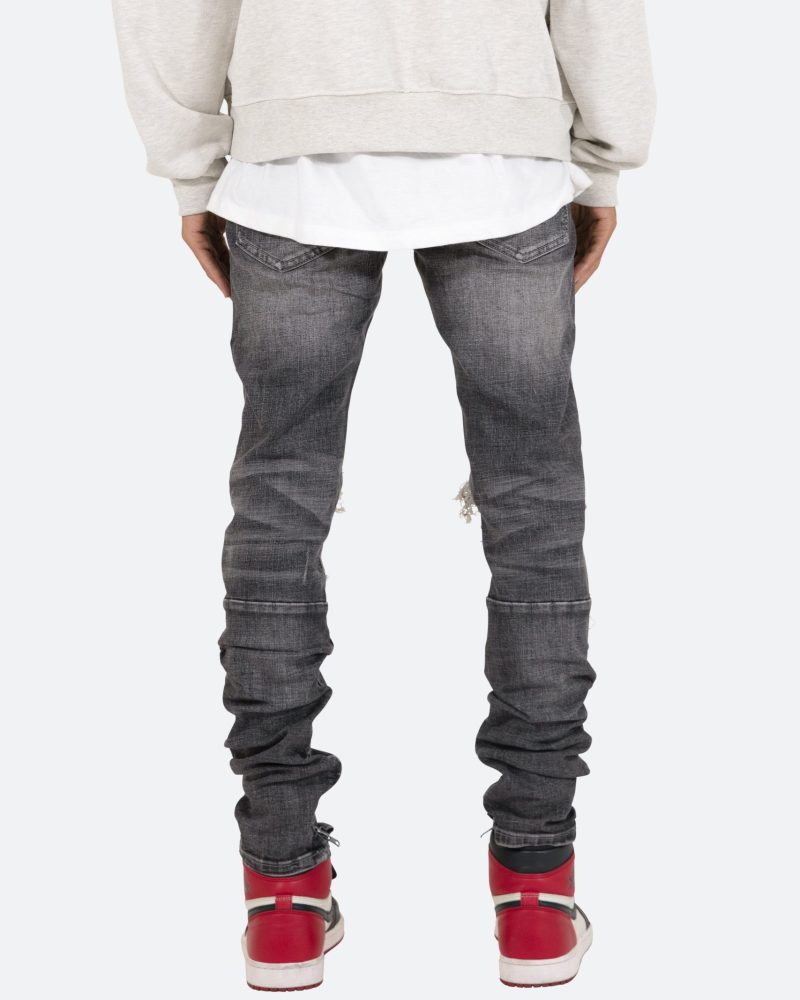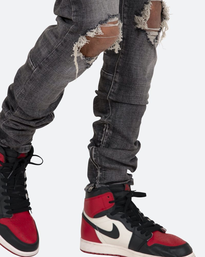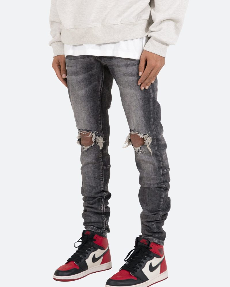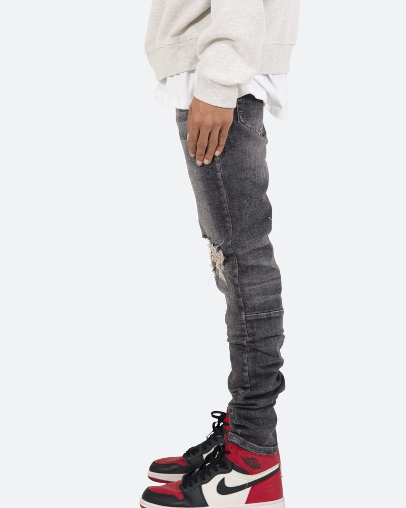 developed in los angeles. the grey m1 stretch denim is designed with a relaxed fit through the thigh that tapers from the knee to the ankle. featuring distress details at the knee and thigh. finishing off with a 10 concealed zipper on the inseam for a carefully optimized fit.