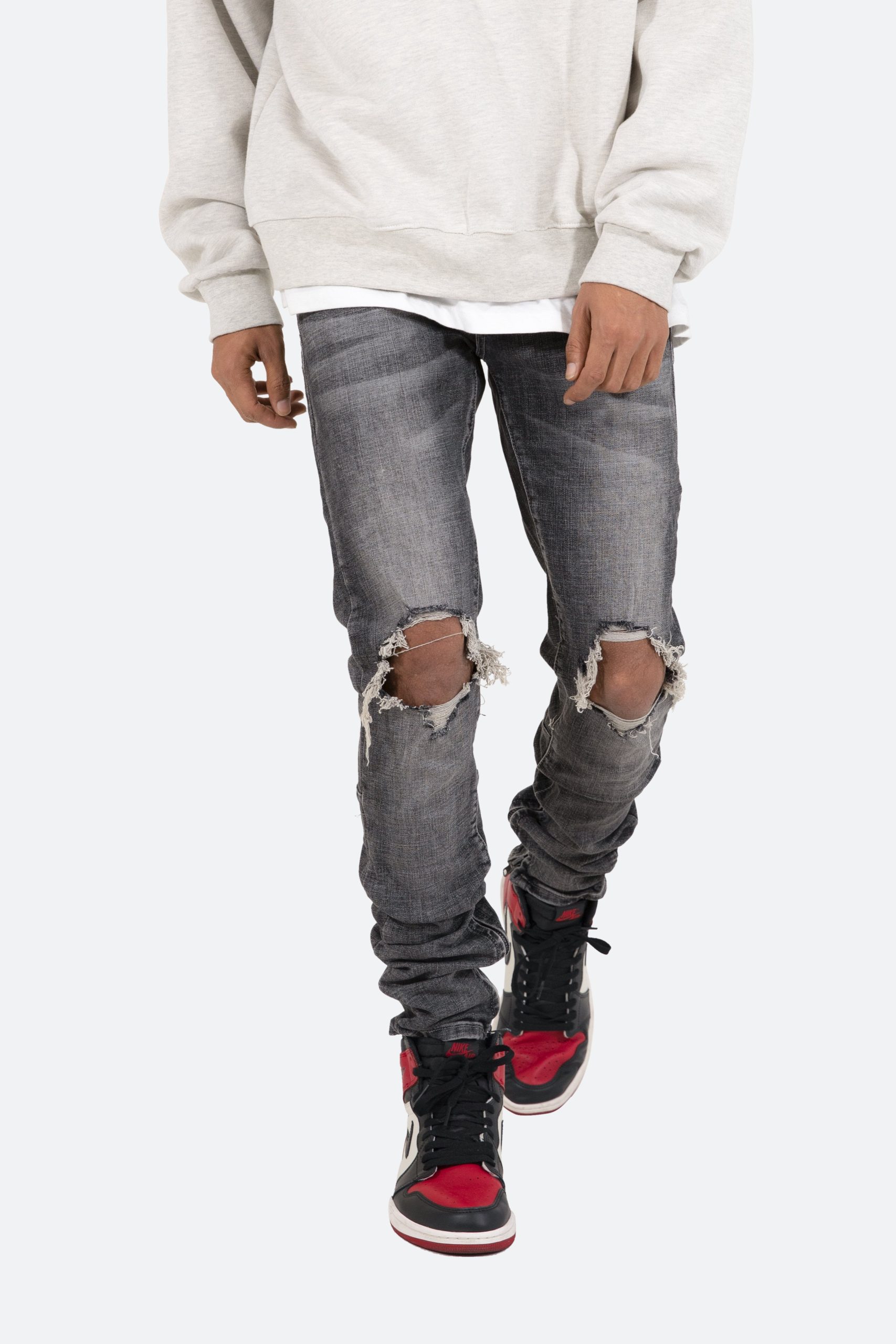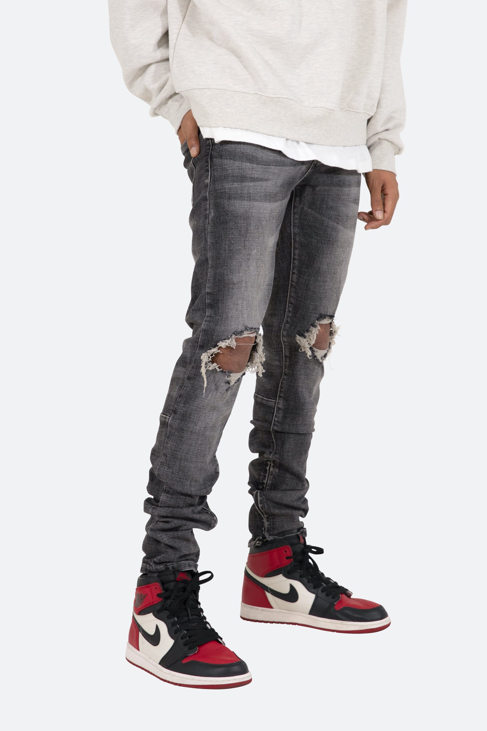 developed in los angeles. the grey m1 stretch denim is designed with a relaxed fit through the thigh that tapers from the knee to the ankle. featuring distress details at the knee and thigh. finishing off with a 10 concealed zipper on the inseam for a carefully optimized fit.