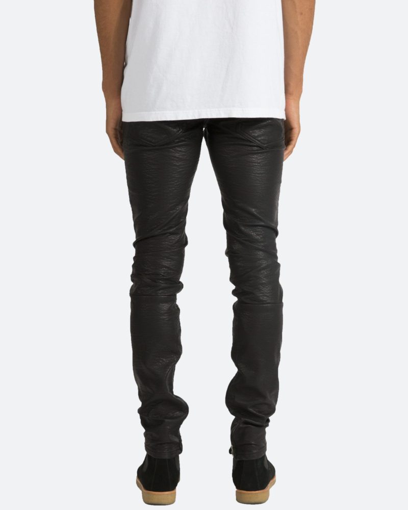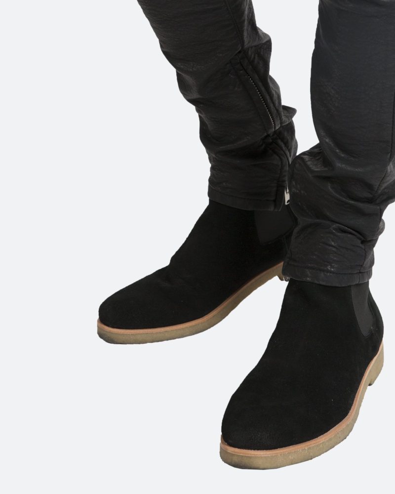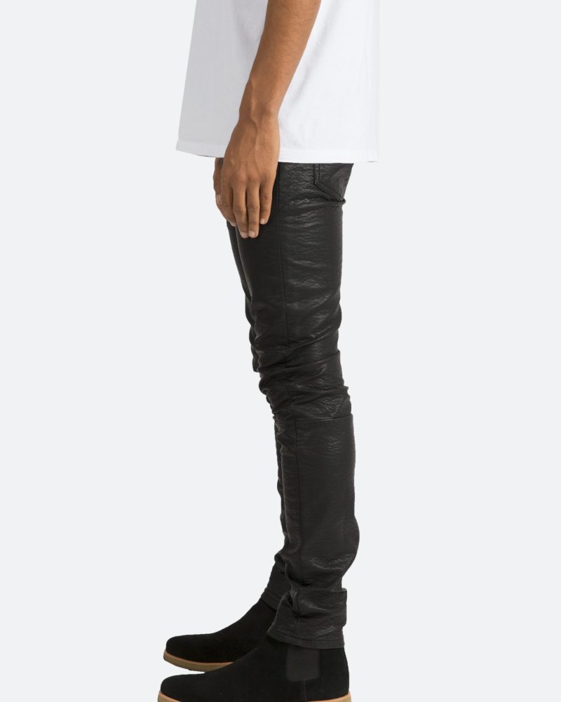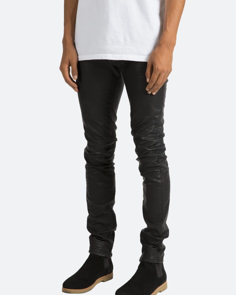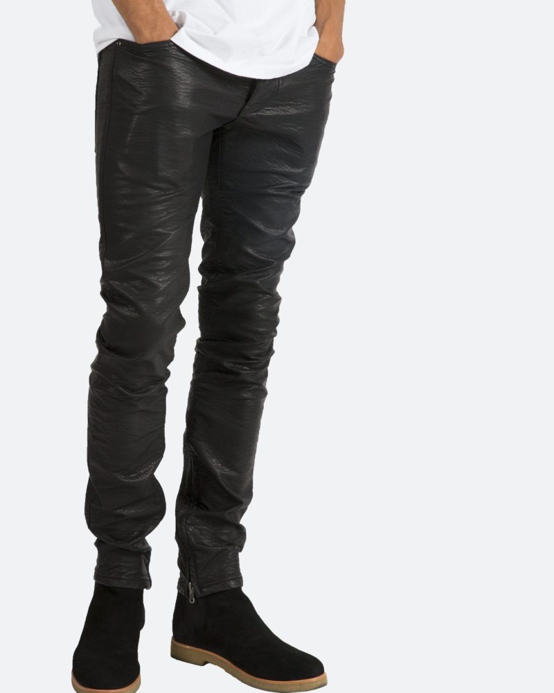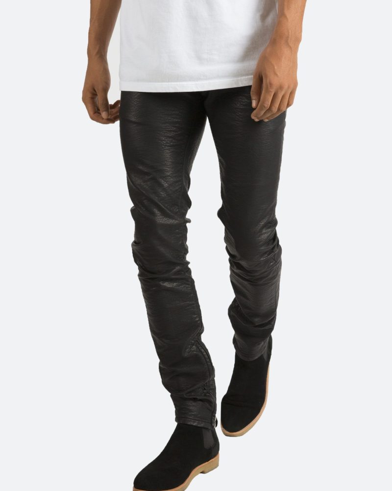 the black M134 Leather Pants are designed in poly-leather. with a relaxed fit through the thigh that tapers from the knee to the ankle. finishing off with a 10 concealed zipper on the inseam and a rear calf panel for a carefully optimized fit.