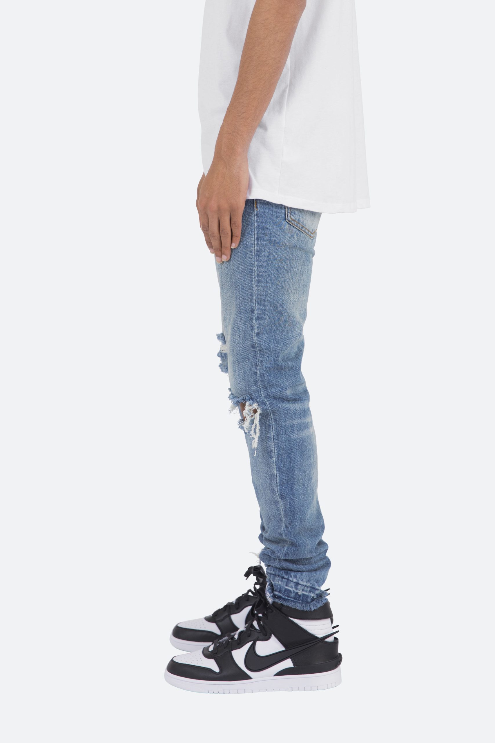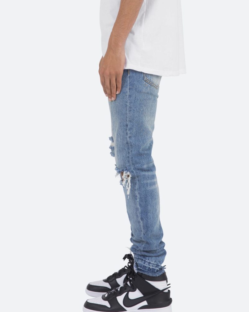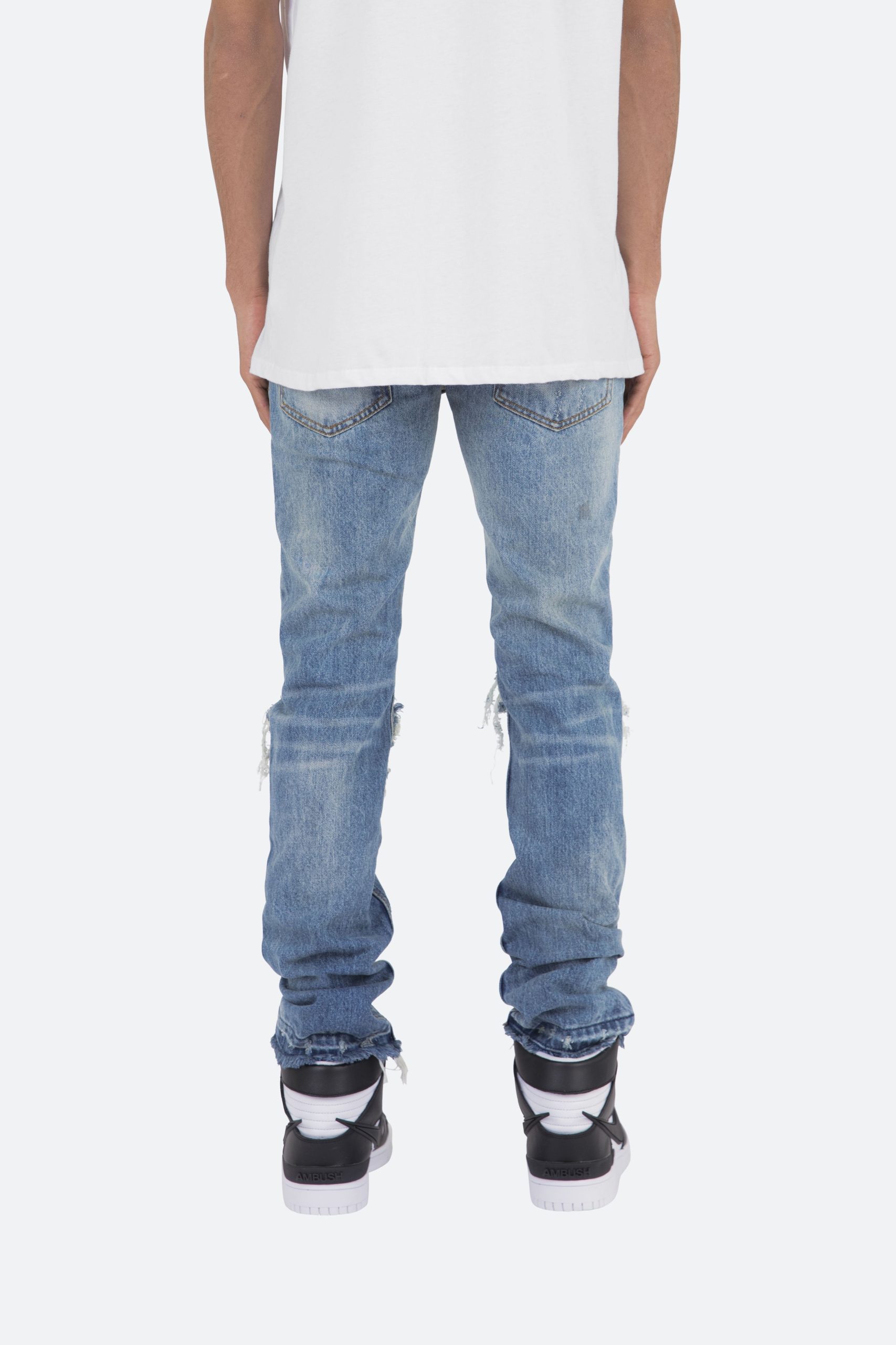 the M345 Denim is part of our new M300 line of zipperless M Denim. The M345 Denim features a relaxed fit through the thigh that tapers from the knee to the ankle. distressed details at the knees and finishes off with a traditional zipperless inseam.